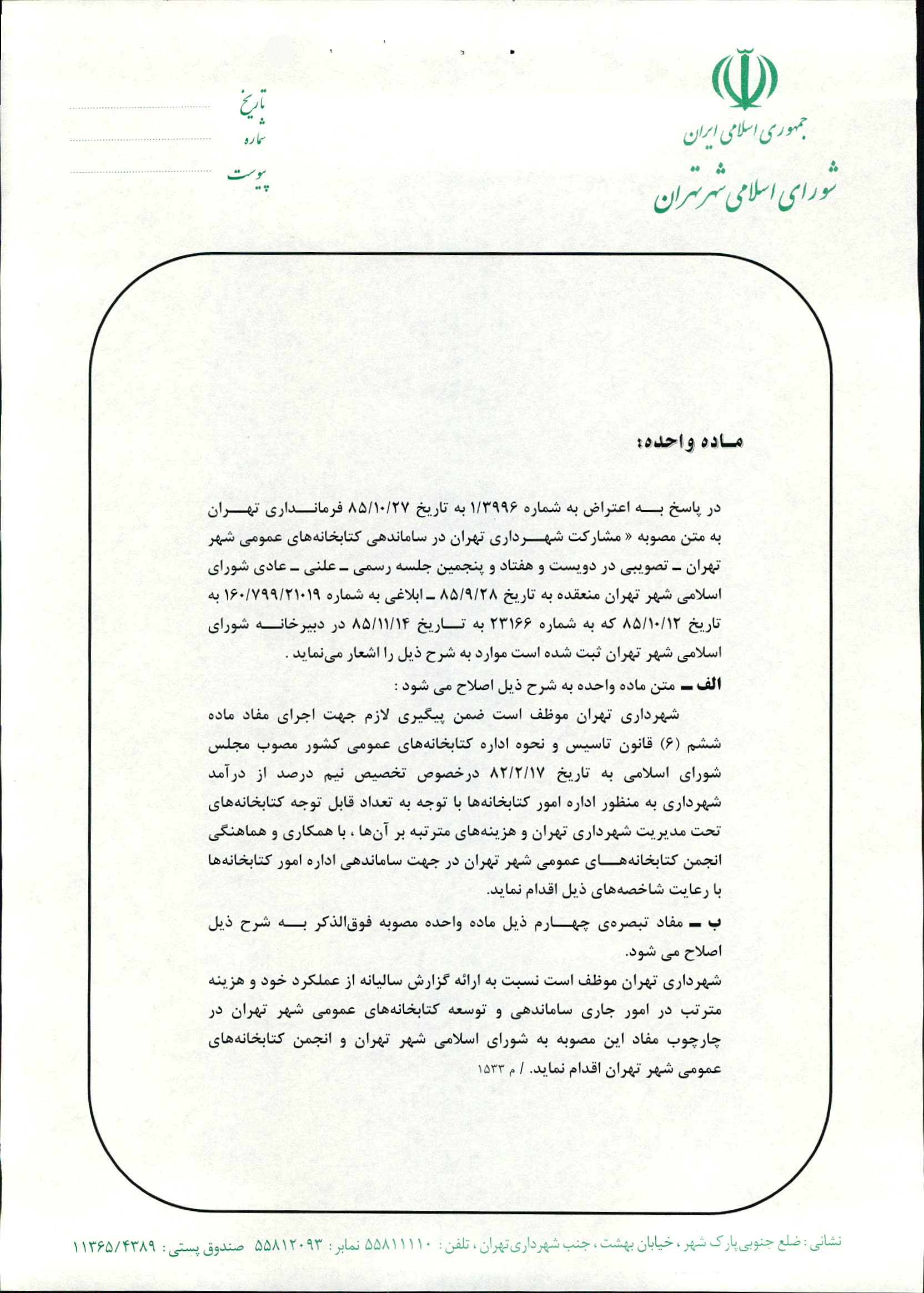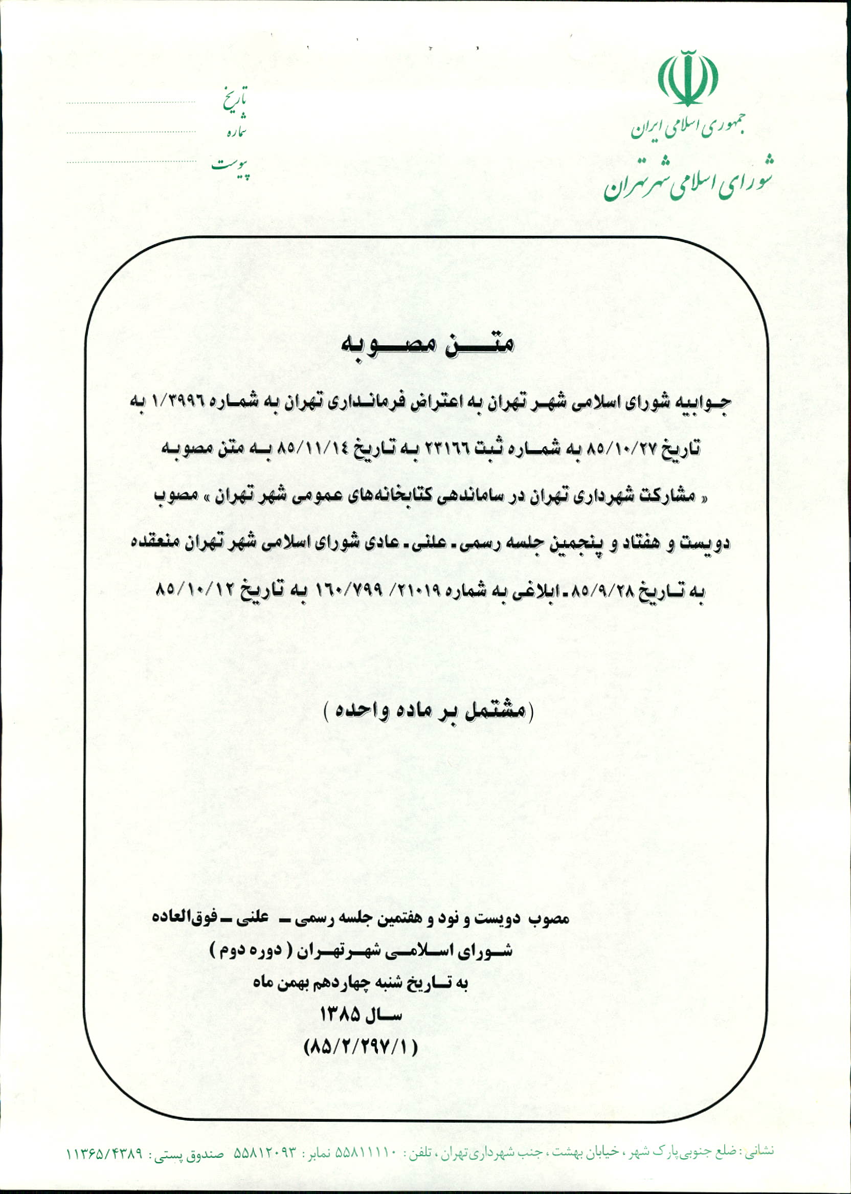 جوابيه شوراي اسلامي شهر تهران به اعتراض فرمانداري تهران به شماره 1/3996 به تاريخ 85/10/27 به شماره ثبت 23166 به تاريخ 85/11/14 به متن مصوبه «مشاركت شهرداري تهران در ساماندهي كتابخانههاي عمومي شهر تهران» مصوب دويست و هفتاد و پنجمين جلسه-رسمي-علني-عادي شوراي اسلامي شهر تهران منعقده به تاريخ 85/9/28 ابلاغي به شماره 160/799/21019 به تاريخ 85/10/12