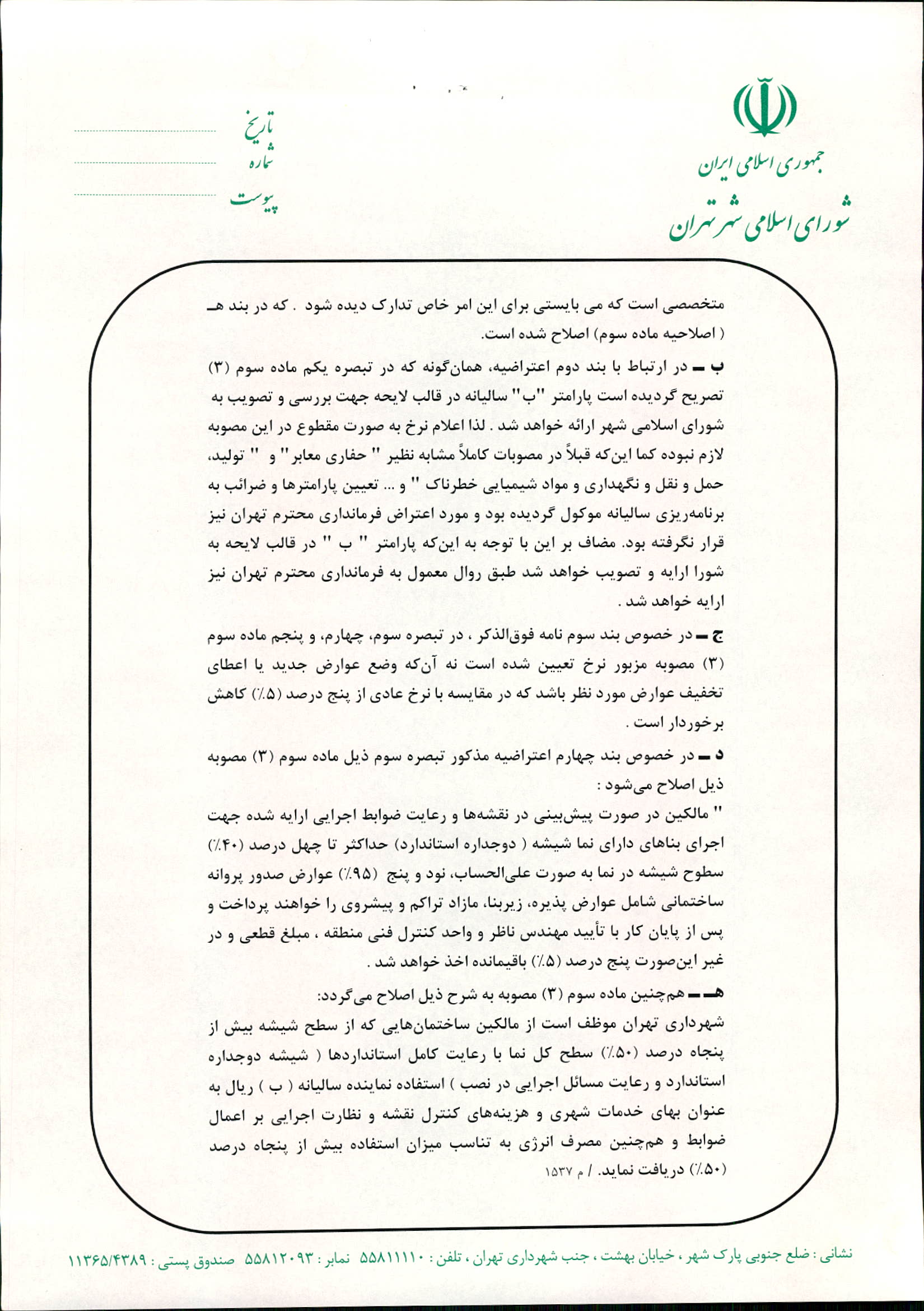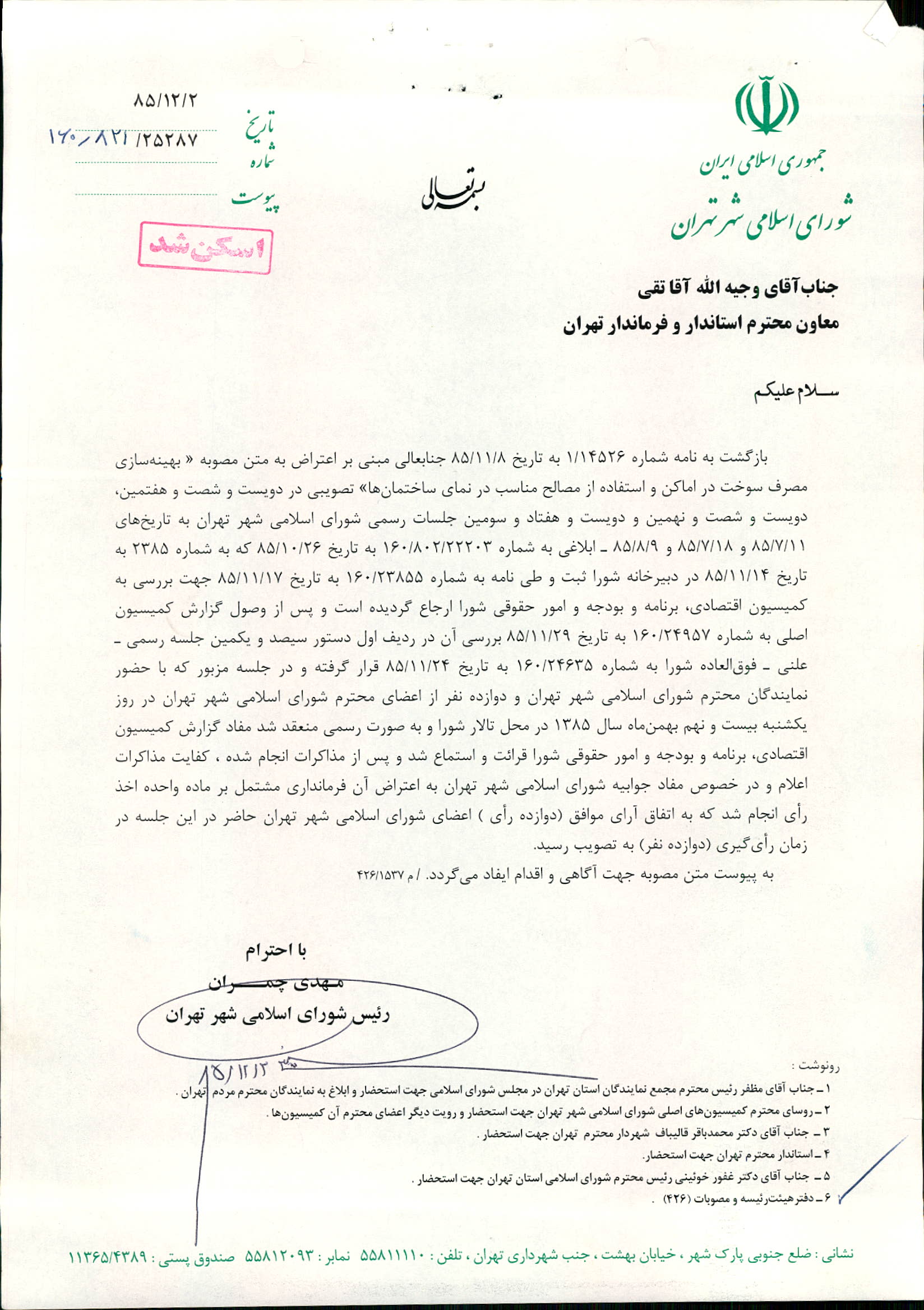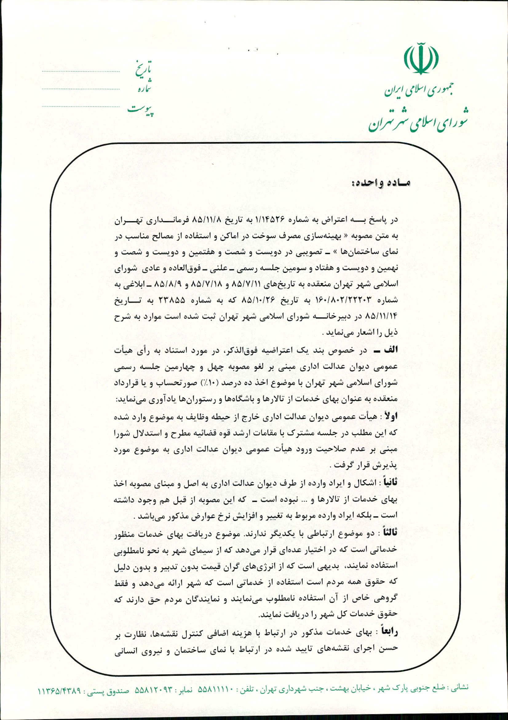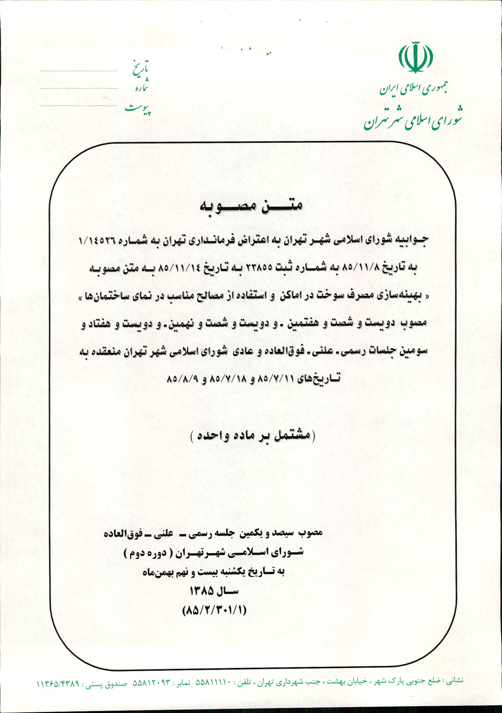 جوابيه شوراي اسلامي شهر تهران به اعتراض فرمانداري تهران به شماره 1/14526 به تاريخ 85/11/8 به شماره ثبت 23855 به تاريخ 85/11/14 به متن مصوبه «بهينهسازي مصرف سوخت در اماكن و استفاده از مصالح مناسب در نماي ساختمانها»-مصوب دويست و شصت و هفتمين و دويست و شصت و نهمين و دويست و هفتاد و سومين جلسه رسمي- علني-فوقالعاده شوراي اسلامي شهر تهران منعقده به تاريخ هاي 85/7/11 و 85/7/18 و 85/8/9