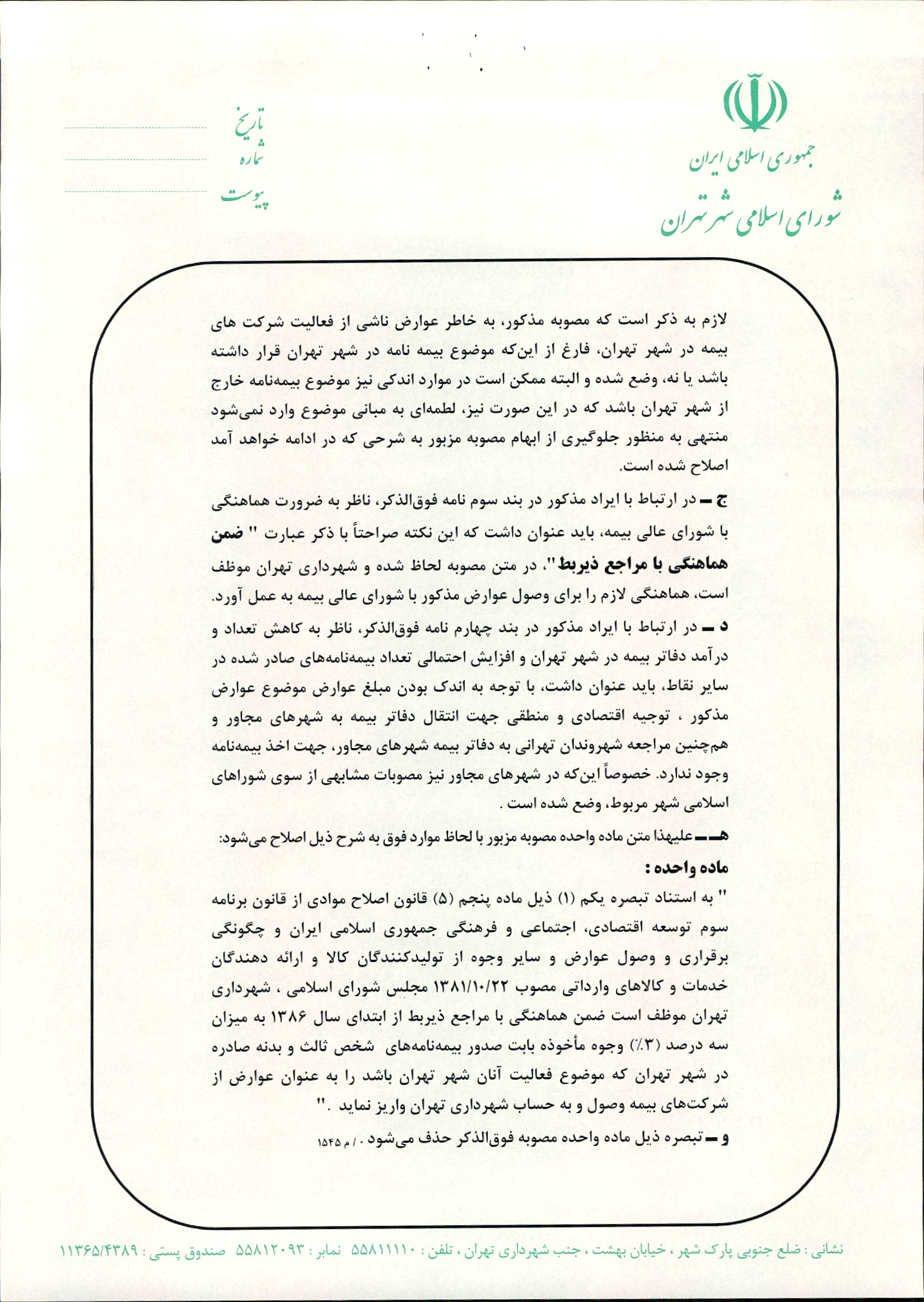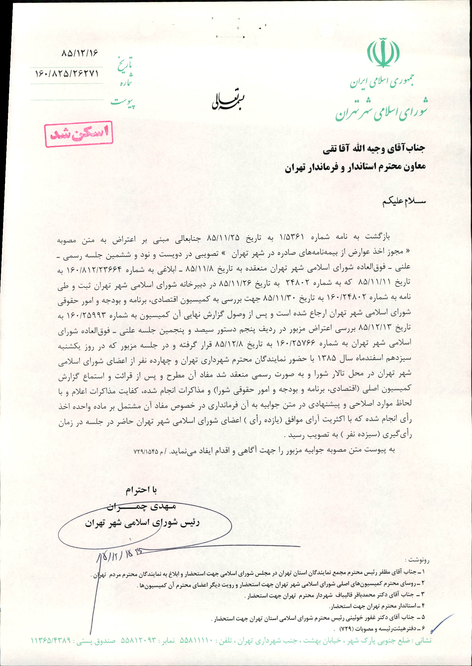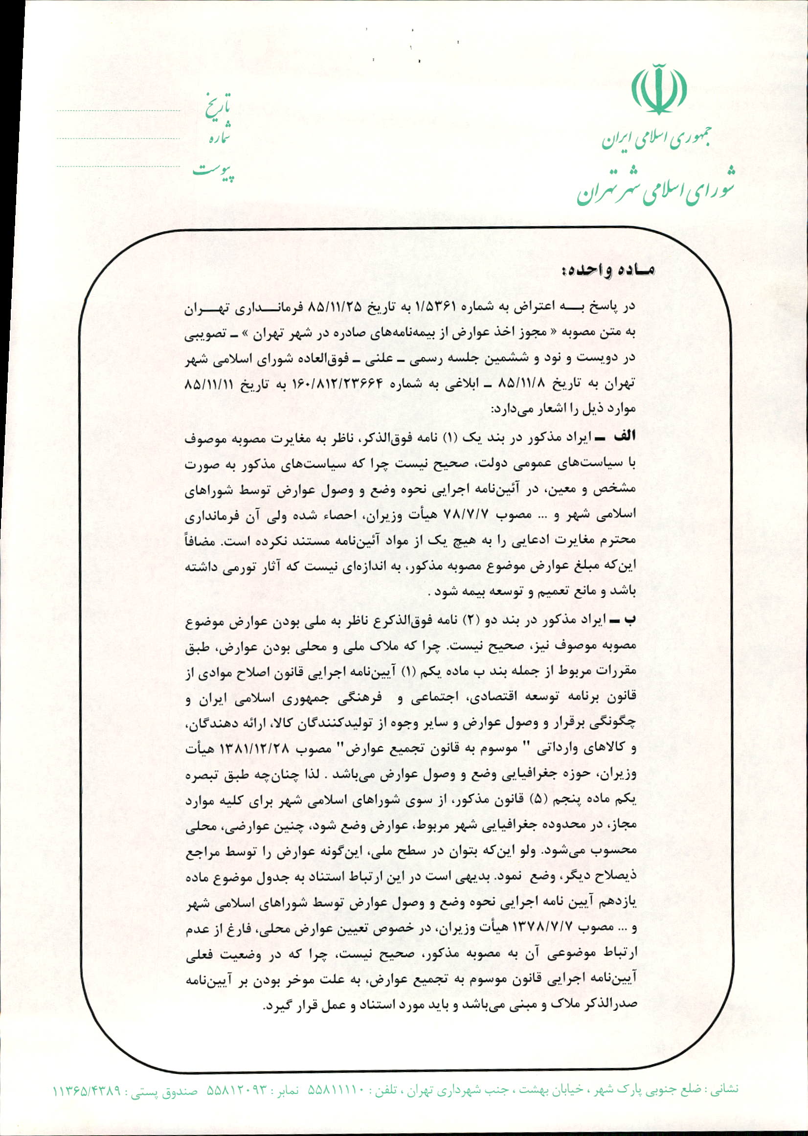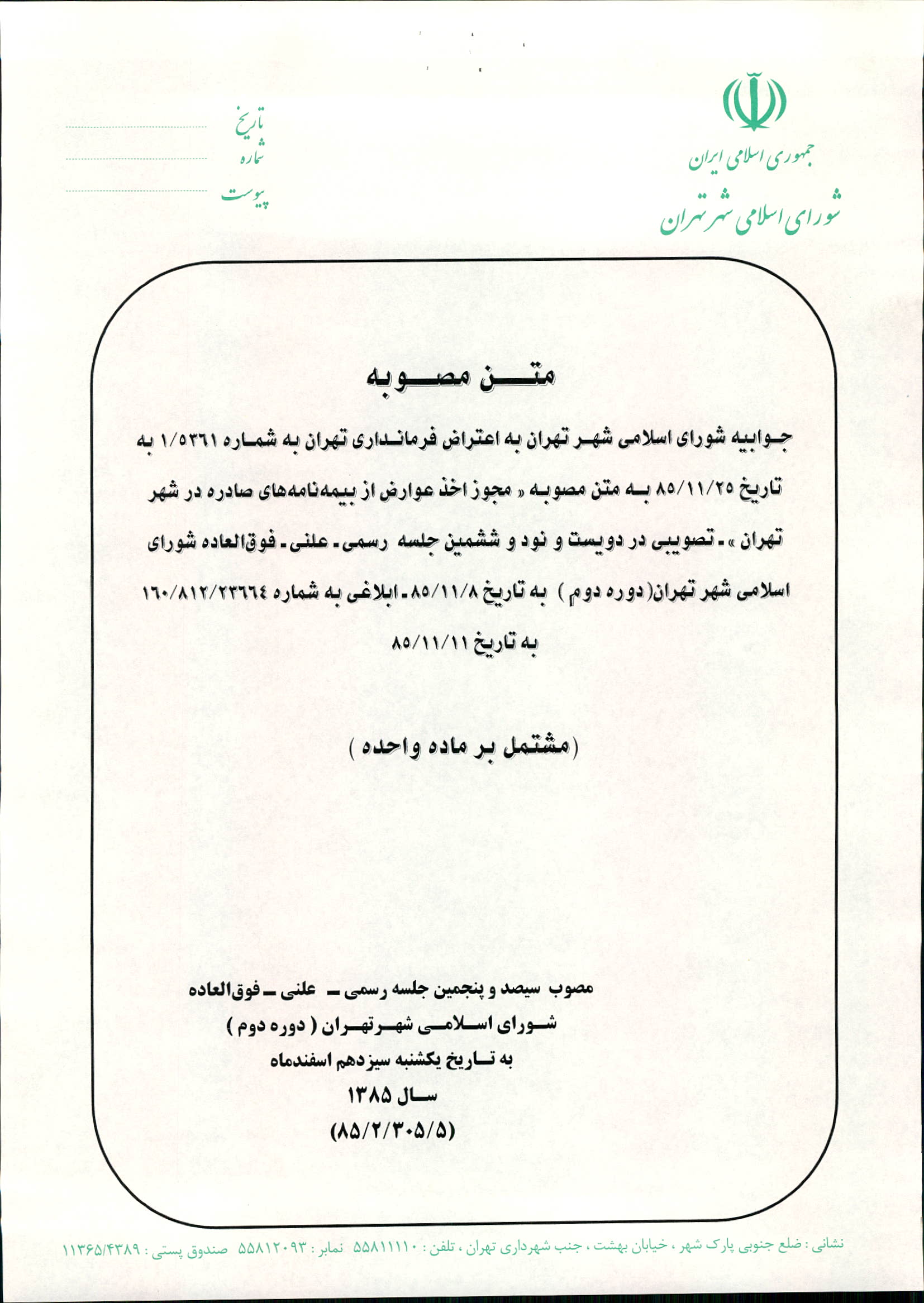 جوابيه شوراي اسلامي شهر تهران به اعتراض فرمانداري تهران به شماره 1/5361 به تاريخ 85/11/25 به متن مصوبه «مجوز اخذ عوارض از بيمهنامههاي صادره در شهر تهران»-تصويبي در دويست و نود و ششمين جلسه رسمي- علني-فوقالعاده شوراي اسلامي شهر تهران (دور دوم) به تاريخ 85/11/8 -ابلاغي به شماره 160/812/23664 به تاريخ 85/11/11