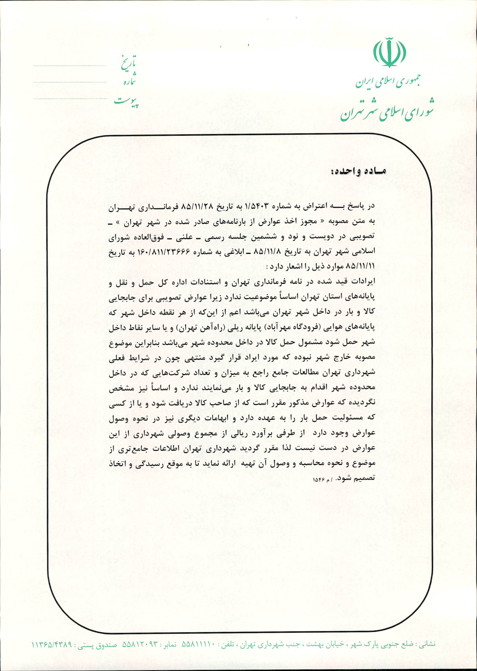 جوابيه شوراي اسلامي شهر تهران به اعتراض فرمانداري تهران به شماره 1/5403 به تاريخ 85/11/28 به متن مصوبه «مجوز اخذ عوارض از بارنامههاي صادر شده در شهر تهران» -تصويبي در دويست و نود و ششمين جلسه رسمي- علني-فوقالعاده شوراي اسلامي شهر تهران (دور دوم) به تاريخ 85/11/8 ابلاغي به شماره 160/811/23666 به تاريخ 85/11/11