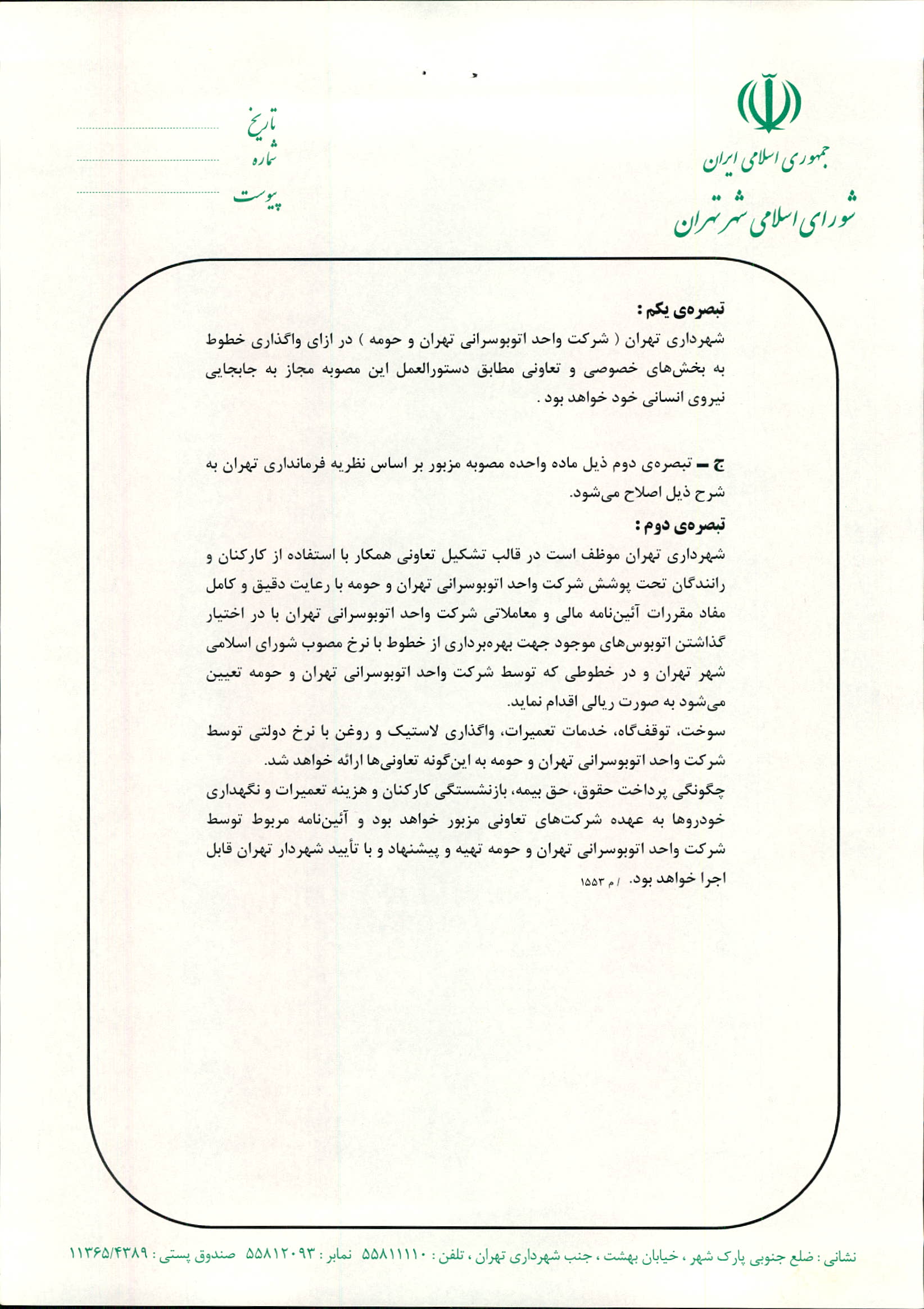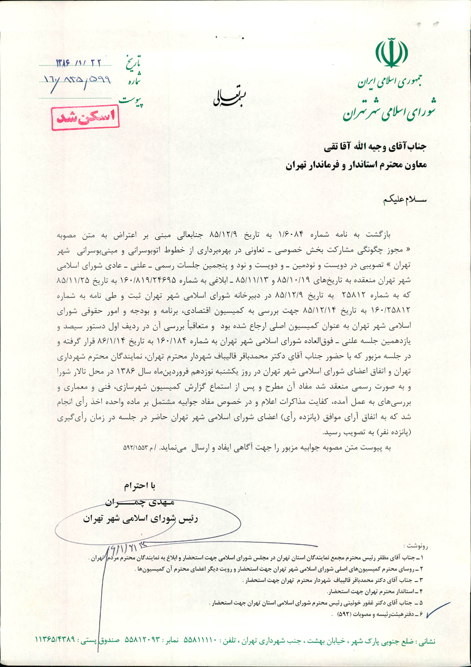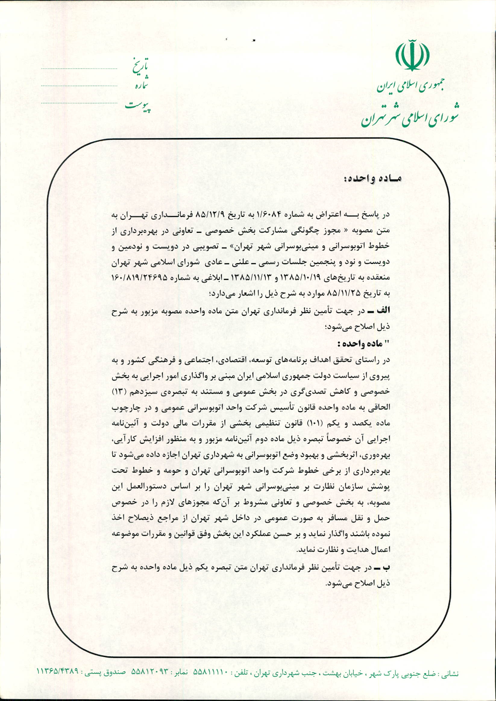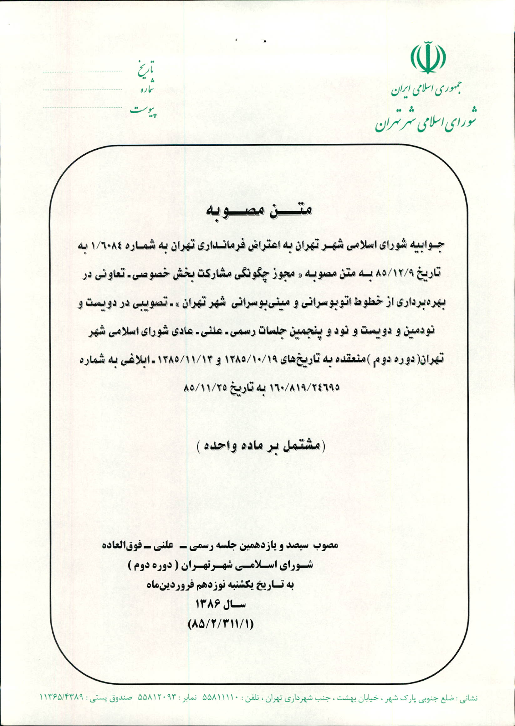 جوابيه شوراي اسلامي شهر تهران به اعتراض فرمانداري به شماره 1/6084 به تاريخ 85/12/9 به متن مصوبه «مجوز چگونگي مشاركت بخش خصوصي ـ تعاوني در بهرهبرداري از خطوط اتوبوسراني و مينيبوسراني شهر تهران» - تصويبي در دويست و نودمين و دويست و نود و پنجمين جلسات رسمي ـ علني ـ عادي شوراي اسلامي شهر تهران منعقده به تاريخهاي 1385/10/19 و 1385/11/3 ـ ابلاغي به شماره 160/819/24695 به تاريخ 85/11/25