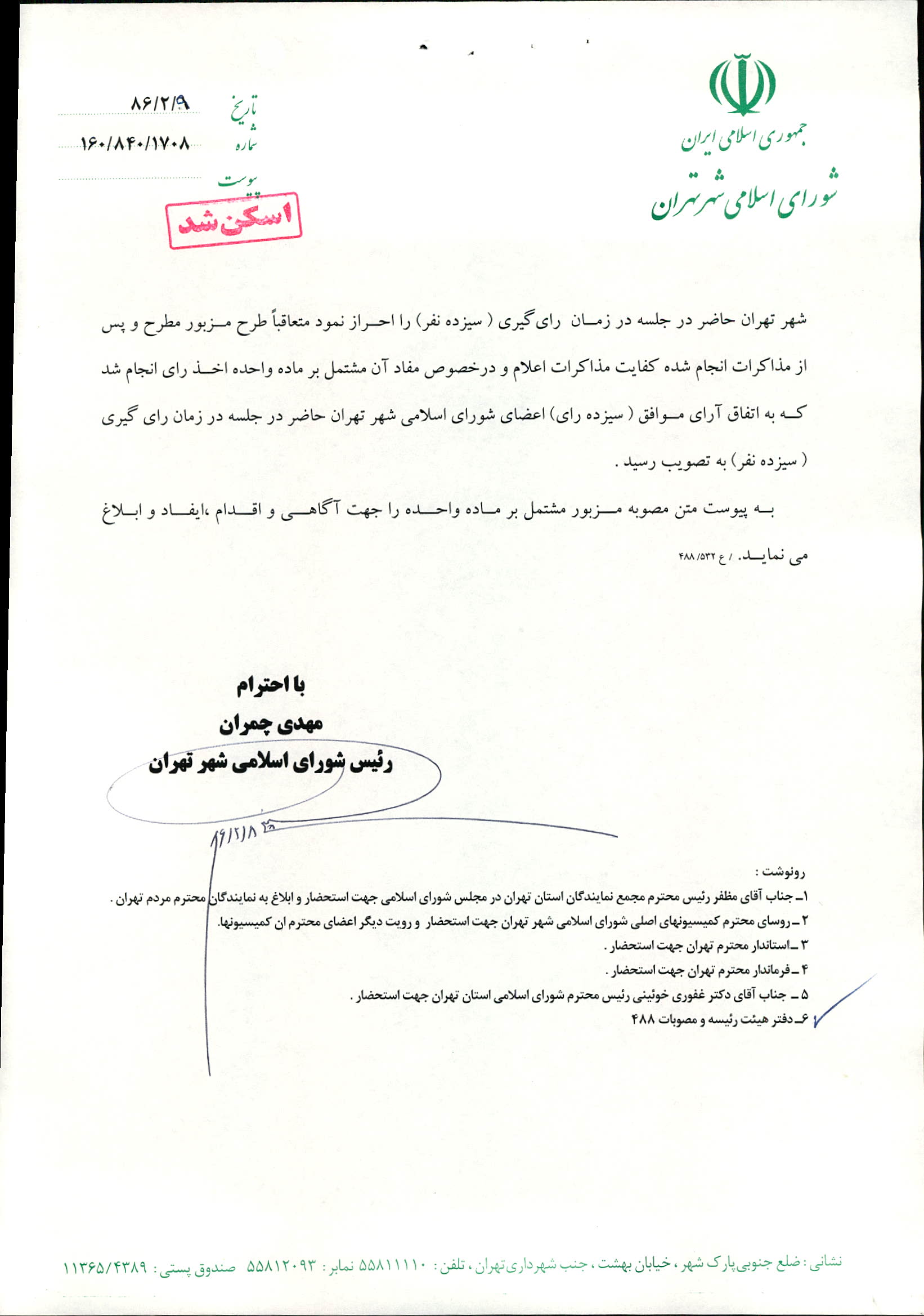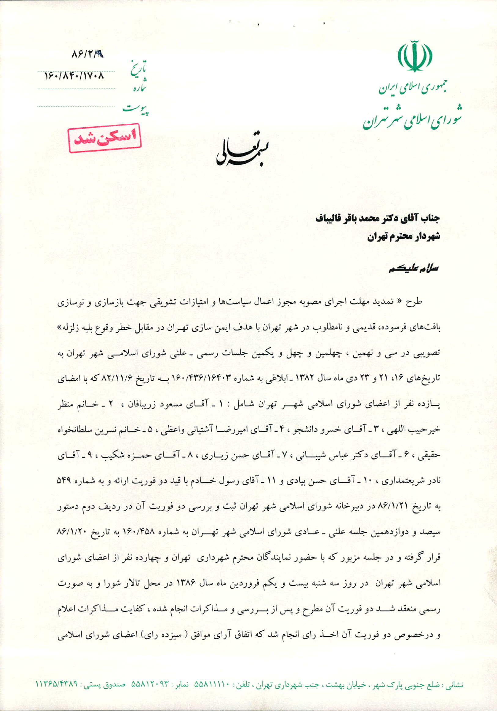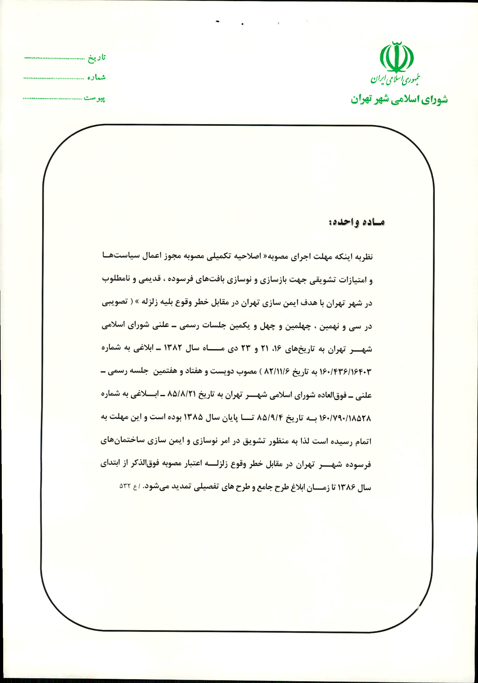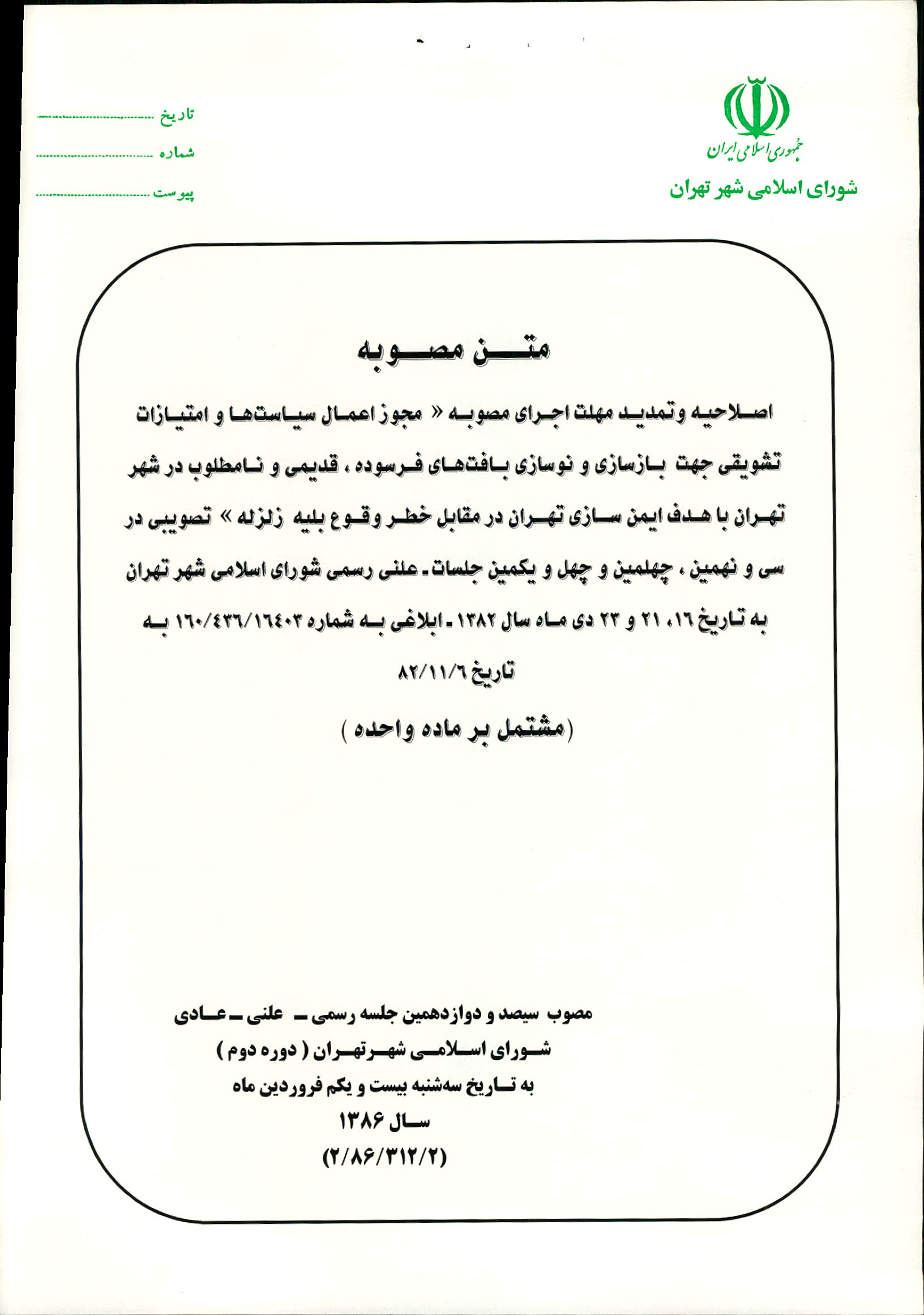 اصلاحيه و تمديد مهلت اجراي مصوبه «مجوز اعمال سياستها و امتيازات تشويقي جهت بازسازي و نوسازي بافتهاي فرسوده، قديمي و نامطلوب در شهر تهران با هدف ايمنسازي تهران در مقابل خطر وقوع بليه زلزله» تصويبي در سي و نهمين، چهلمين وچهل و يكمين جلسات-علني- رسمي شوراي اسلامي شهرداري تهران به تاريخ 23،21،16 ديماه سال 1382-ابلاغي به شماره 160/436/16403 به تاريخ 82/11/6