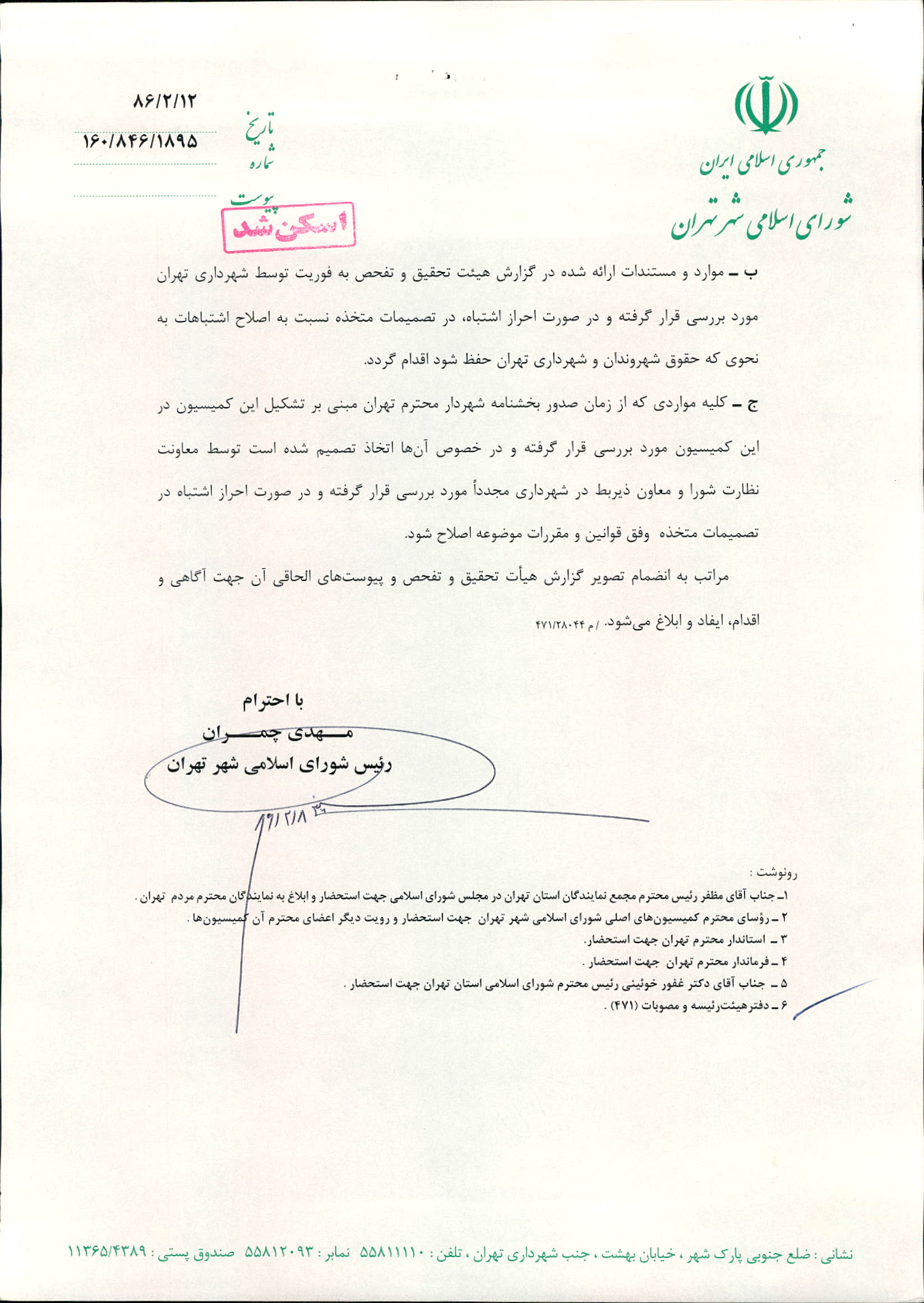 مجوز تحقيق و تفحص در خصوص چگونگي تشكيل كميسيون ويژه و عملكرد آن در شهرداري تهران