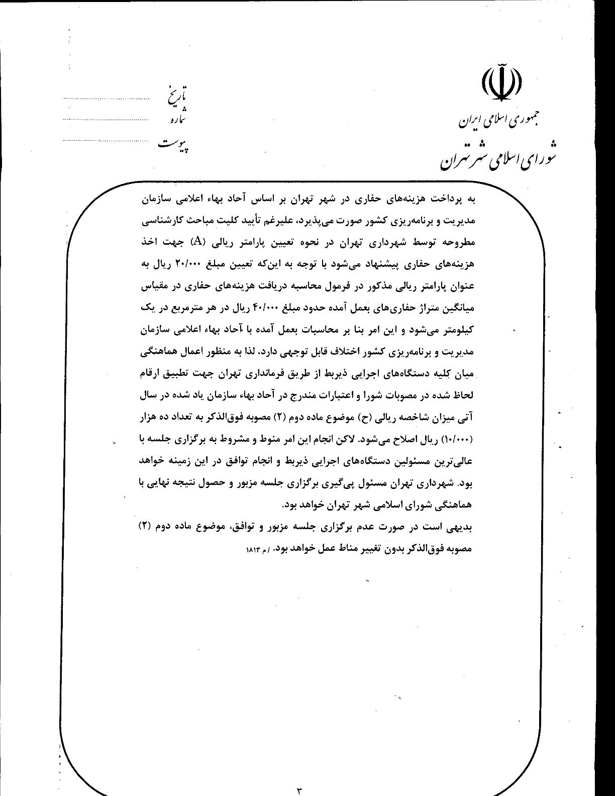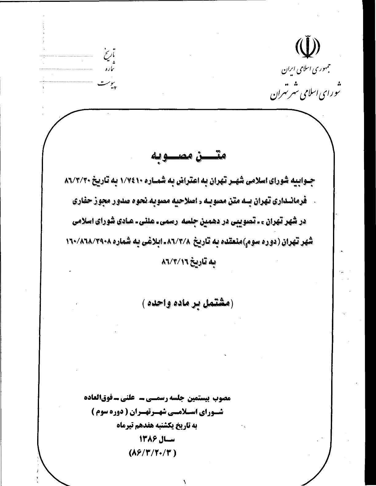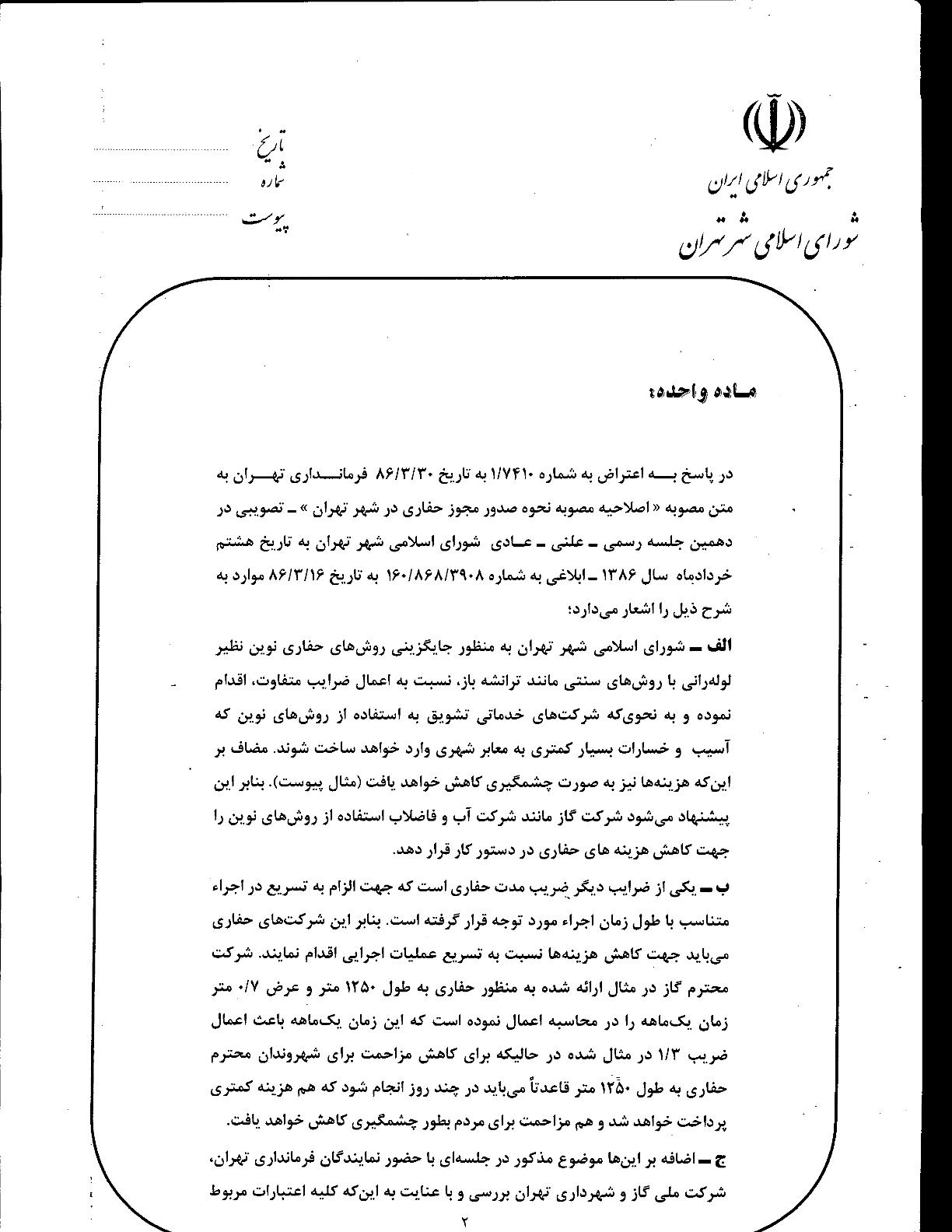 جوابيه شوراي اسلامي شهر تهران به اعتراض به شماره 1/7410 به تاريخ 86/3/30 فرمانداري تهران به متن مصوبه «اصلاحيه مصوبه نحوه صدور مجوز حفاري در شهر تهران» ـ تصويبي در دهمين جلسه رسمي ـ علني ـ عادي شوراي اسلامي شهر تهران (دوره سوم) منعقده به تاريخ 86/3/8- ابلاغي به شماره 160/868/3908 به تاريخ 86/3/16