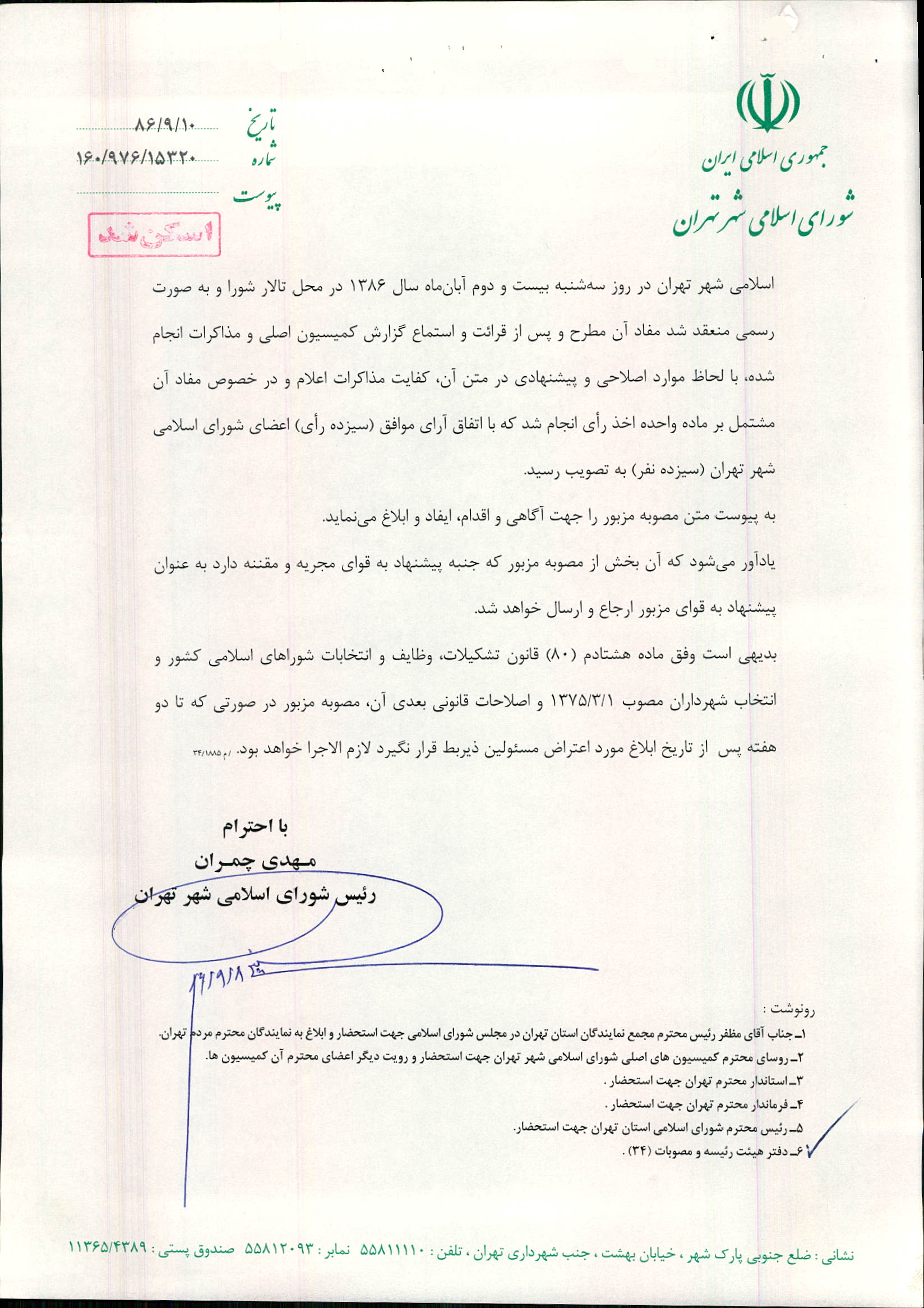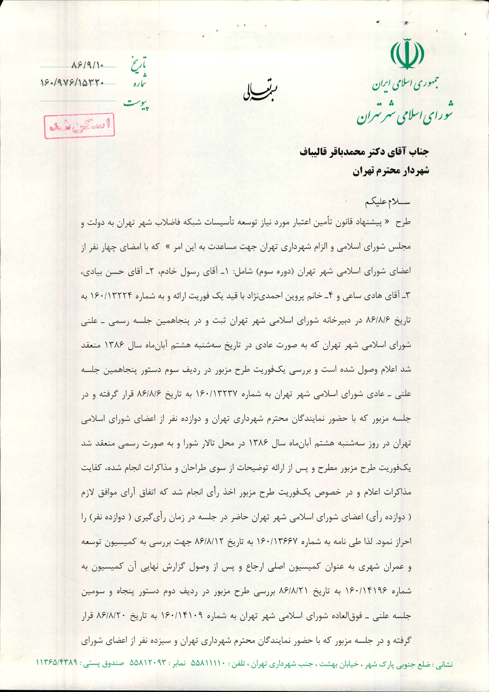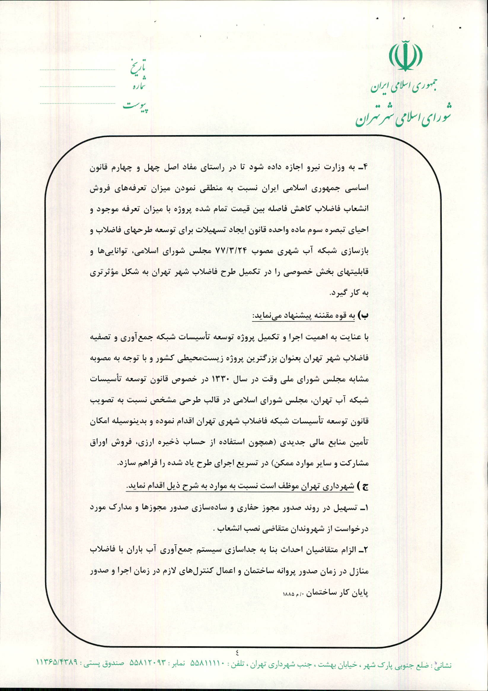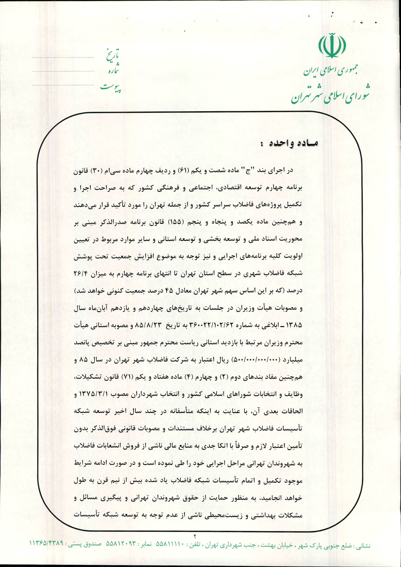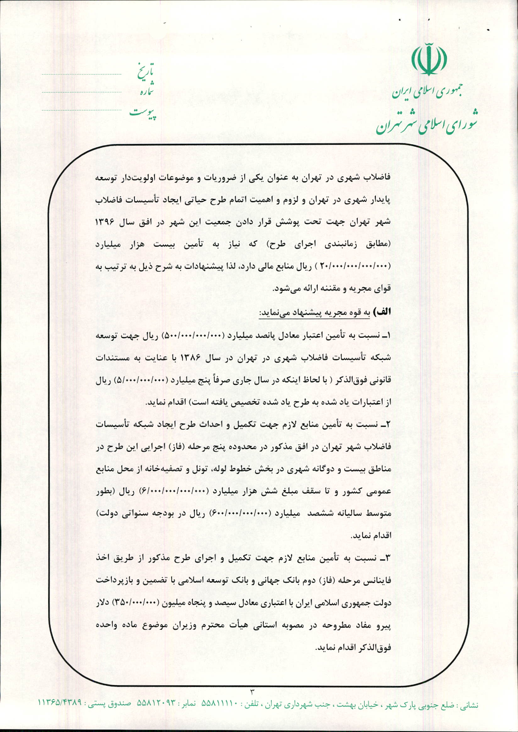پيشنهاد قانون تأمين اعتبار مورد نياز توسعه تأسيسات شبكه فاضلاب شهر تهران به دولت و مجلس شوراي اسلامي و الزام شهرداري تهران جهت مساعدت به اين امر
