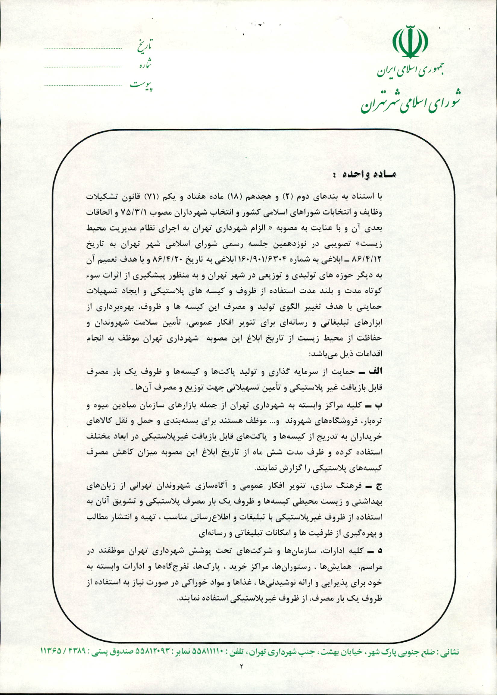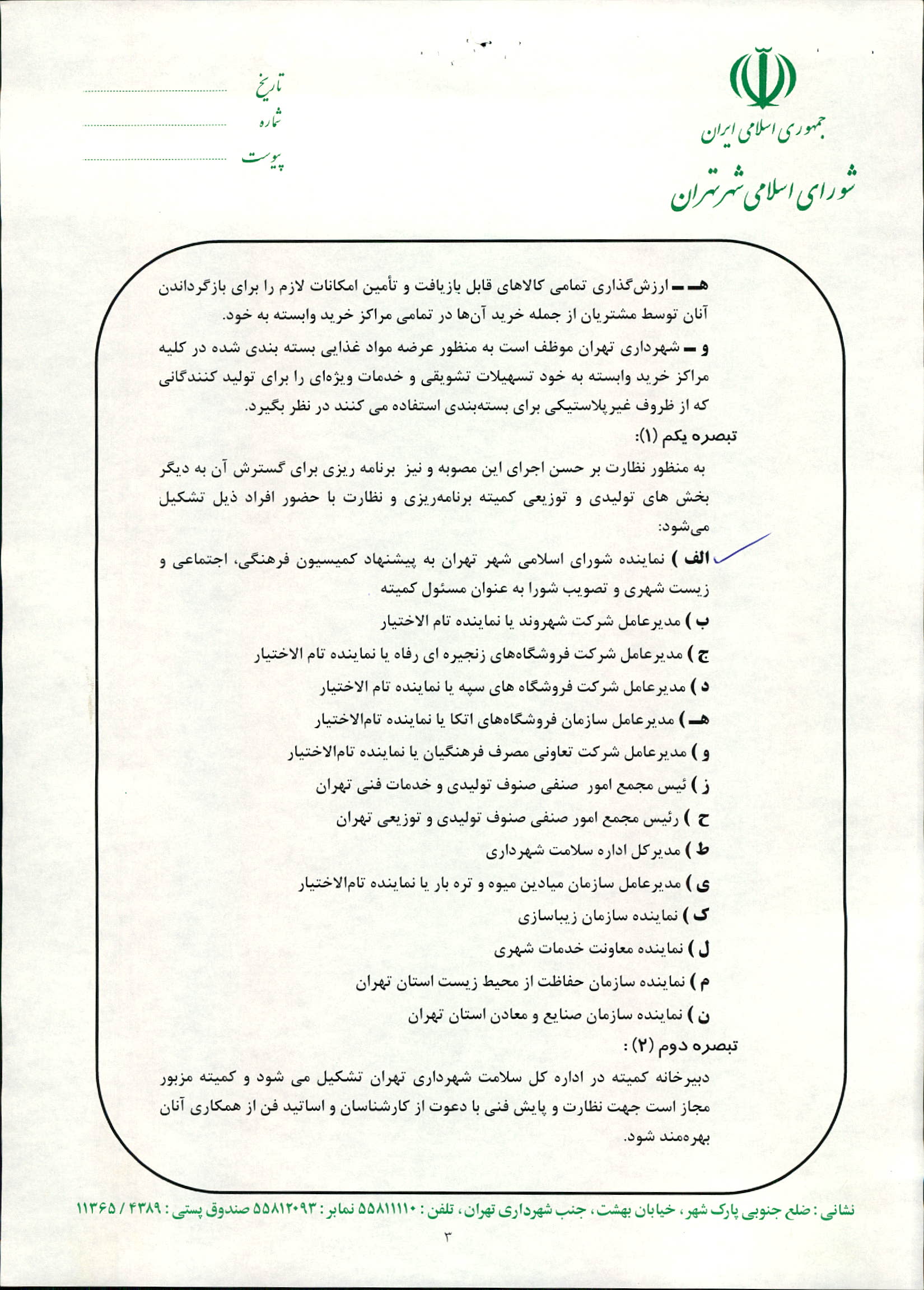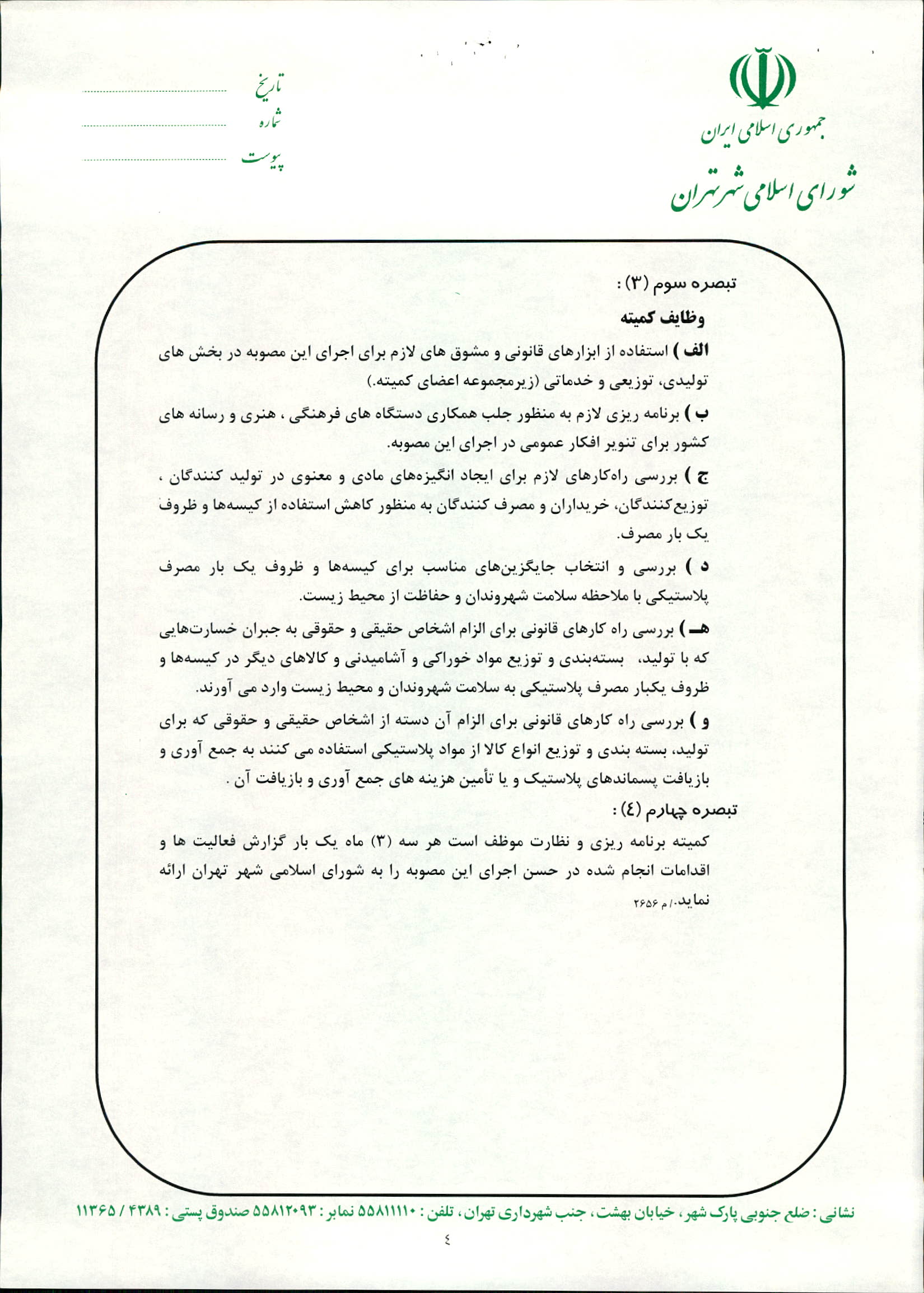 الزام شهرداري تهران به تغيير الگو و كاهش مصرف كيسهها، ظروف و محصولات يك بار مصرف پلاستيكي و جايگزين كردن مواد قابل بازيافت غيرپلاستيكي در كليه مراكز وابسته به شهرداري تهران