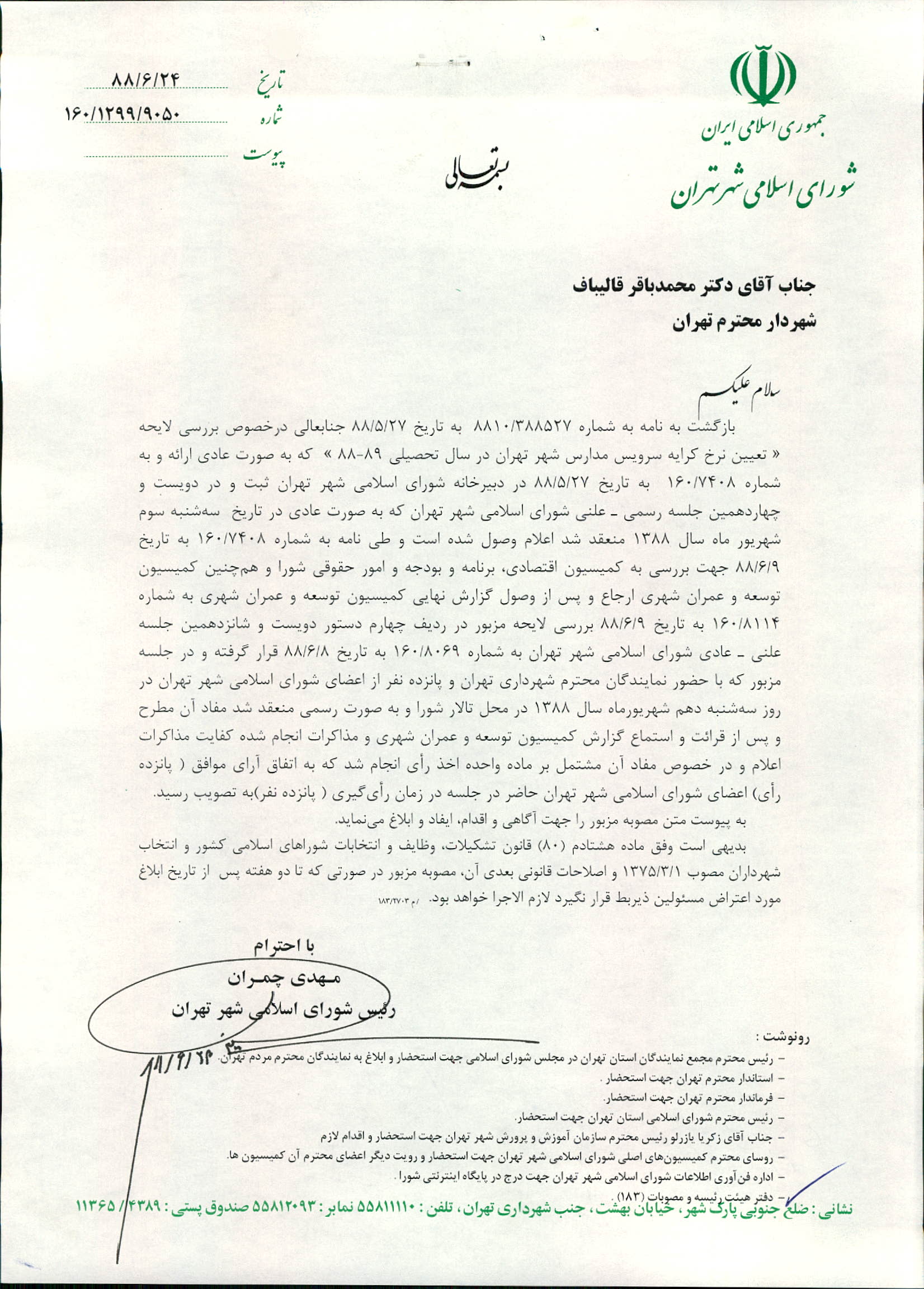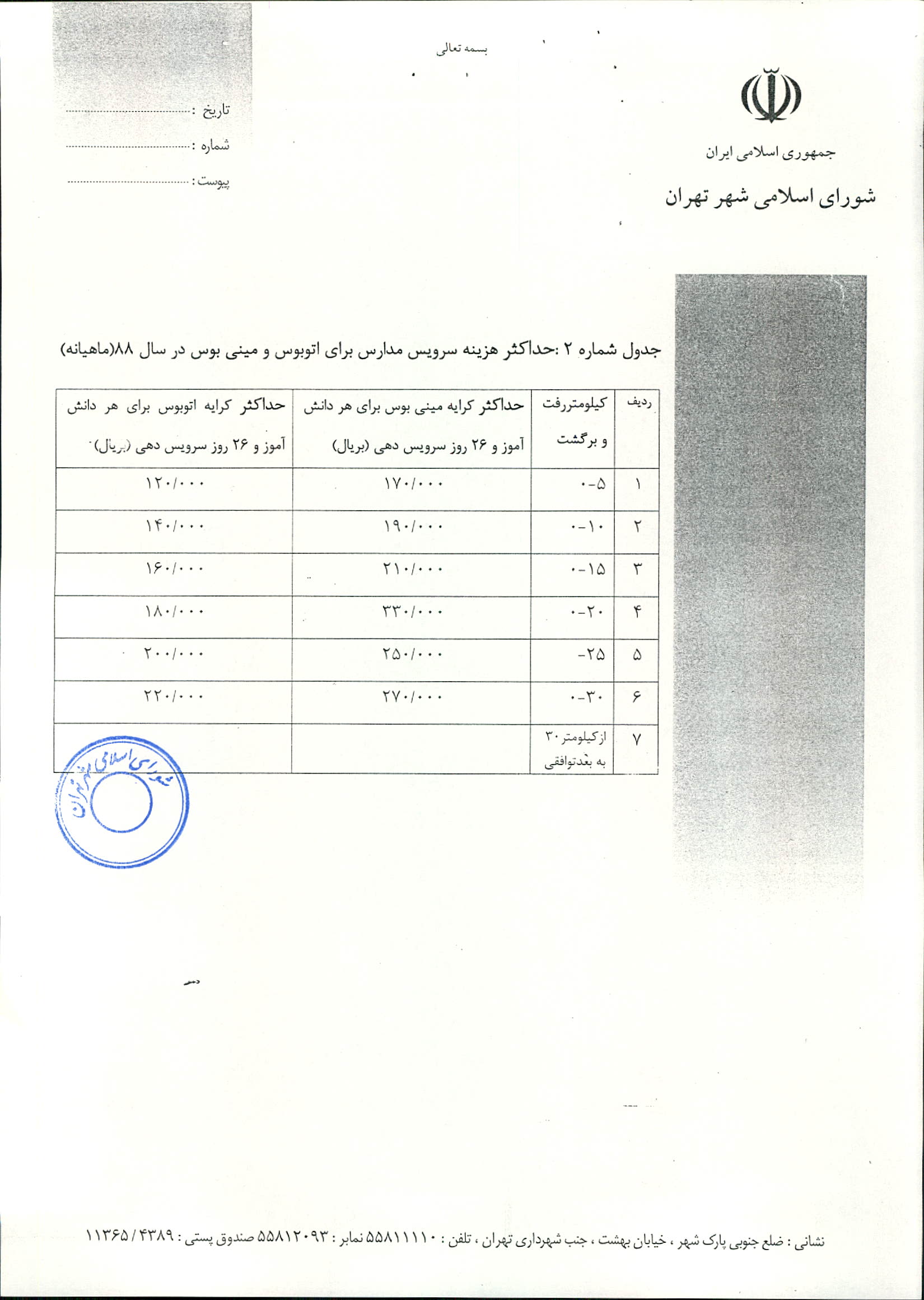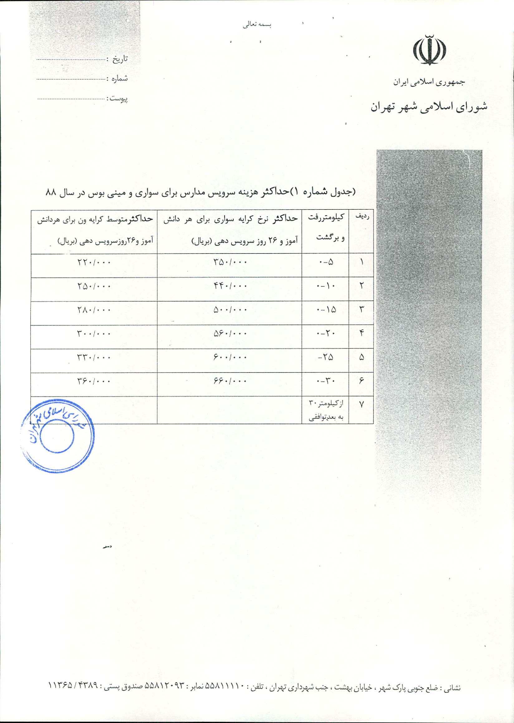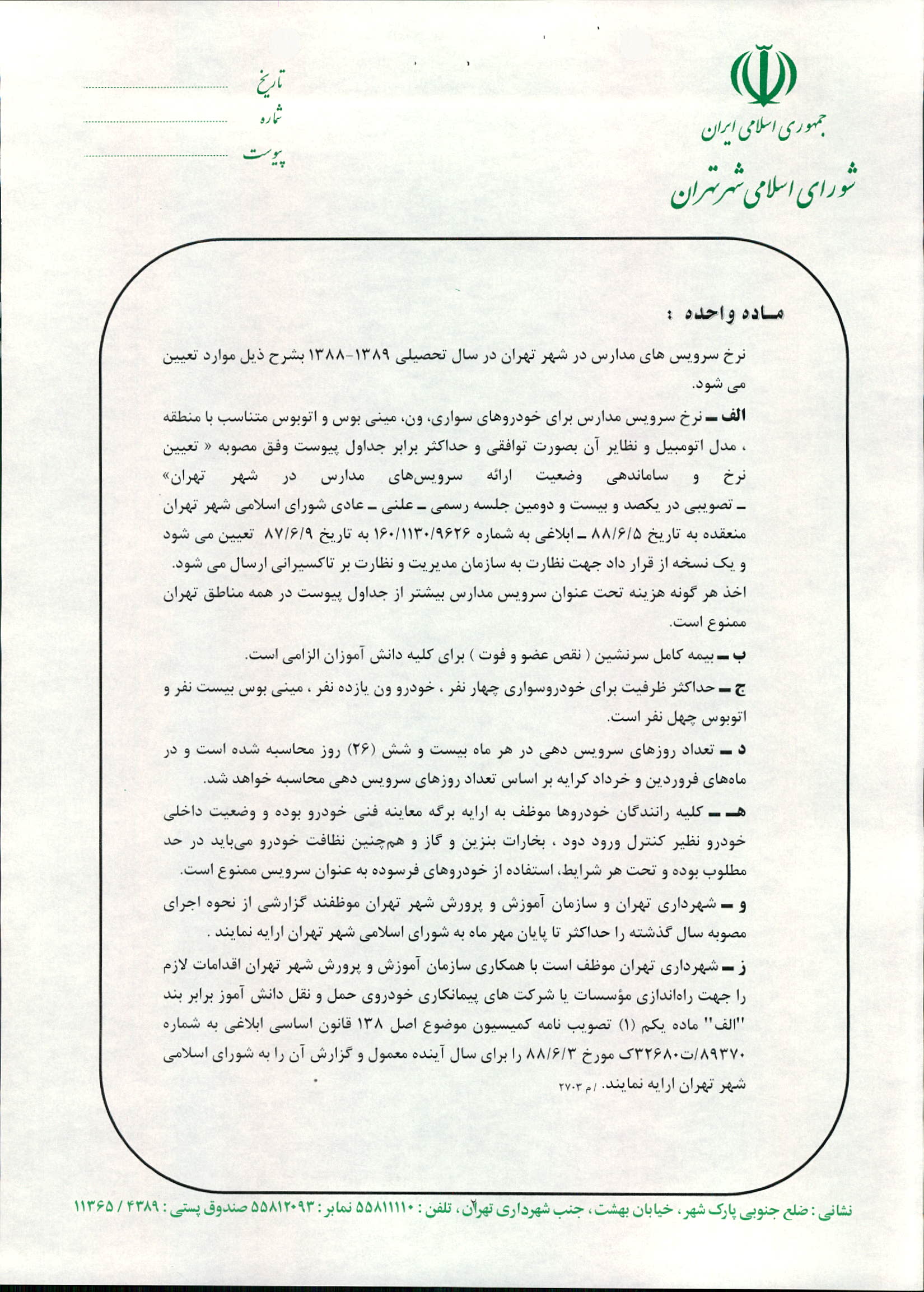 تعيين نرخ سرويسهاي مدارس در شهر تهران در سال تحصيلي 1389-1388