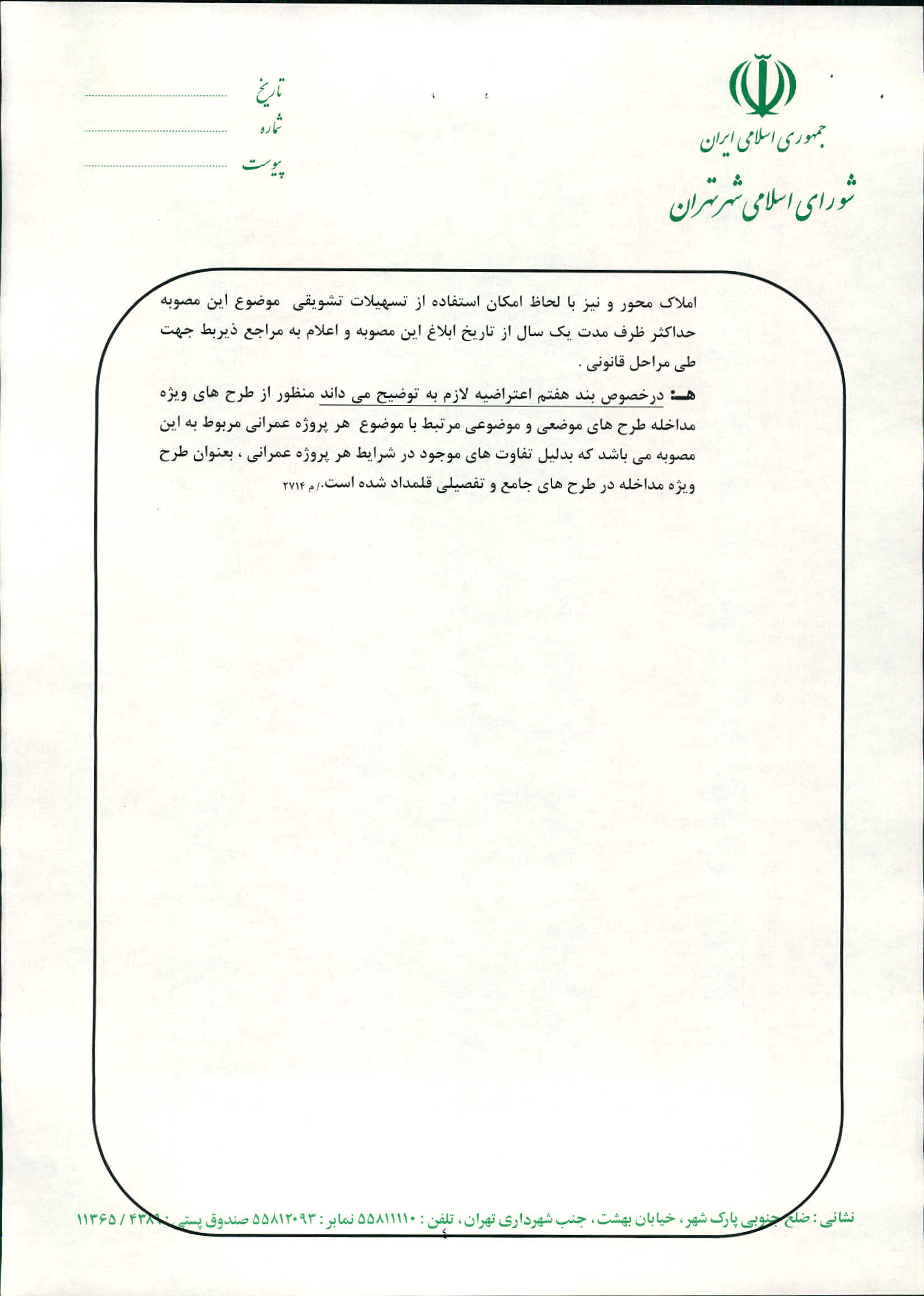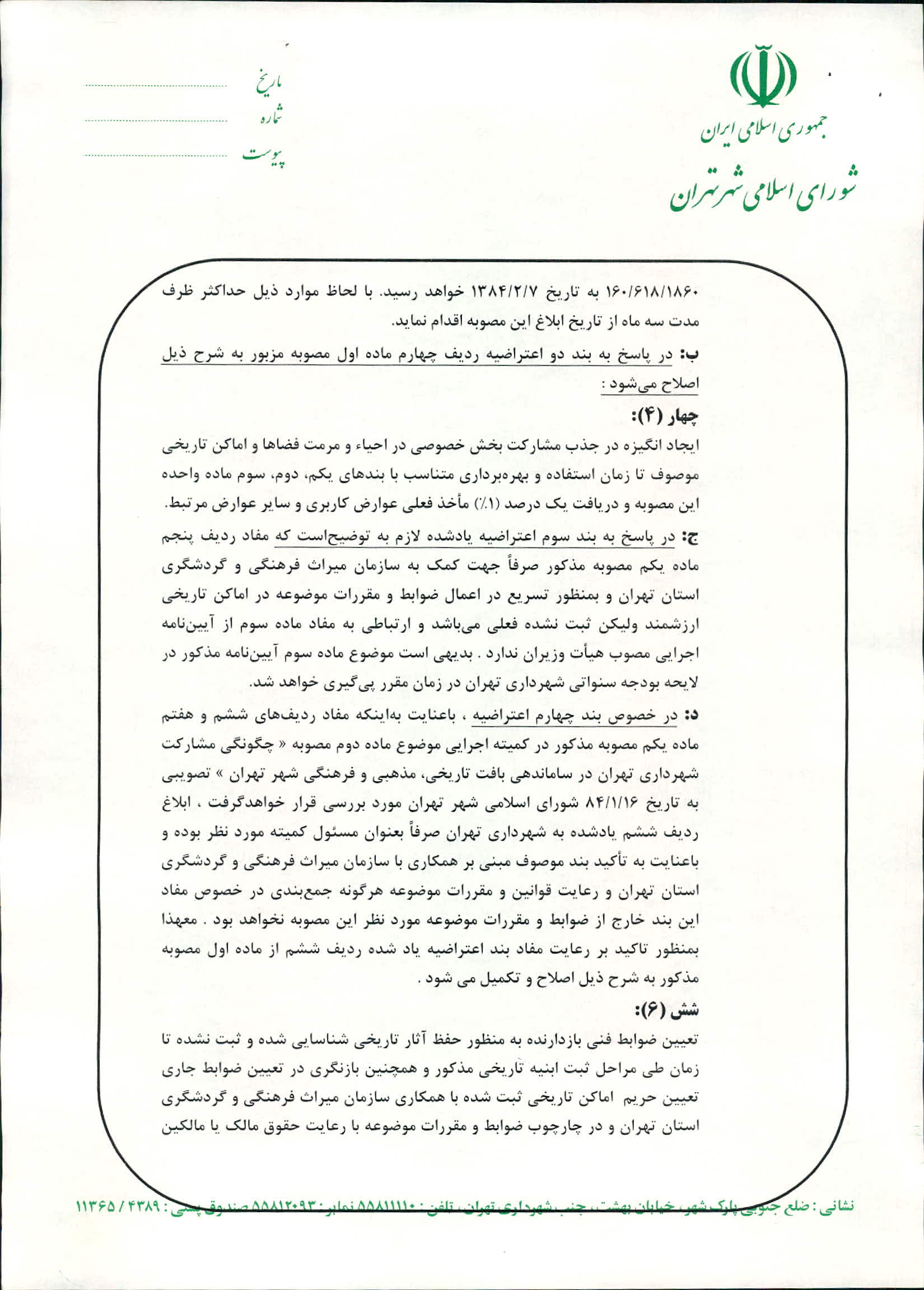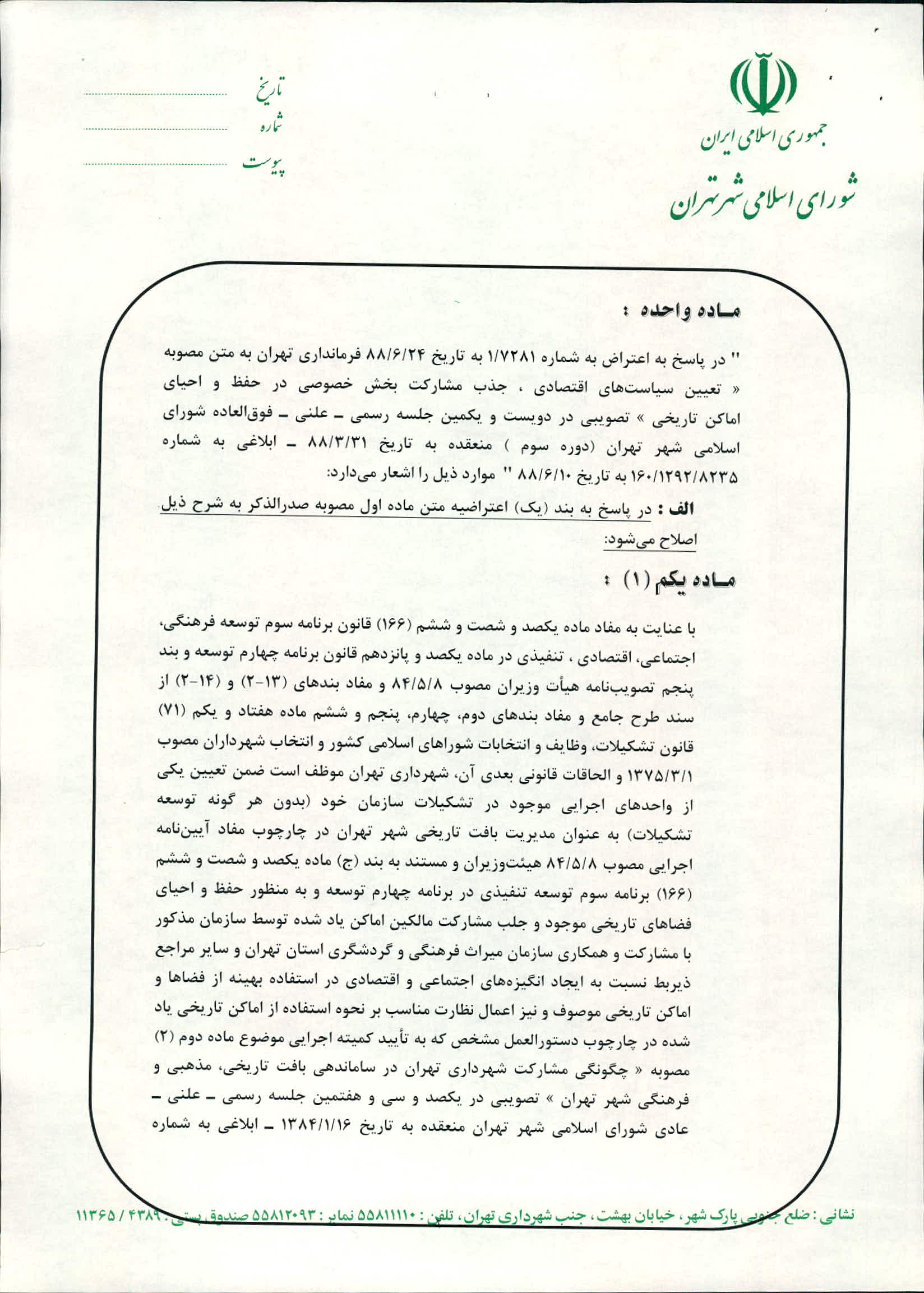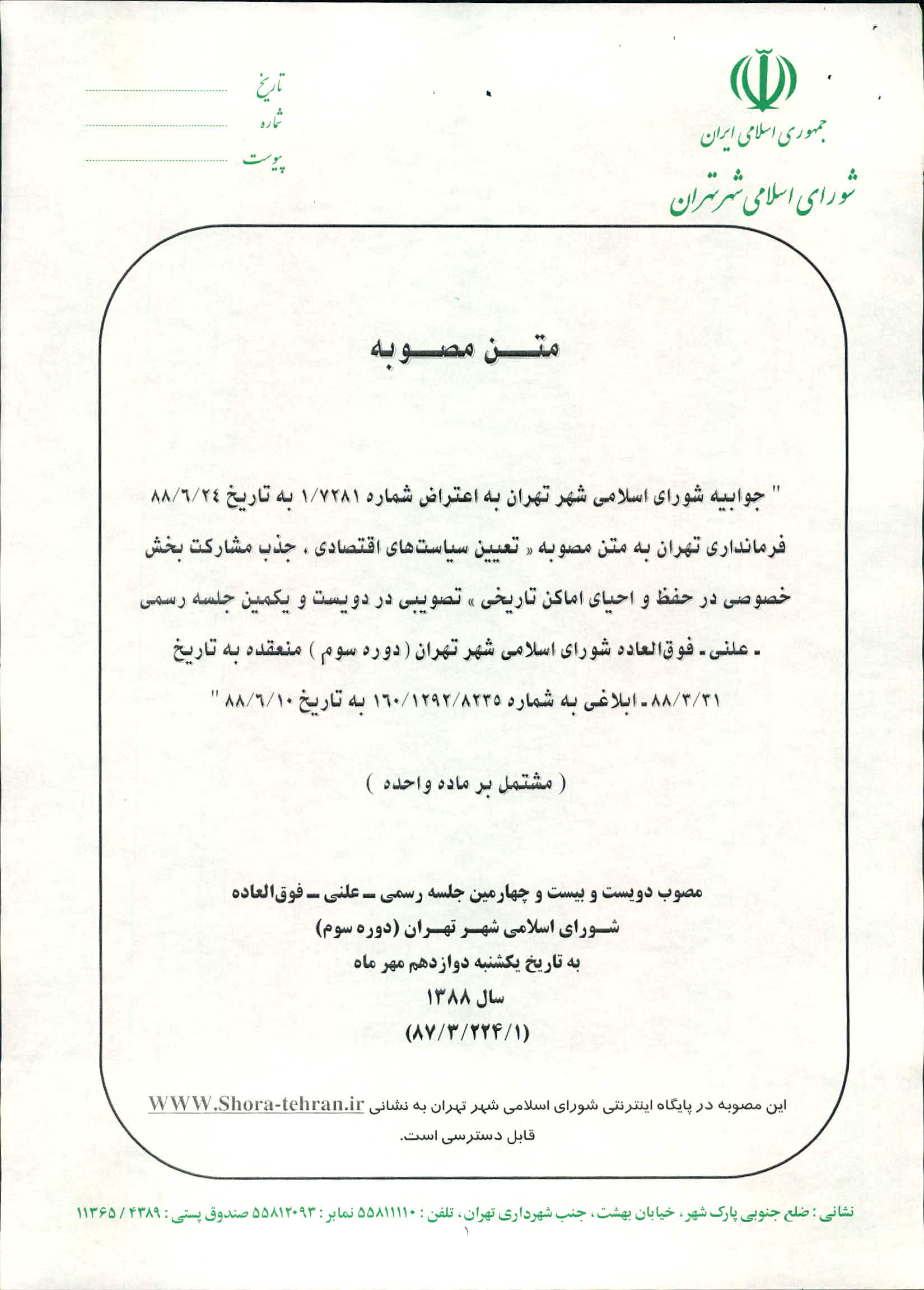 جوابيه شوراي اسلامي شهر تهران به اعتراض فرمانداري به شماره 1/7281 به تاريخ 88/6/24 به مصوبه «تعيين سياستهاي اقتصادي، جذب مشاركت بخش خصوصي در حفظ و احياي اماكن تاريخي» تصويبي در دويست و يكمين جلسه رسمي_علني_فوق العاده شوراي اسلامي شهر تهران(دوره سوم) منعقده به تاريخ 88/3/31 ـ ابلاغي به شماره 160/1292/8235 به تاريخ 88/6/10