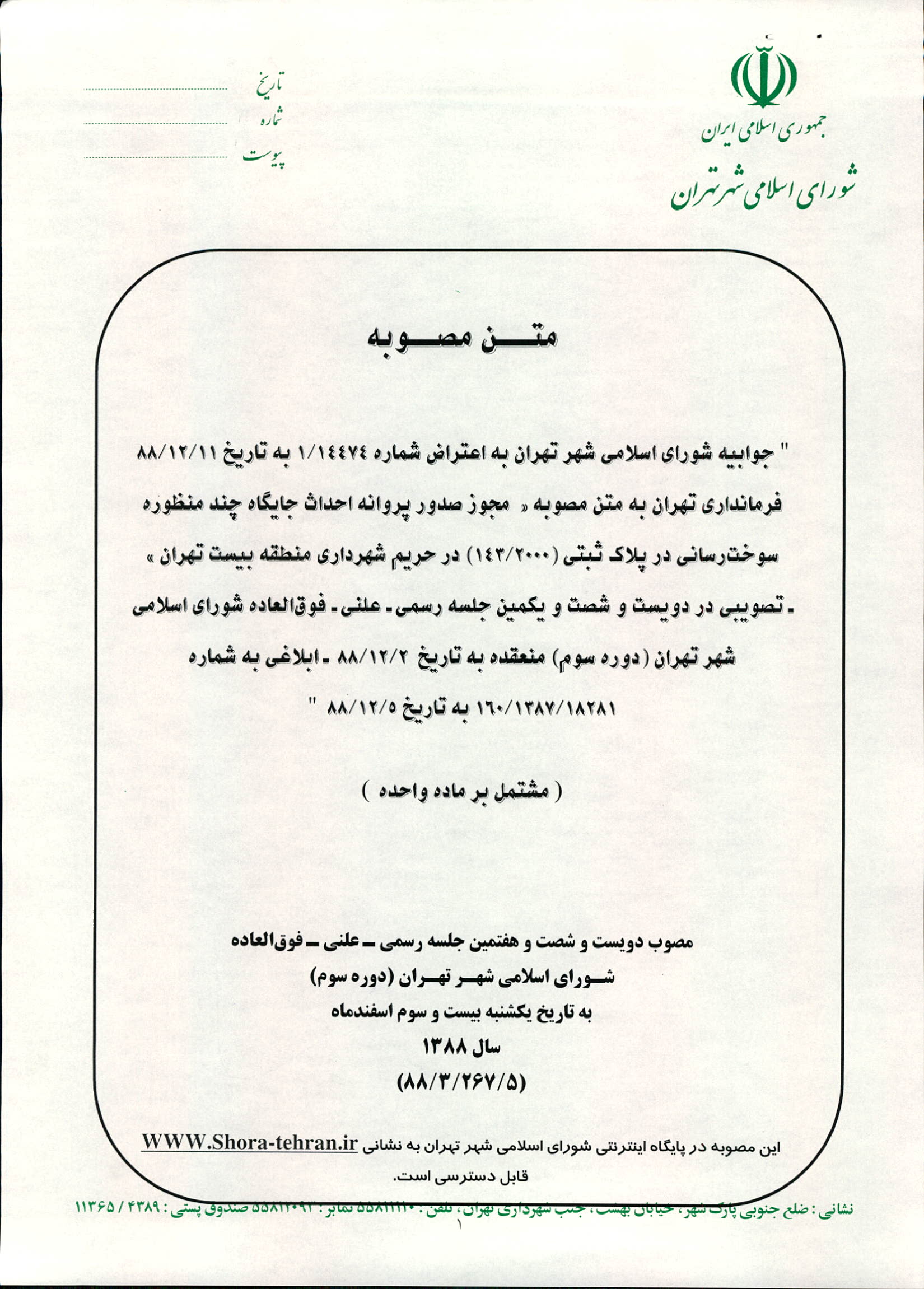 جوابيه شوراي اسلامي شهر تهران به اعتراض شماره 1/14474 به تاريخ 88/12/11 فرمانداري تهران به متن مصوبه «مجوز صدور پروانه احداث جايگاه چندمنظوره سوخترساني در پلاك ثبتي (143/2000) در حريم شهردار منطقه بيست تهران» ـ تصويبي در دويست و شصت و يكمين جلسه رسمي ـ علني ـ فوقالعاده شوراي اسلامي شهر تهران (دوره سوم) منعقده به تاريخ 88/12/2 ـ ابلاغي به شماره 160/1387/18281 به تاريخ 88/12/5