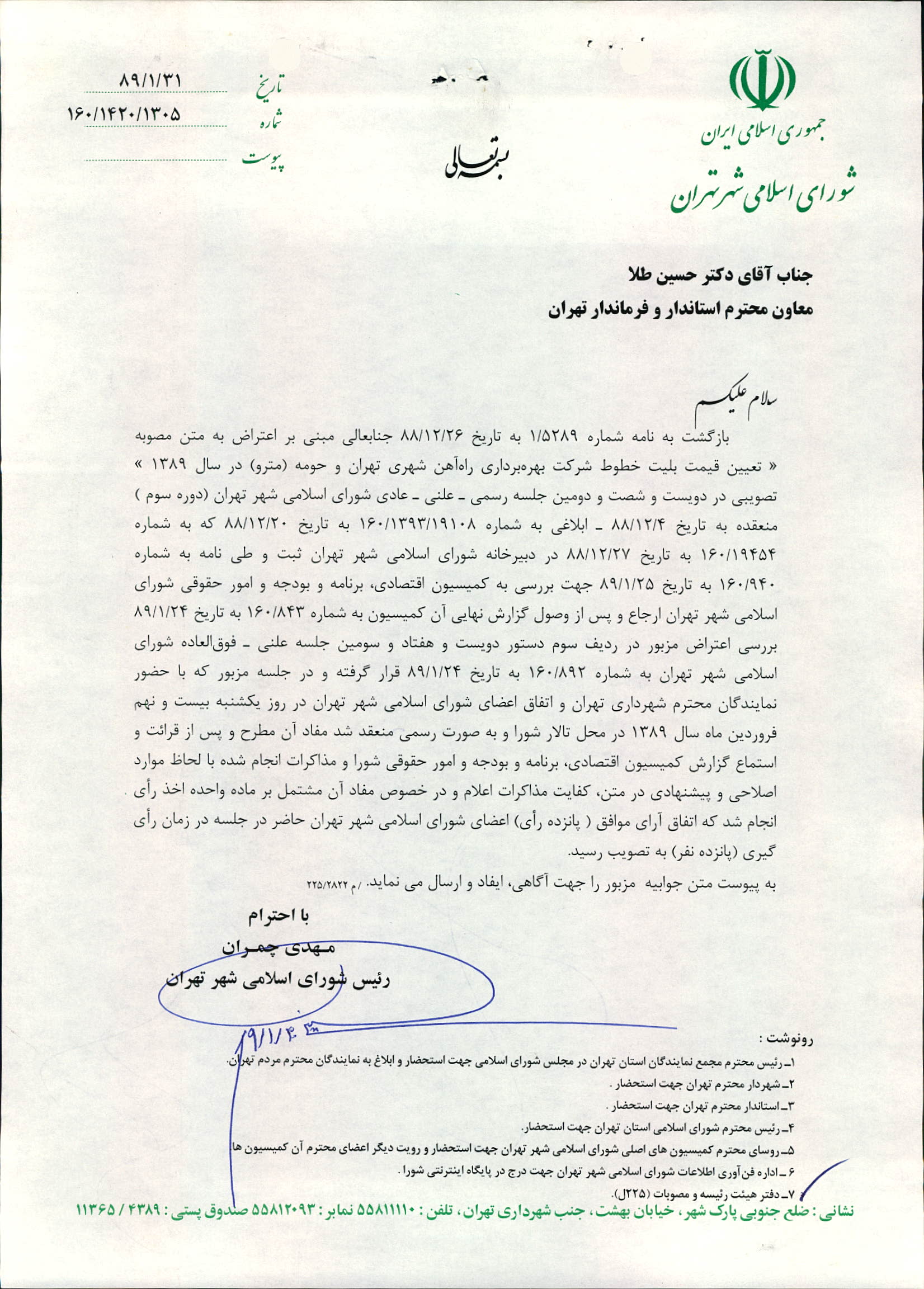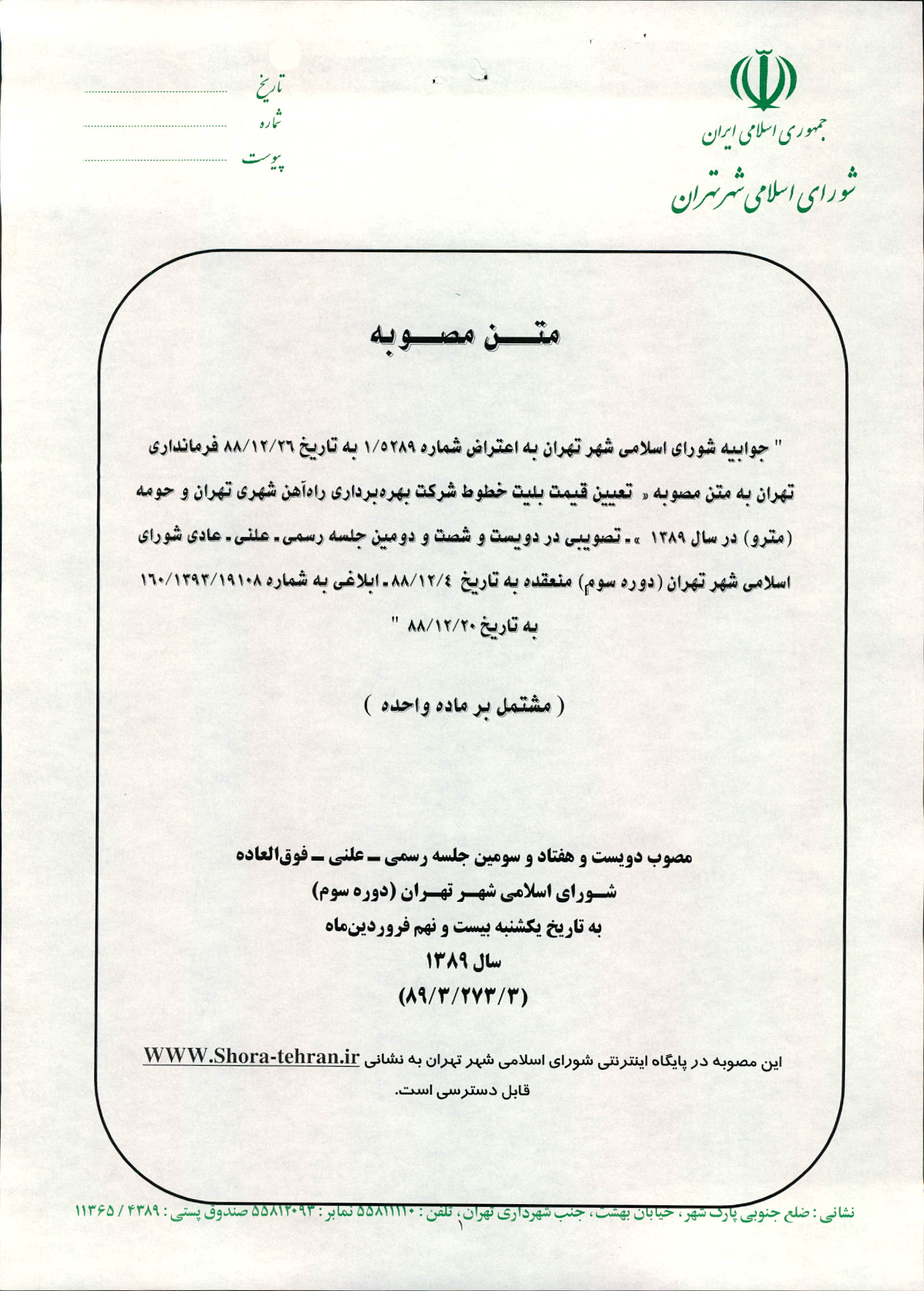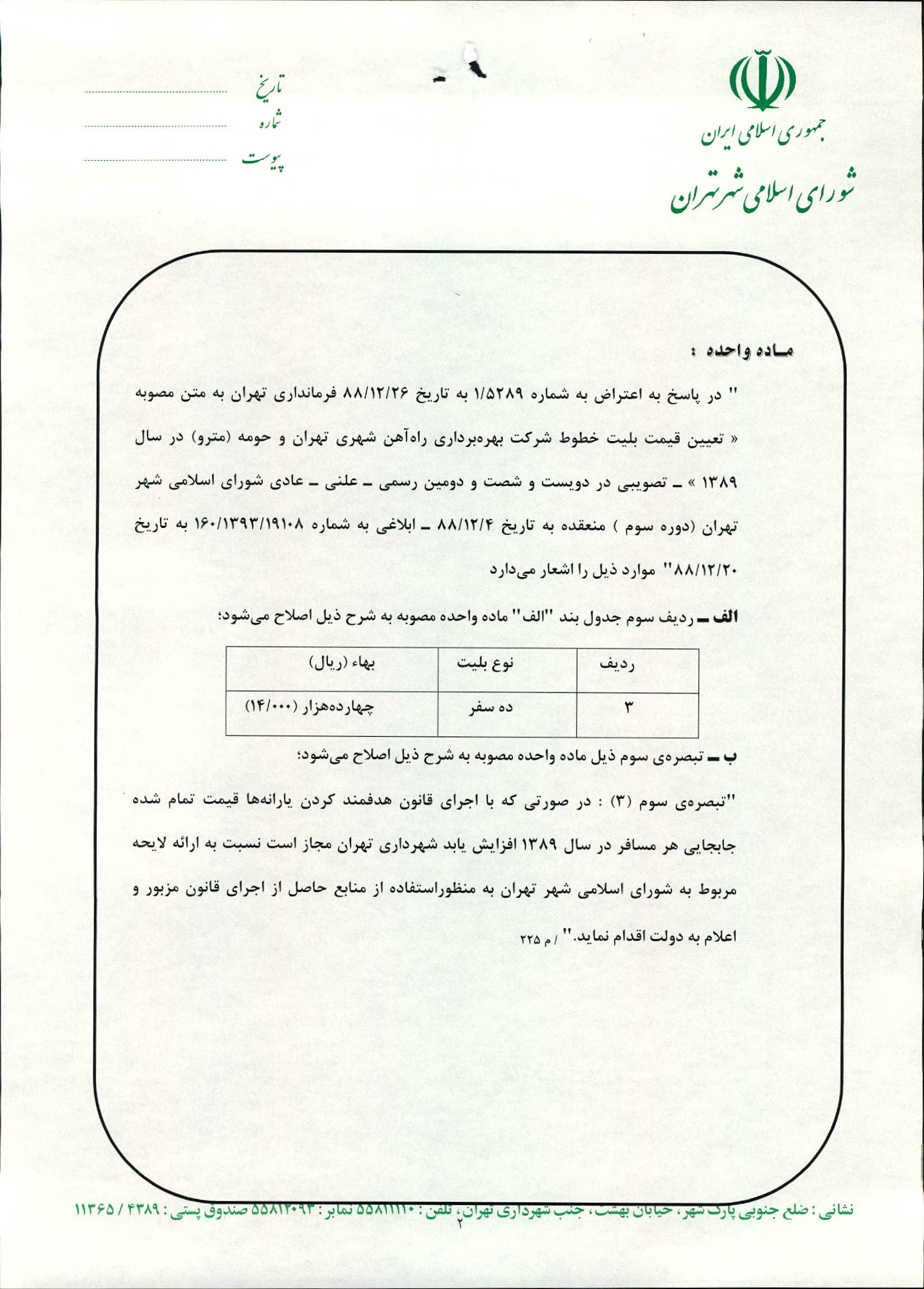 جوابيه شوراي اسلامي شهر تهران به اعتراض شماره 1/5289 به تاريخ 88/12/26 فرمانداري تهران به متن مصوبه «تعيين قيمت بليت خطوط شركت بهرهبرداري راهآهن شهري تهران و حومه (مترو) در سال 1389» ـ تصويبي در دويست و شصت و دومين رسمي ـ علني ـ عادي شوراي اسلامي شهر تهران (دوره سوم) منعقده به تاريخ 88/12/4 ـ ابلاغي به شماره 160/1393/19108 به تاريخ 88/12/20"
