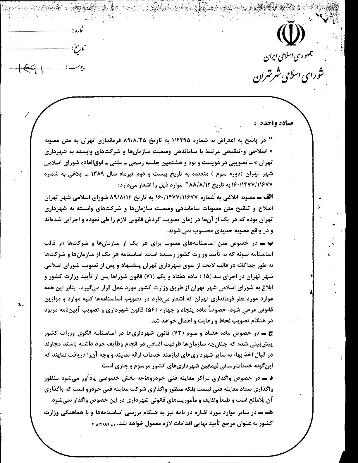 جوابيه شوراي اسلامي شهر تهران به اعتراض شماره 1/6295 به تاريخ 89/8/25 فرمانداري تهران به متن مصوبه«اصلاحي و تنقيحي مرتبط با ساماندهي وضعيت سازمانها و شركتهاي وابسته به شهرداري تهران»ـ تصويبي در دويست و نود و هشتمين جلسه رسمي ـ علني ـ فوقالعاده شوراي اسلامي شهر تهران (دوره سوم) منعقده به تاريخ89/4/22 ـ ابلاغي به شماره 160/1477/11677 به تاريخ 89/8/12