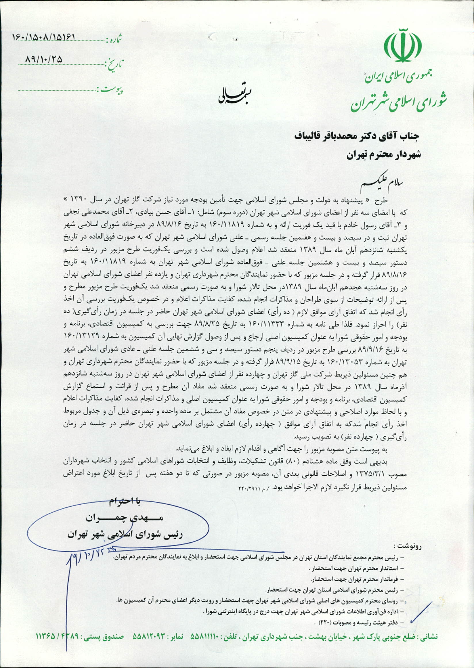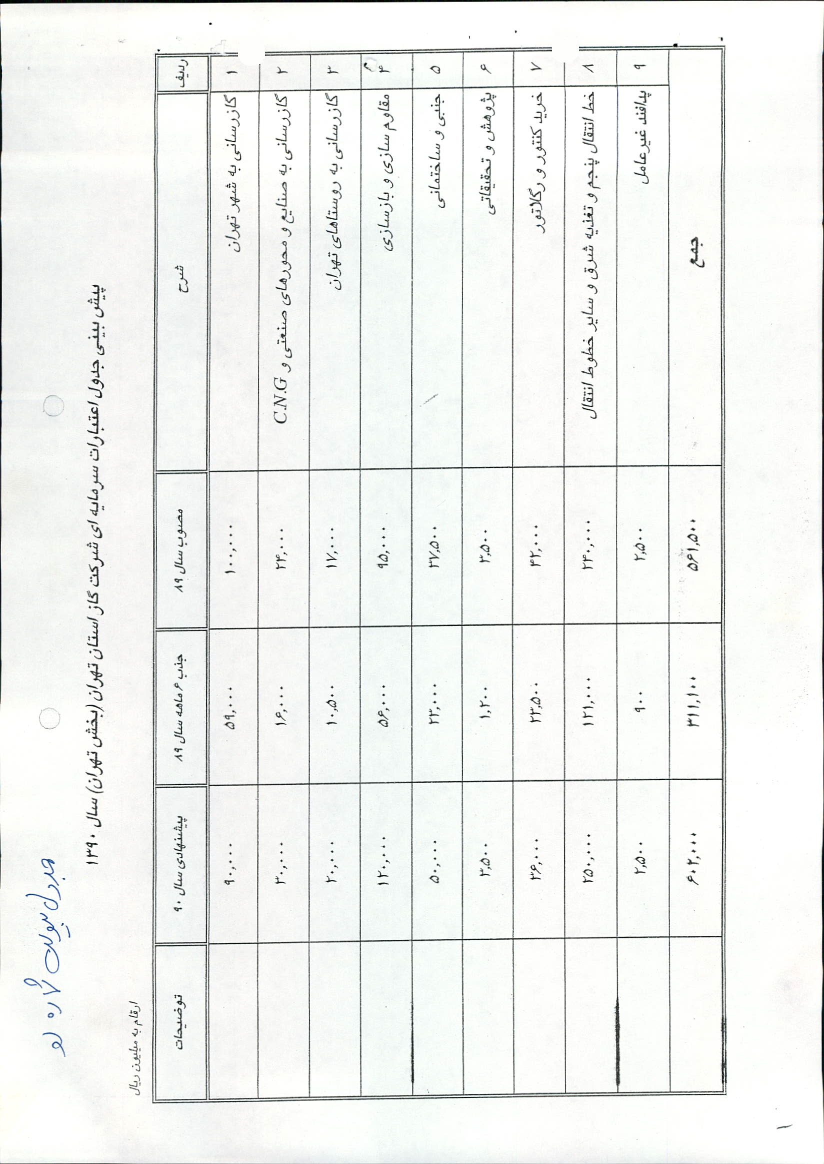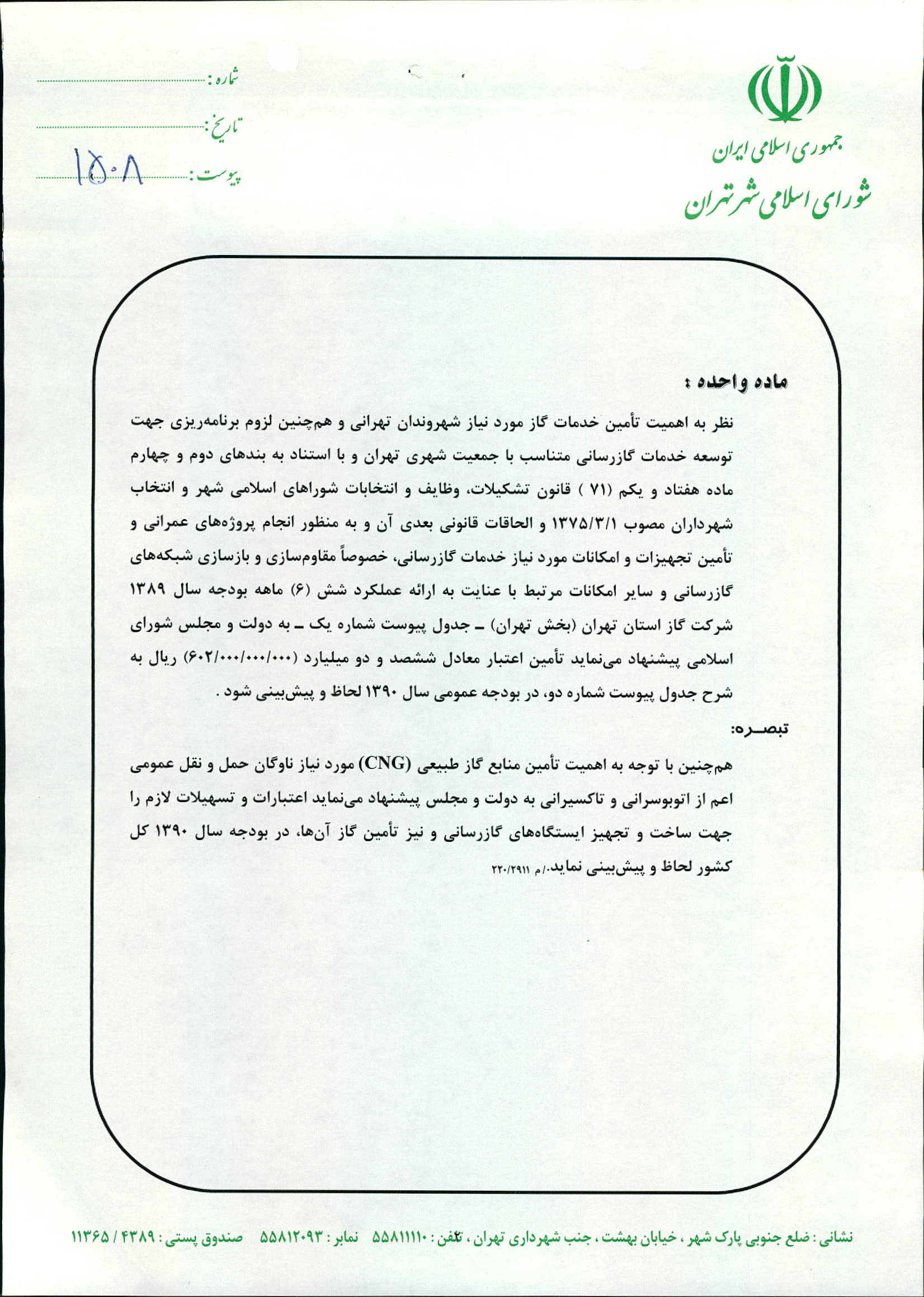 پيشنهاد به دولت و مجلس شوراي اسلامي جهت تأمين بودجه مورد نياز شركت گاز تهران در سال 1390