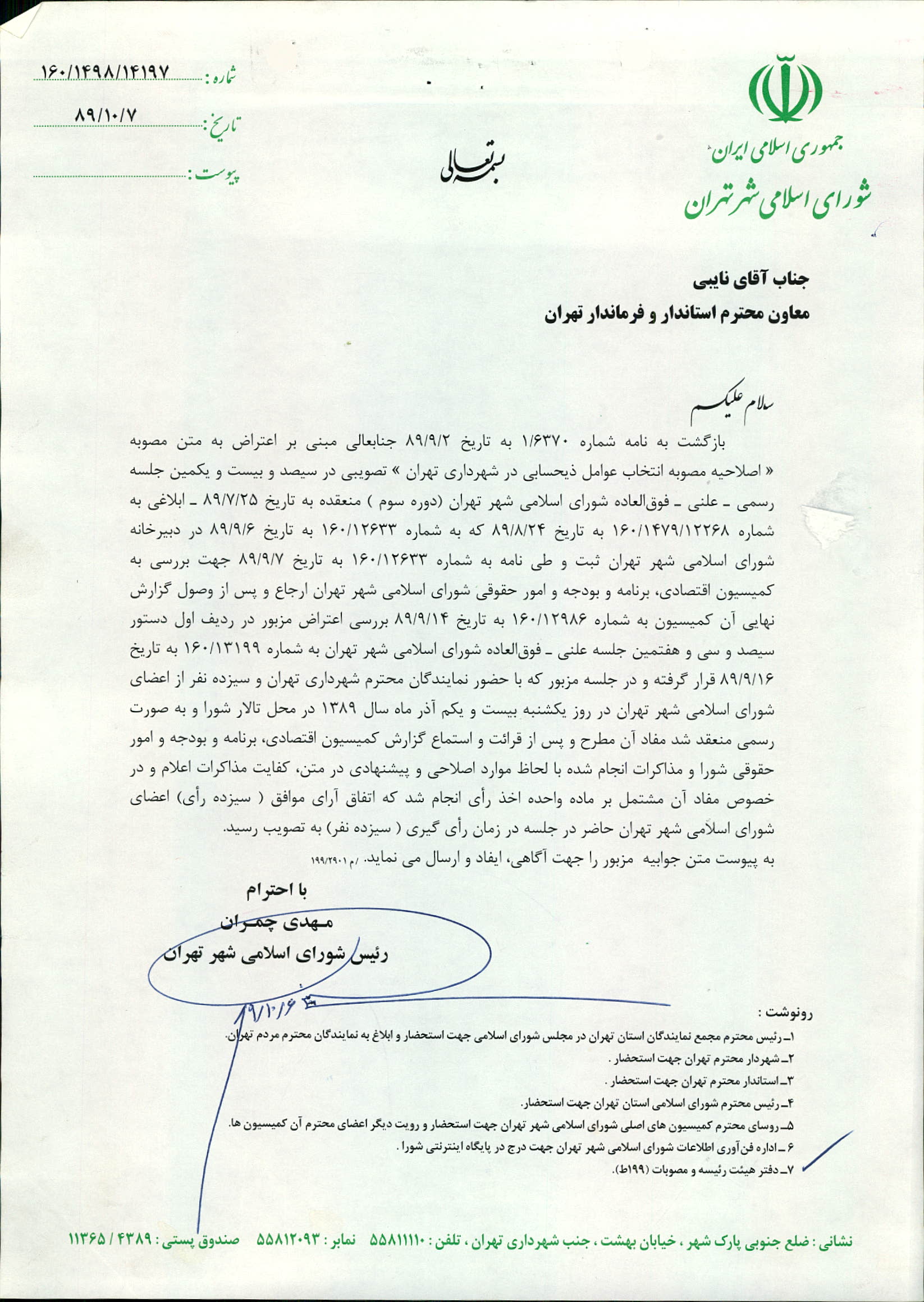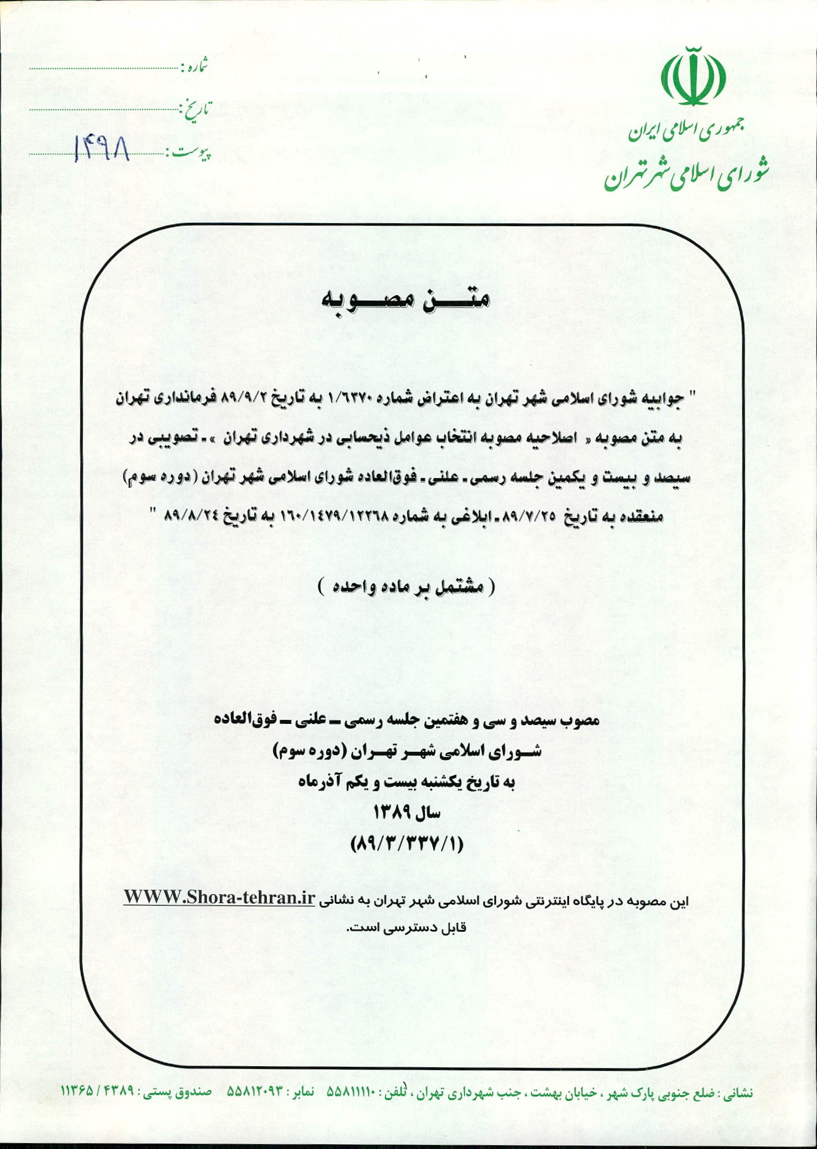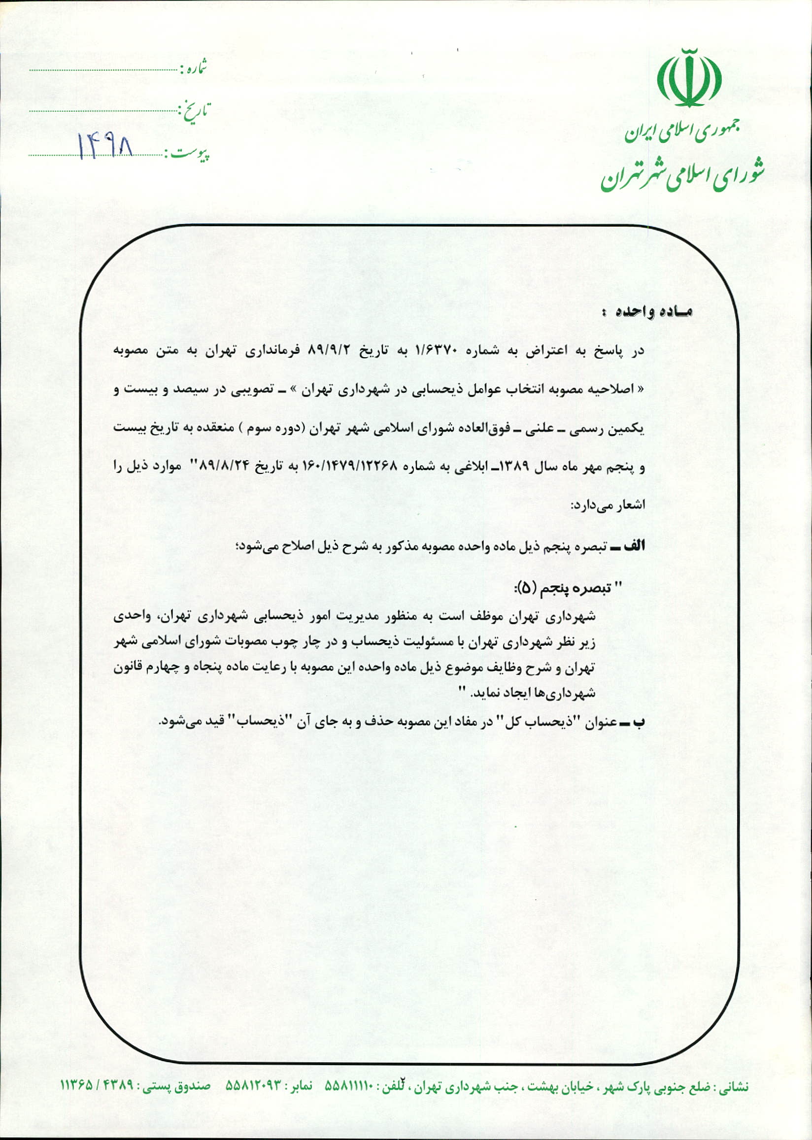 جوابيه شوراي اسلامي شهر تهران به اعتراض شماره 1/6370 به تاريخ 89/9/2 فرمانداري تهران به متن مصوبه «اصلاحيه مصوبه انتخاب عوامل ذيحسابي در شهرداري تهران» ـ تصويبي در سيصد و بيست و يكمين رسمي ـ علني ـ فوقالعاده شوراي اسلامي شهر تهران (دوره سوم) منعقده به تاريخ 89/7/25 ـ ابلاغي به شماره 160/1479/12268 به تاريخ 89/8/24"
