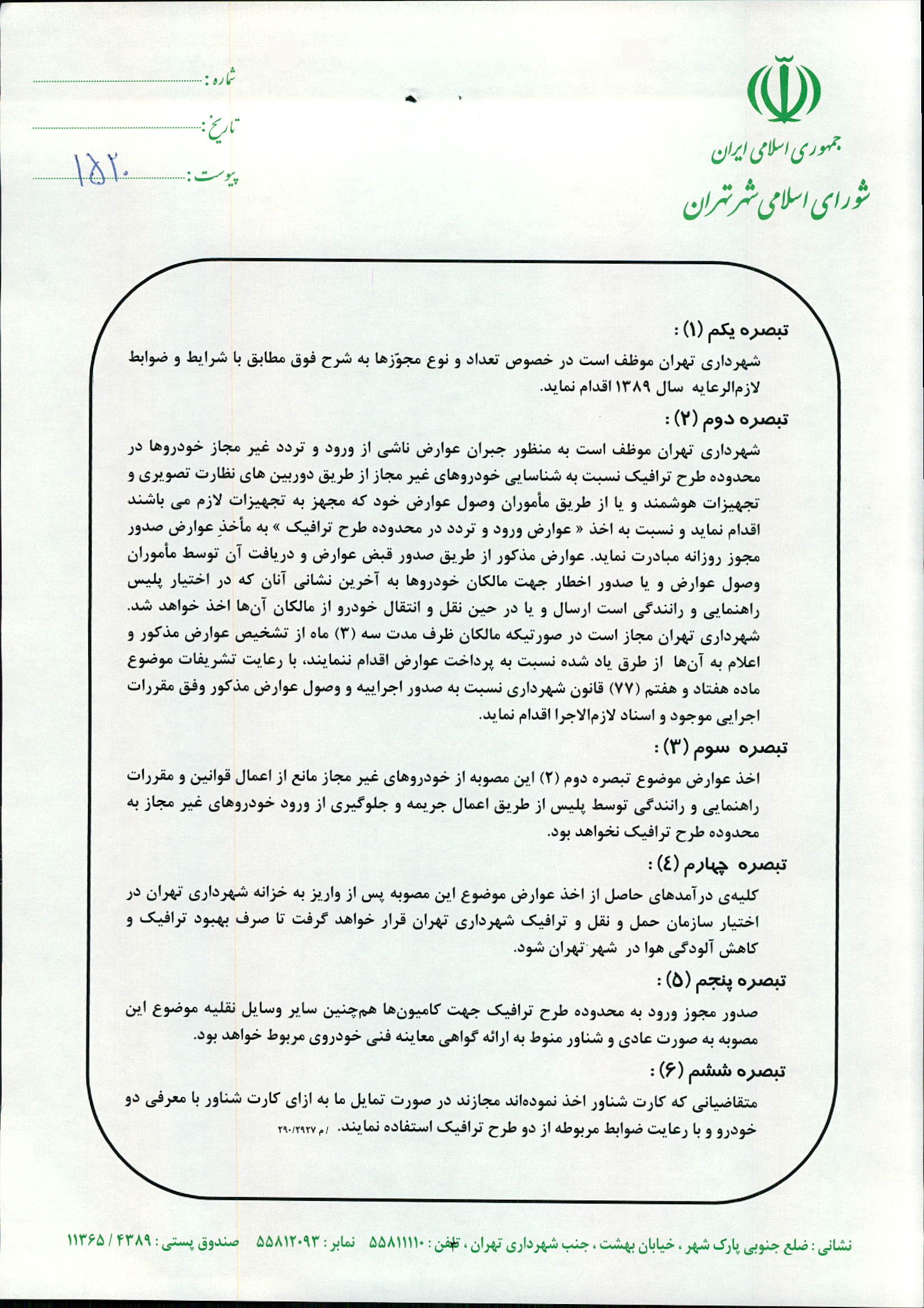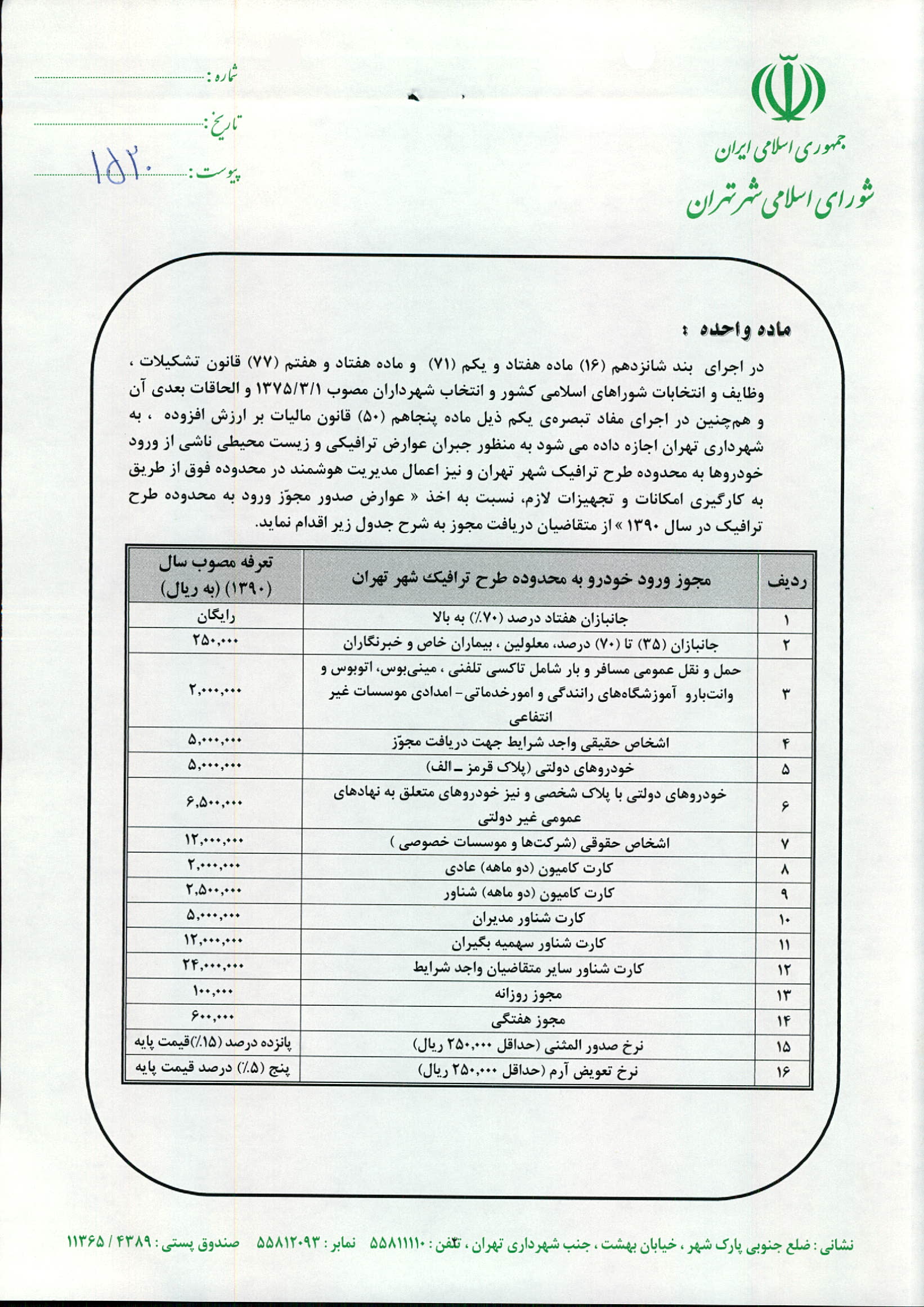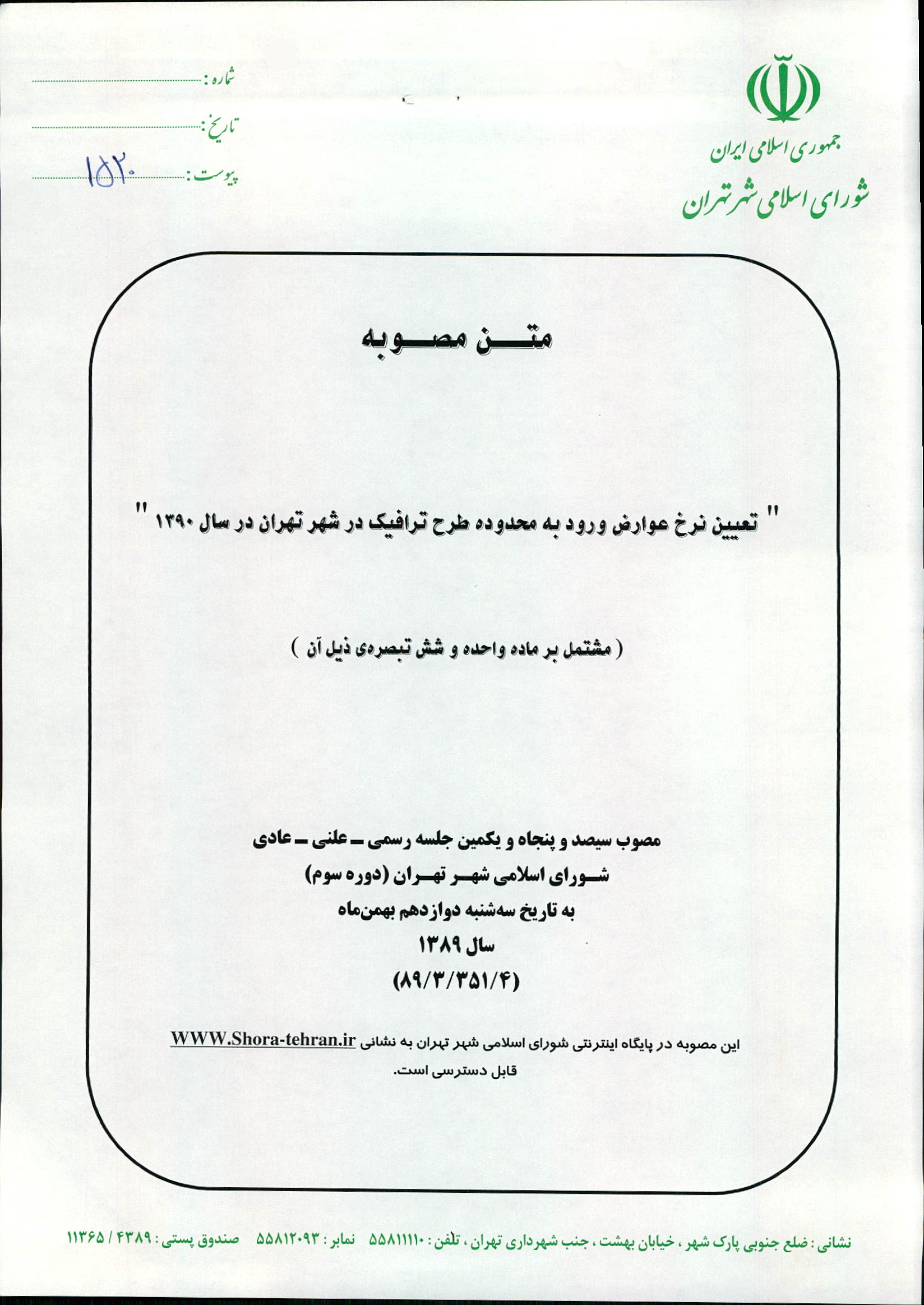تعيين نرخ عوارض ورود به محدوده طرح ترافيك در شهر تهران در سال 1390