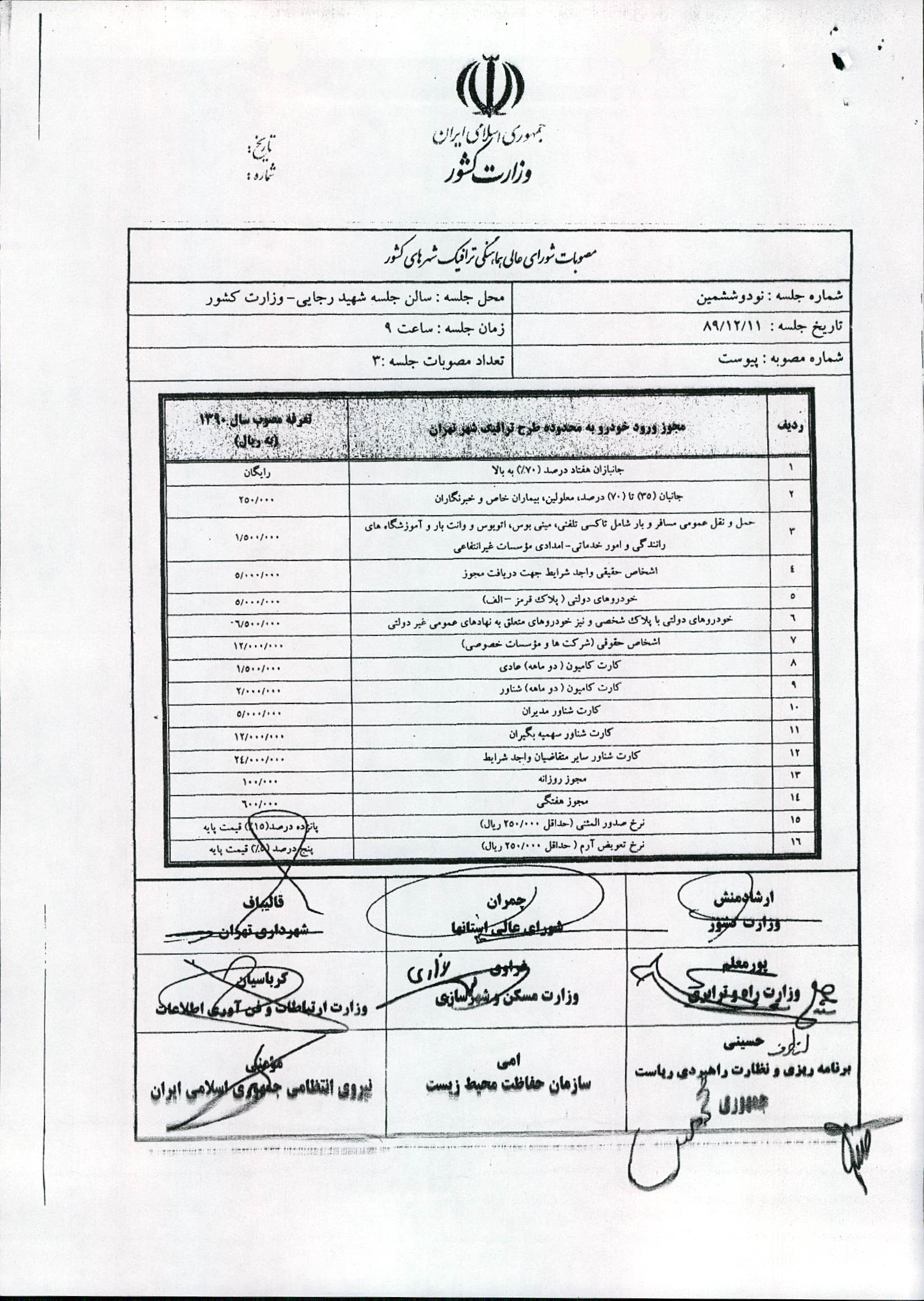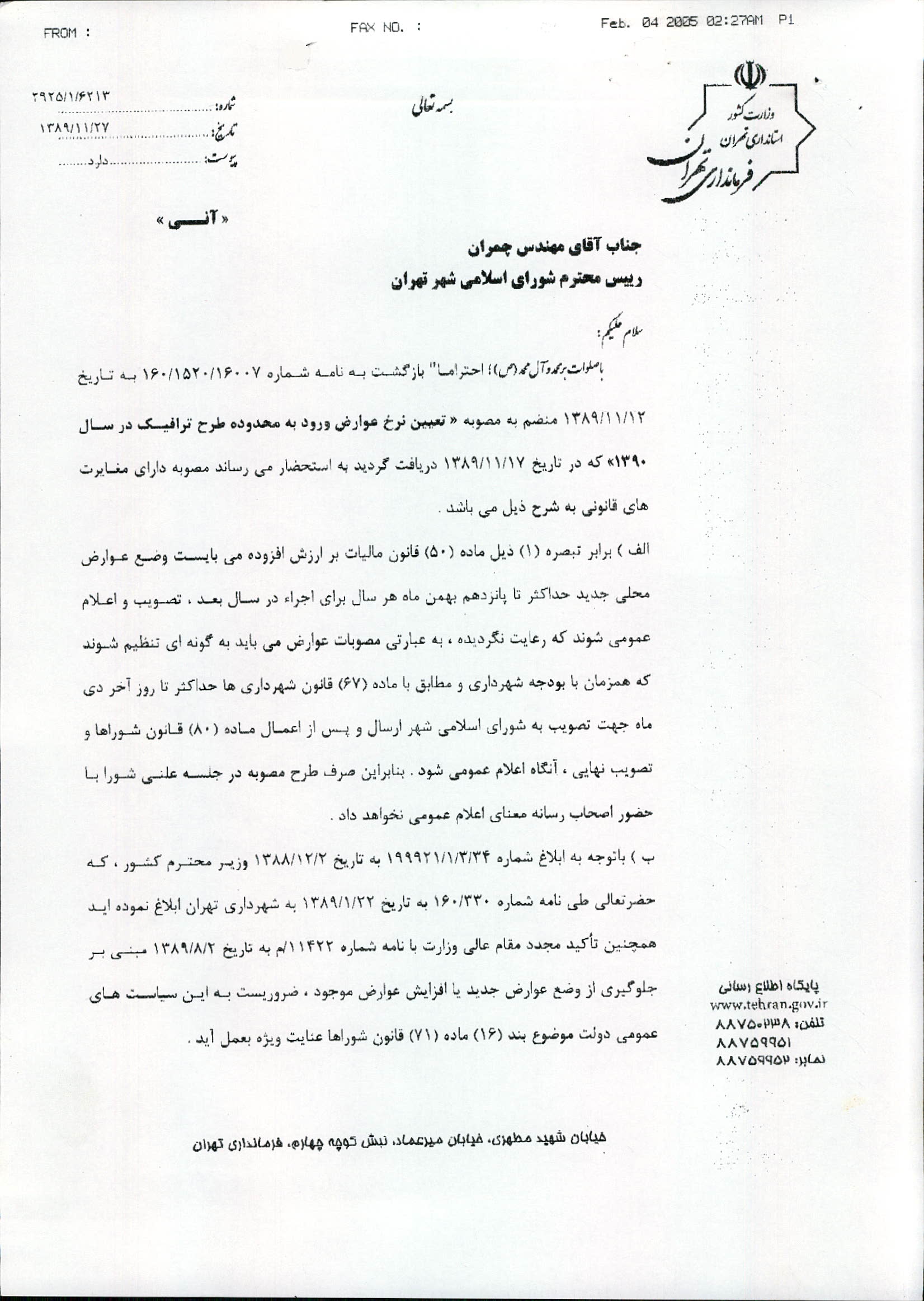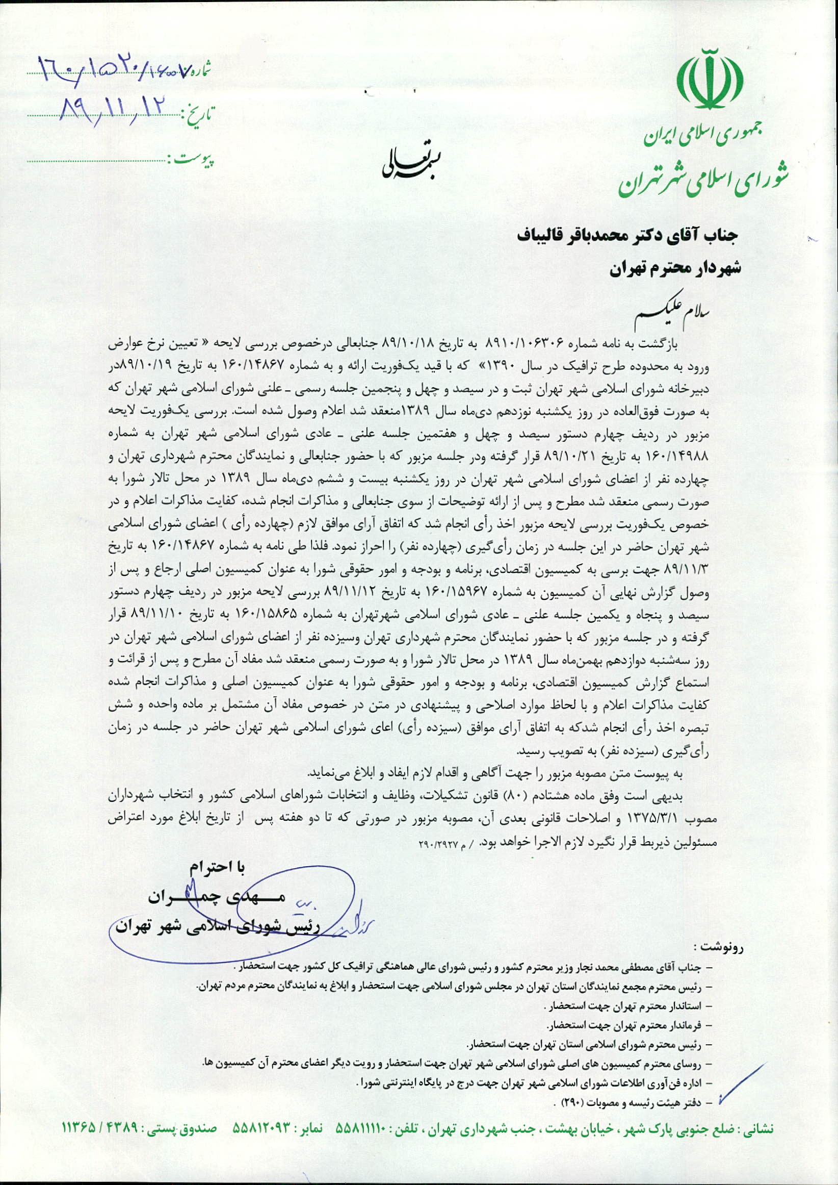 تعيين نرخ عوارض ورود به محدوده طرح ترافيك در شهر تهران در سال 1390