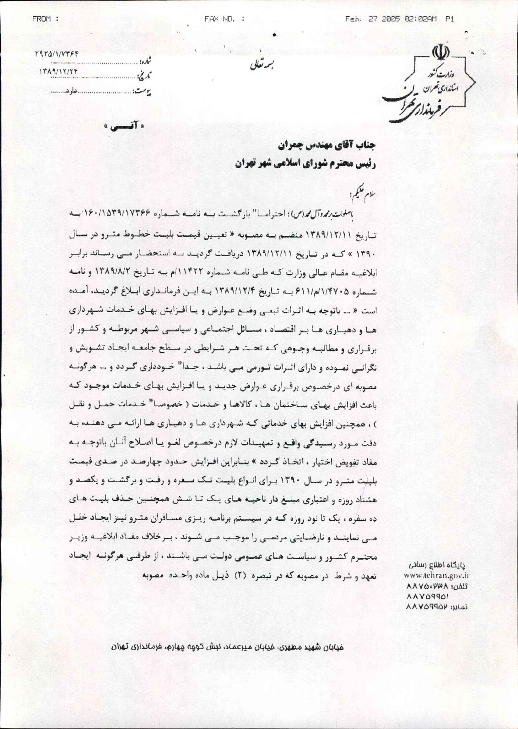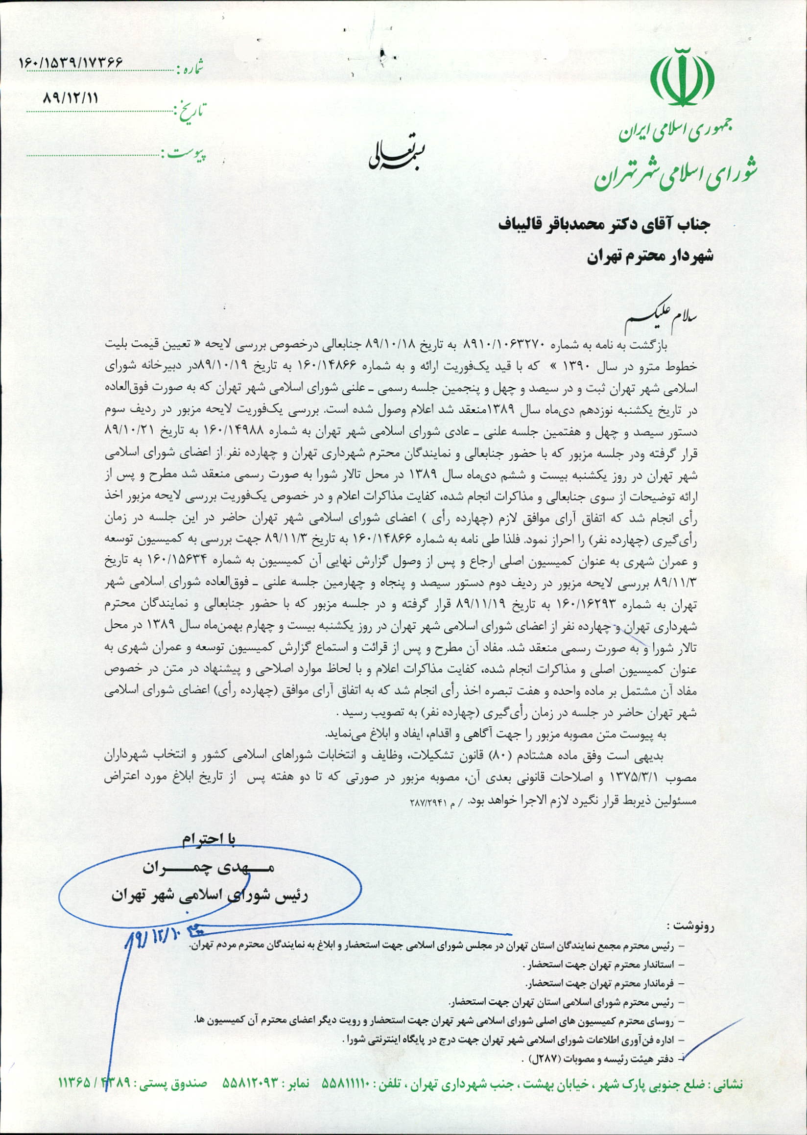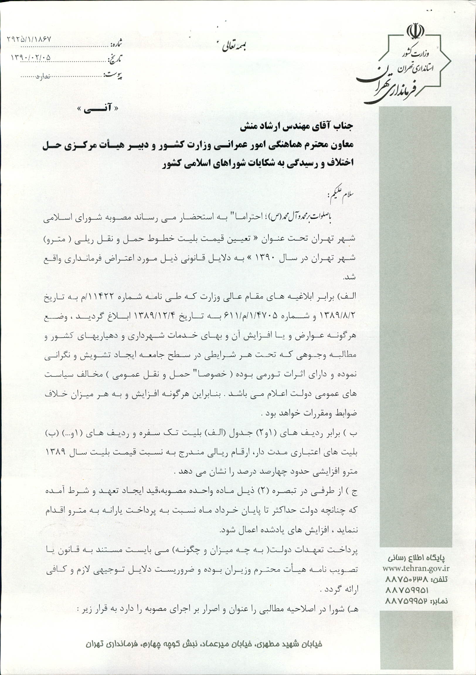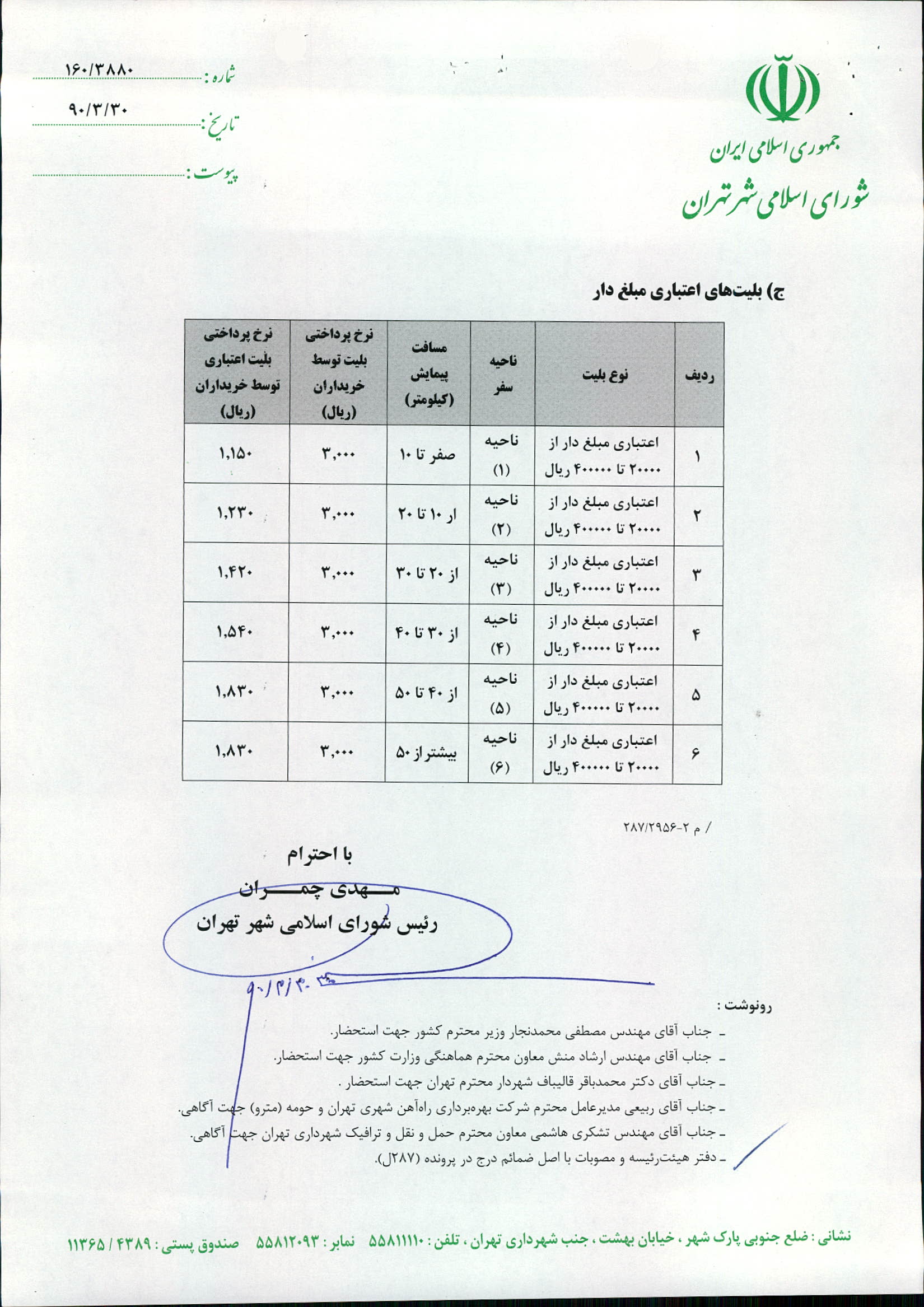 تعيين قيمت بليت خطوط حمل و نقل ريلي (مترو) شهر تهران در سال 1390