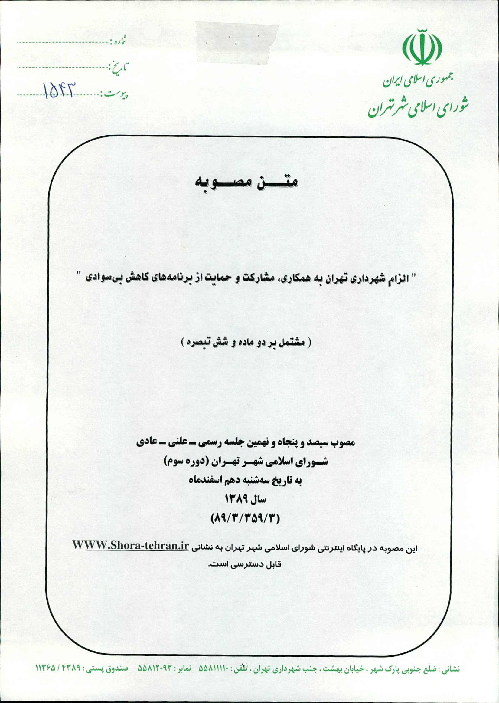 الزام شهرداري تهران به همكاري، مشاركت و حمايت از برنامههاي كاهش بيسوادي