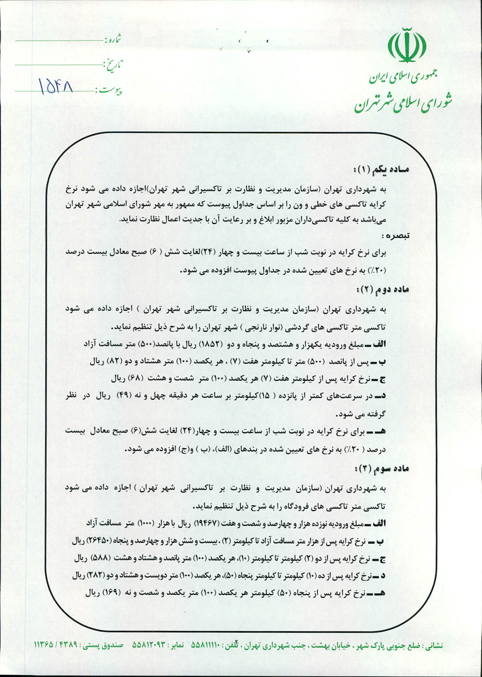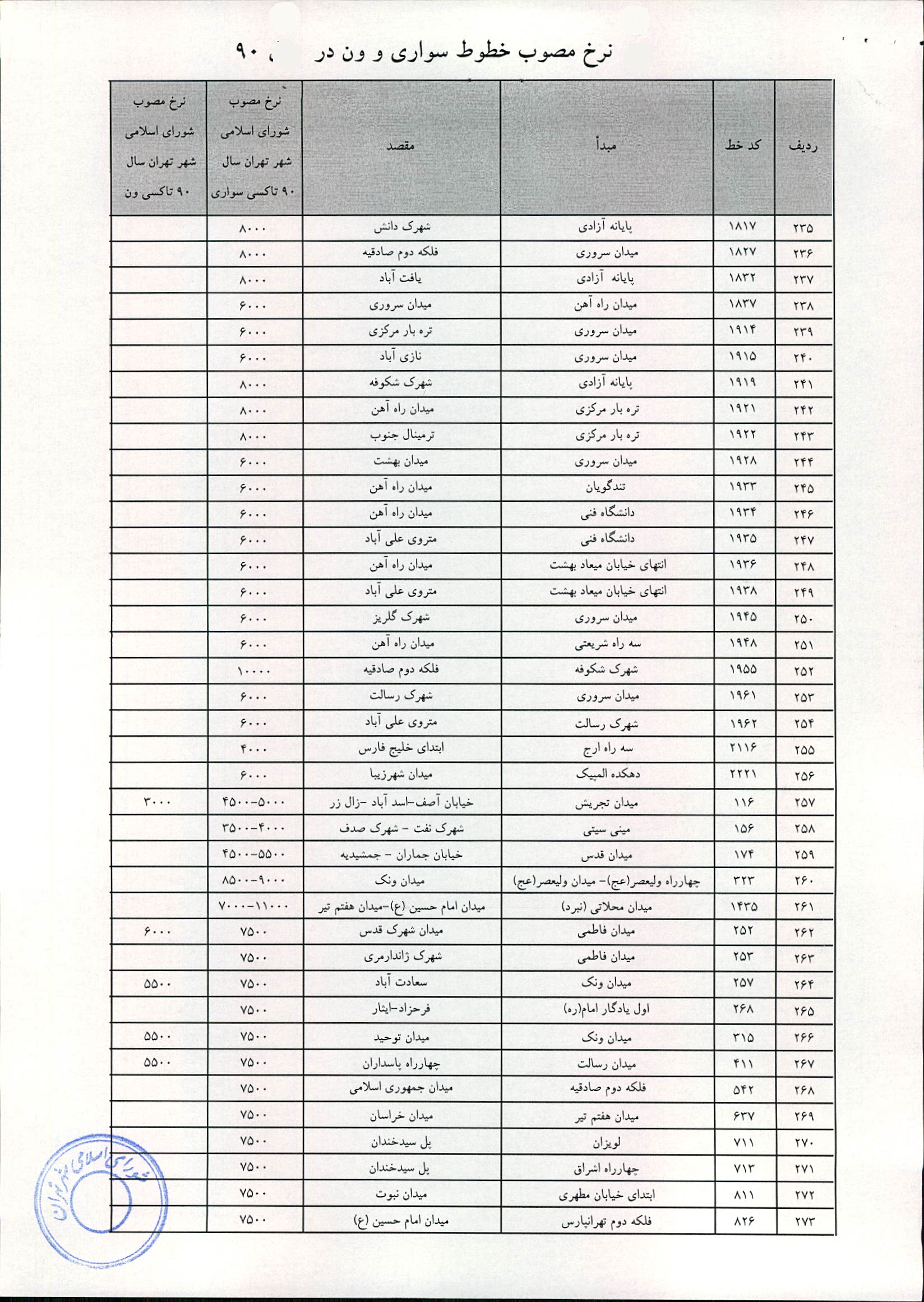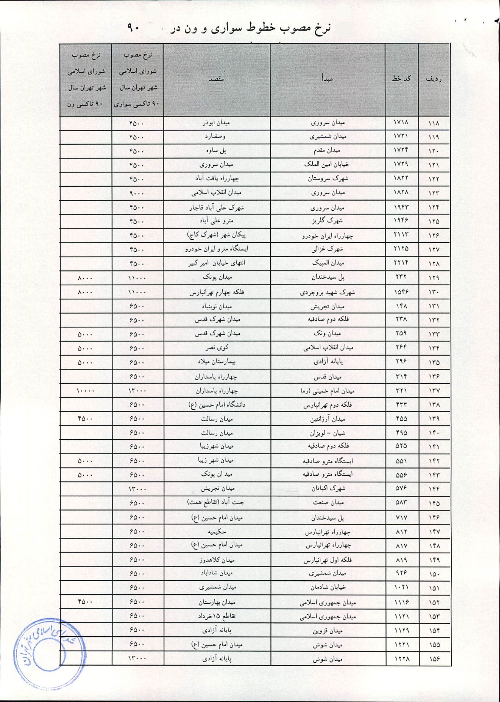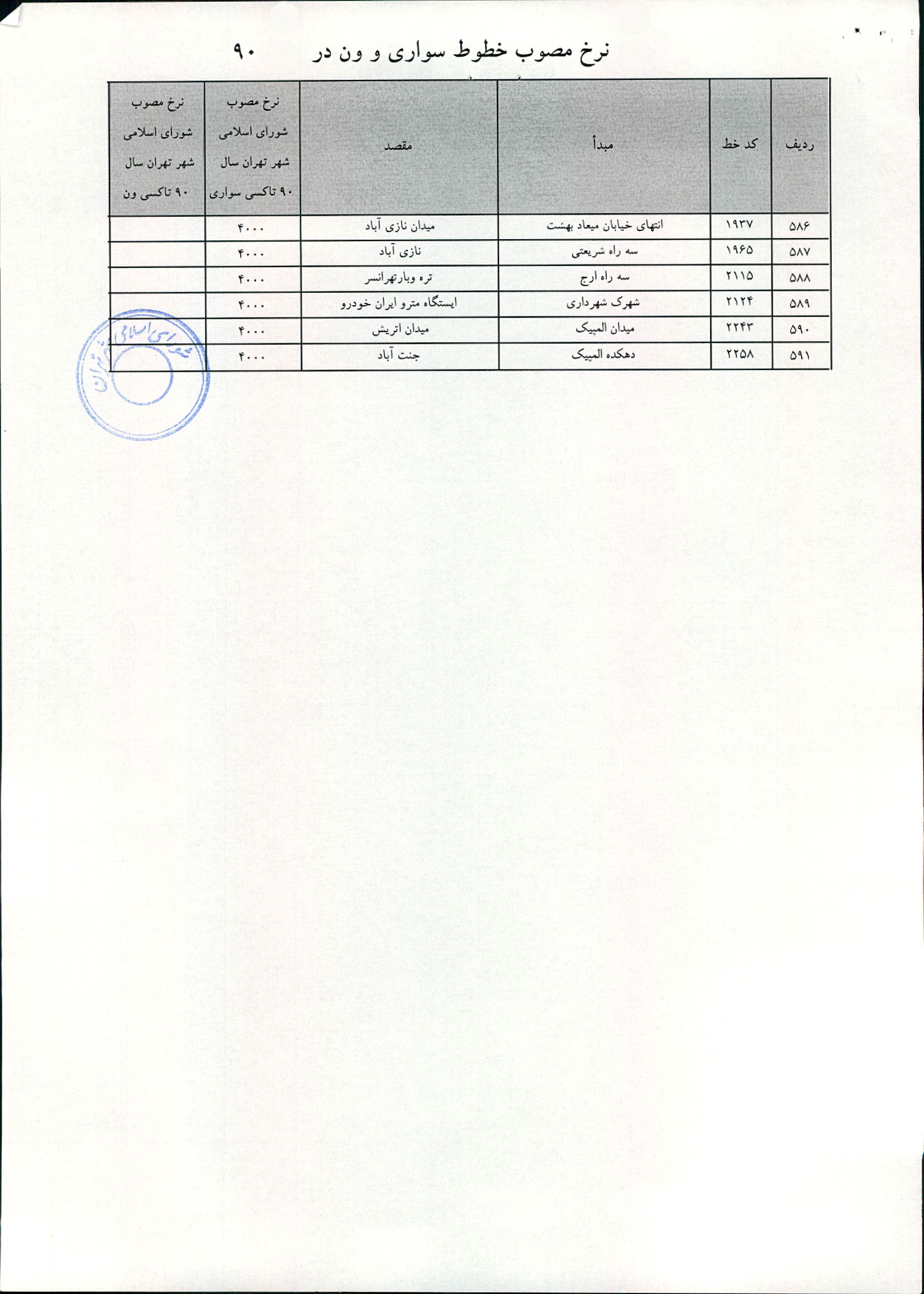 تعيين نرخ كرايه انواع تاكسي در سال 1390 در شهر تهران