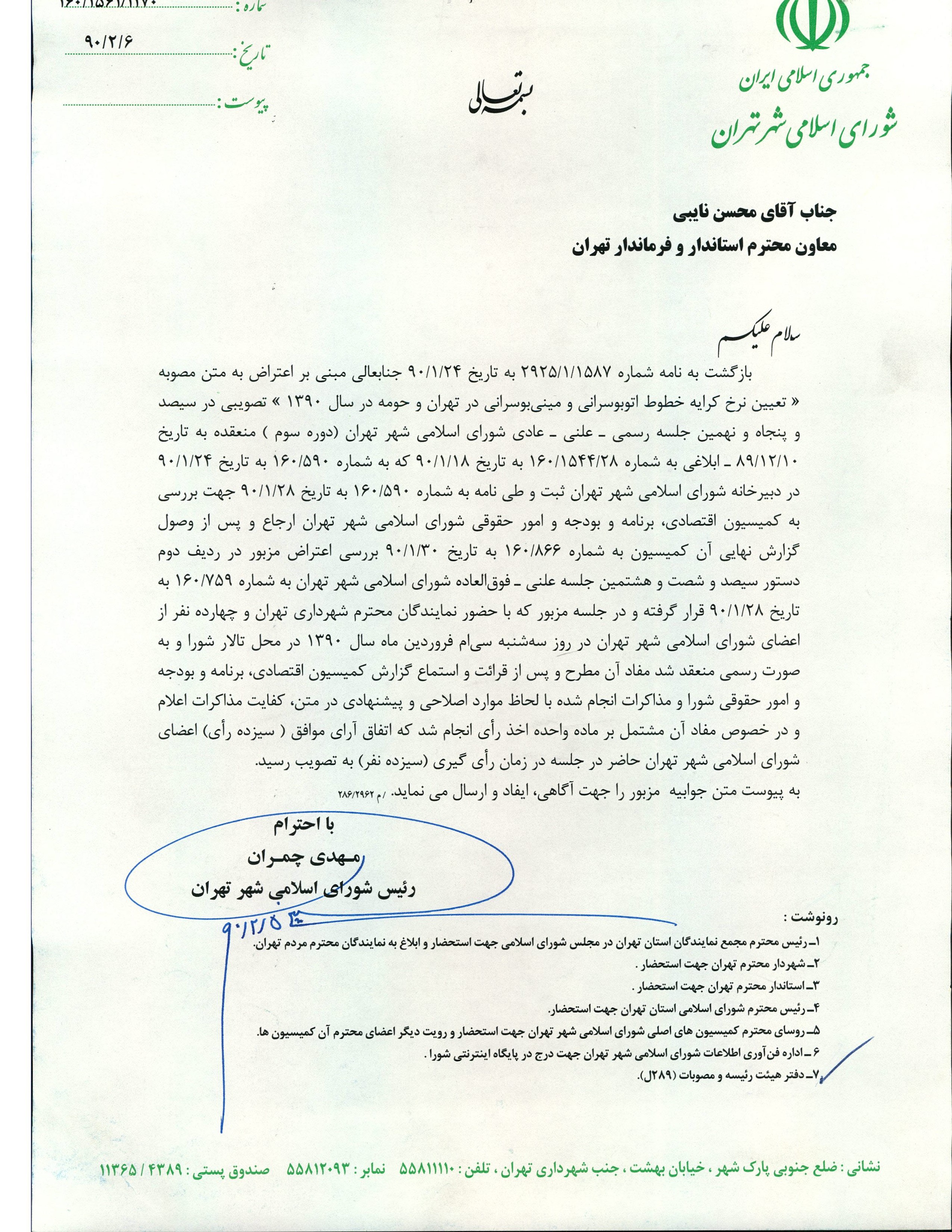 جوابيه شوراي اسلامي شهر تهران به اعتراض شماره 2925/1/1587 به تاريخ 90/1/24 فرمانداري تهران به متن مصوبه «تعيين نرخ كرايه خطوط اتوبوسراني و مينيبوسراني در شهر تهران و حومه در سال 1390»ـ تصويبي در سيصد و پنجاه و نهمين جلسه رسمي ـ علني ـ عادي شوراي اسلامي شهر تهران (دوره سوم) منعقده به تاريخ 89/12/10 ـ ابلاغي به شماره 160/1544/28 به تاريخ 90/1/18"