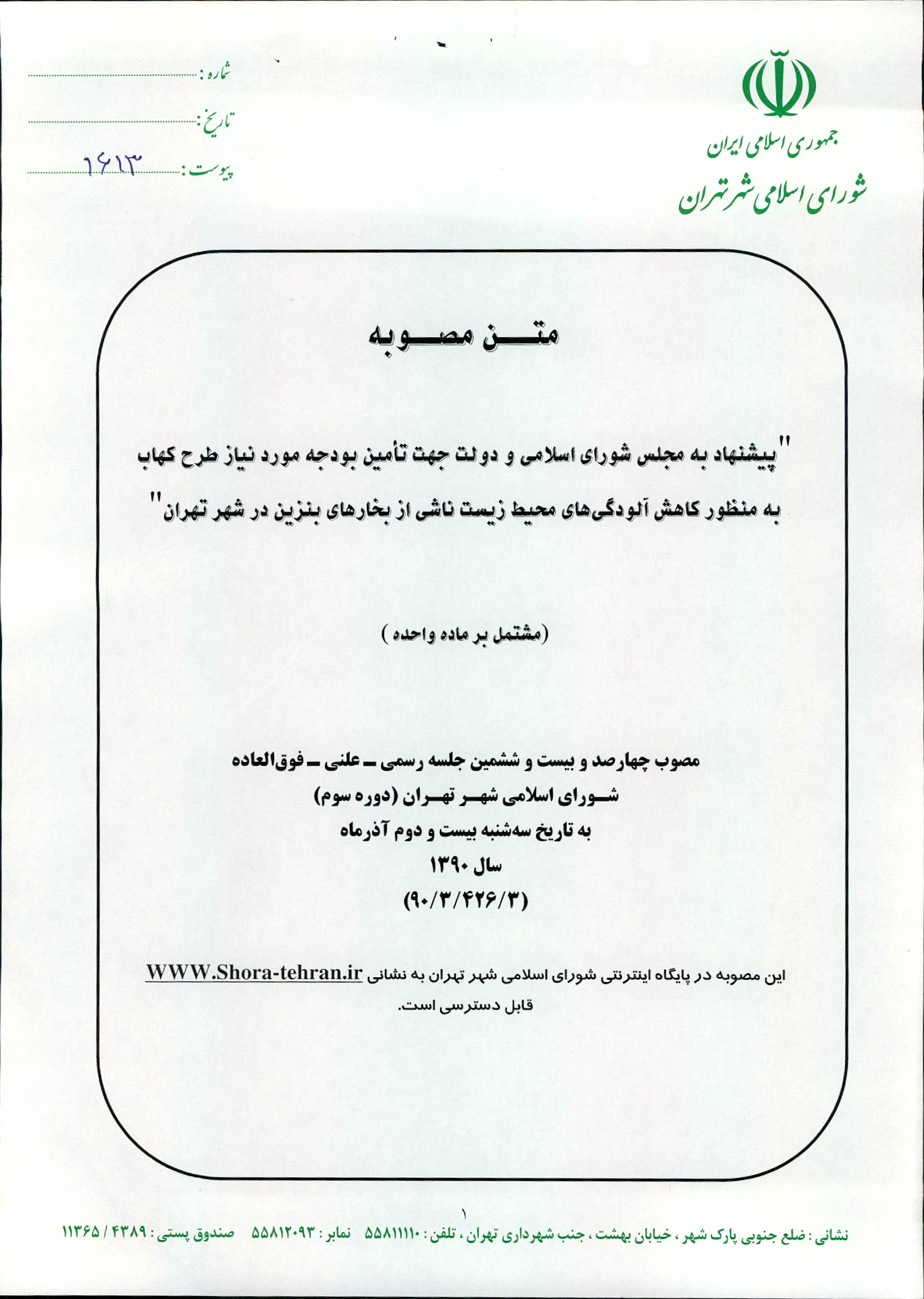 پيشنهاد به مجلس شوراي اسلامي و دولت جهت تأمين بودجه مورد نياز طرح كهاب به منظور كاهش آلودگيهاي محيط زيست از بخارهاي بنزين در شهر تهران