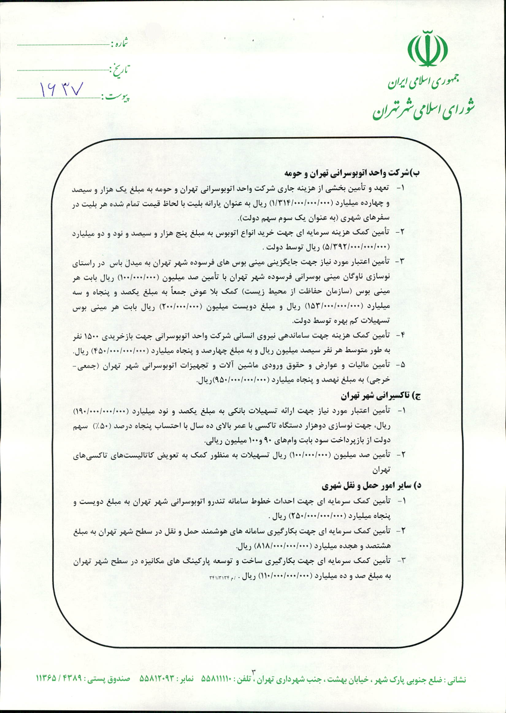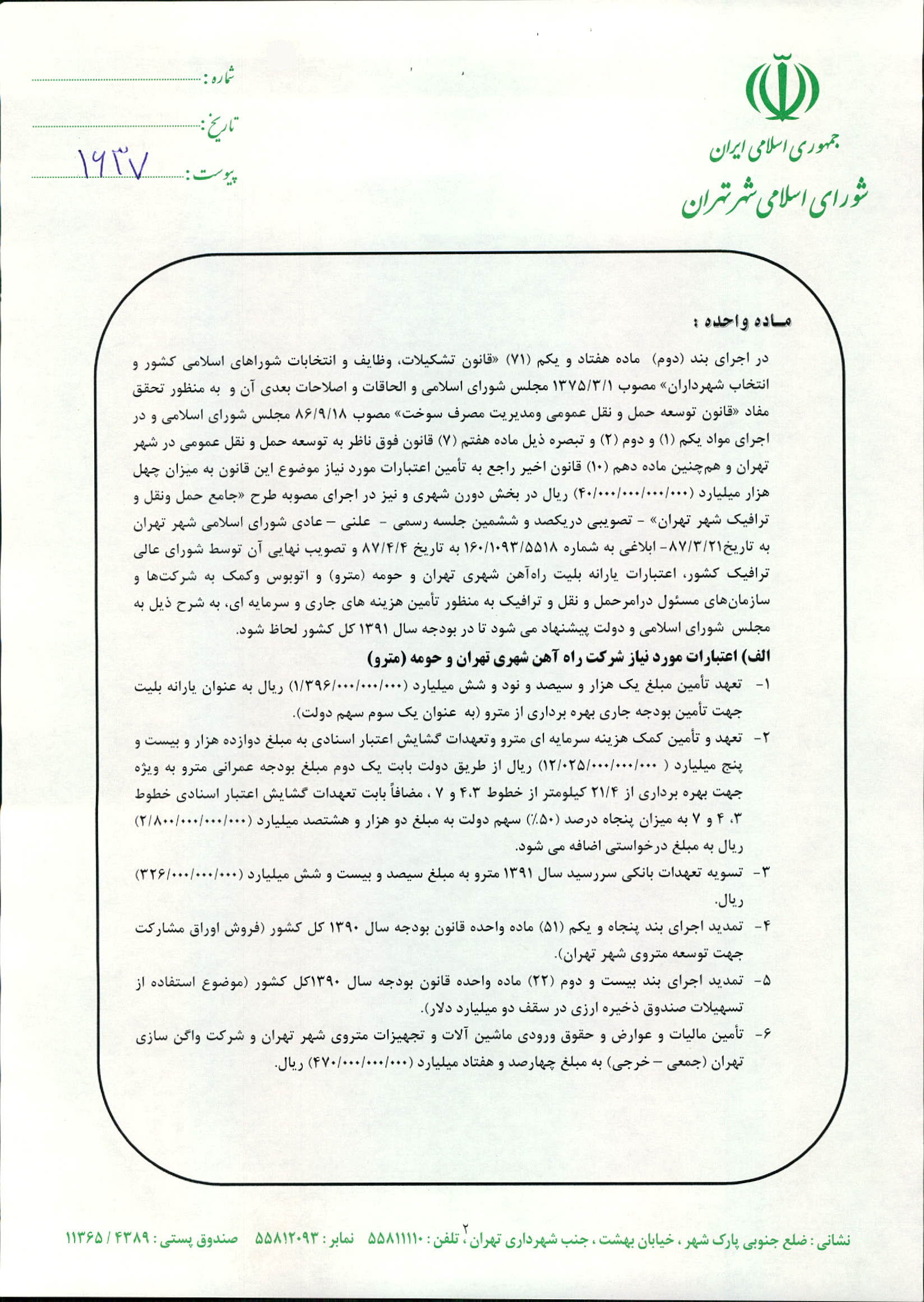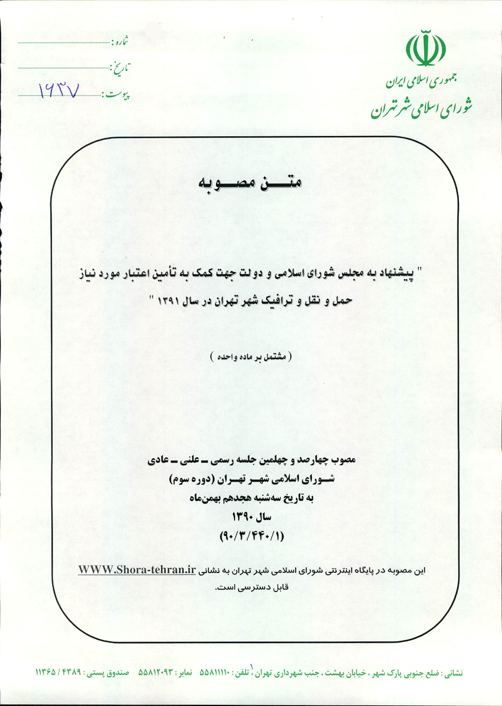 پیشنهاد به مجلس شورای اسلامی و دولت جهت کمک به تأمین اعتبار مورد نیاز حمل و نقل و ترافیک شهر تهران در سال 1391