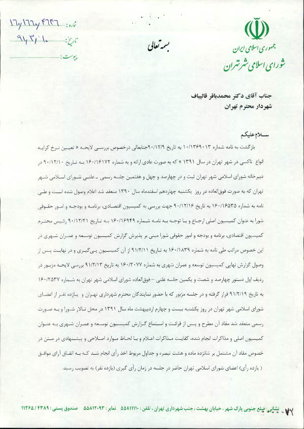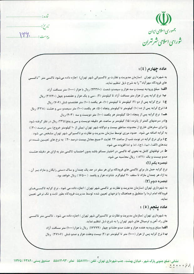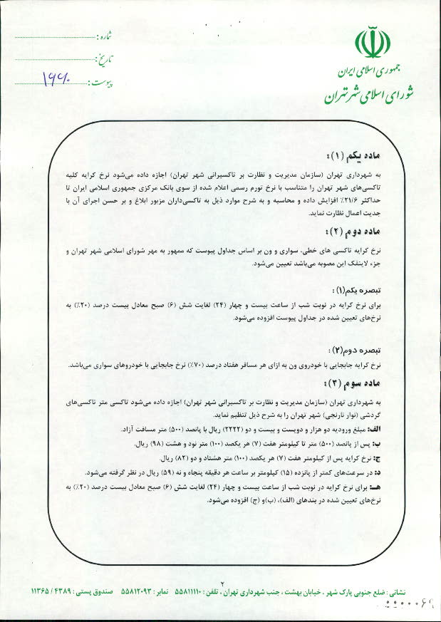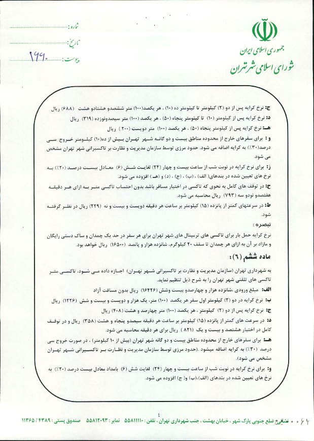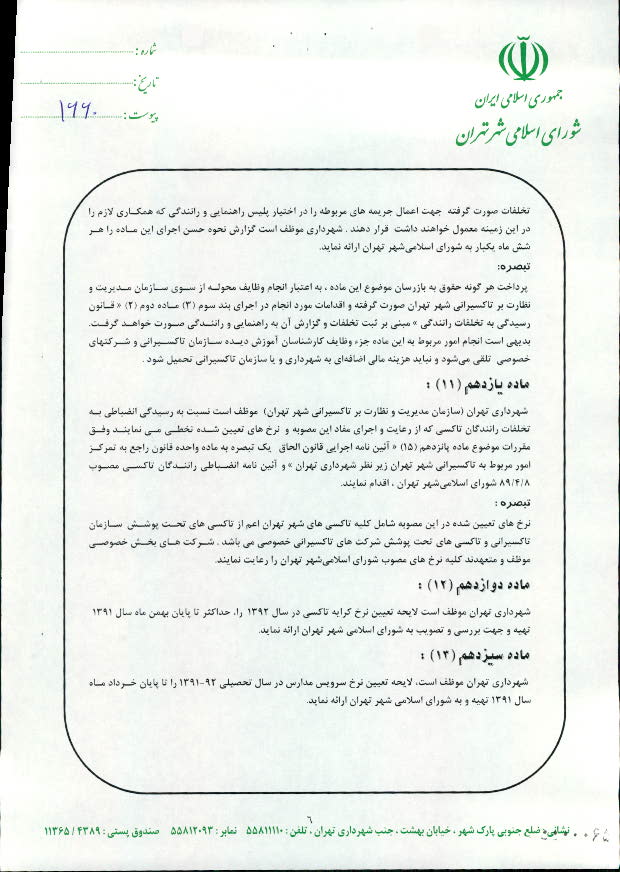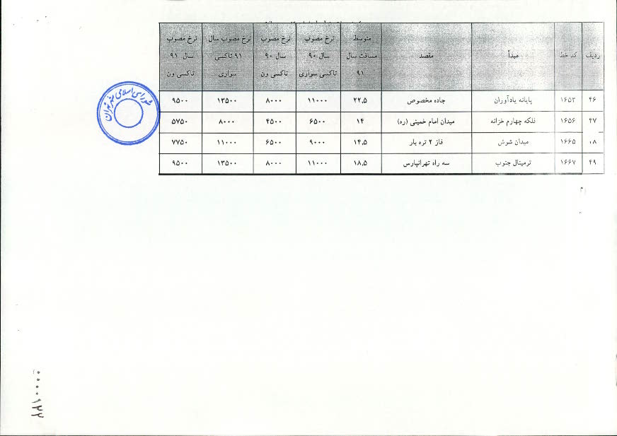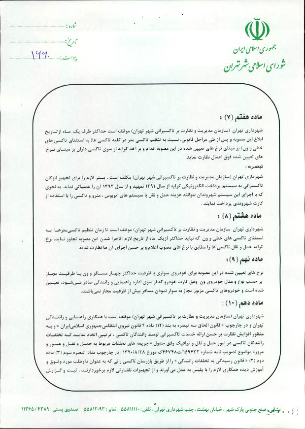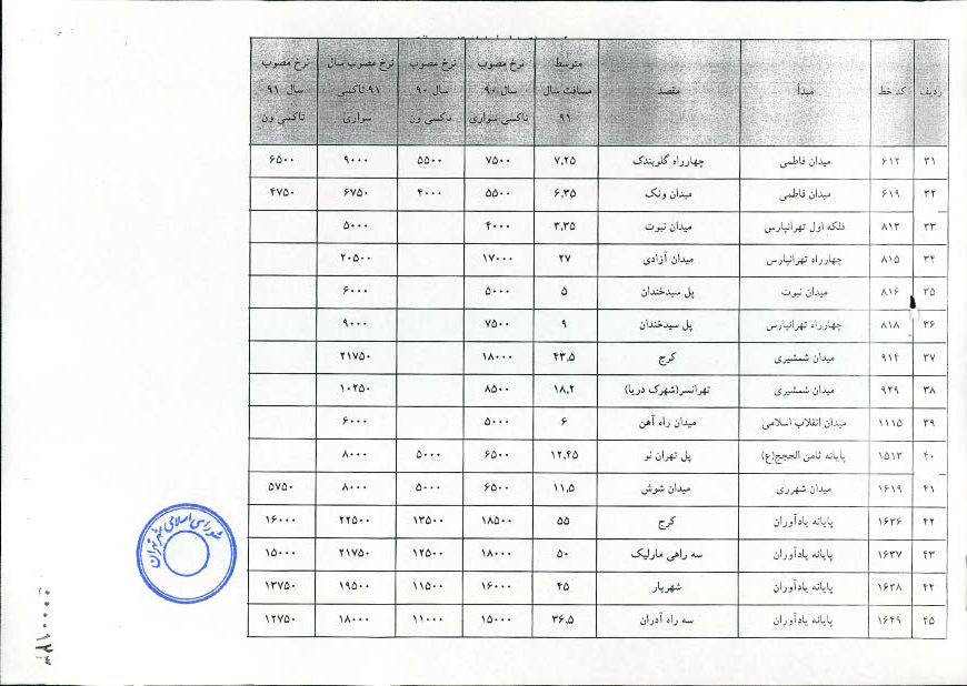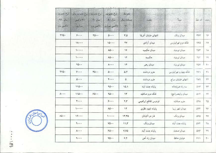 تعيين نرخ كرايه انواع تاكسي در سال 1391 در شهر تهران