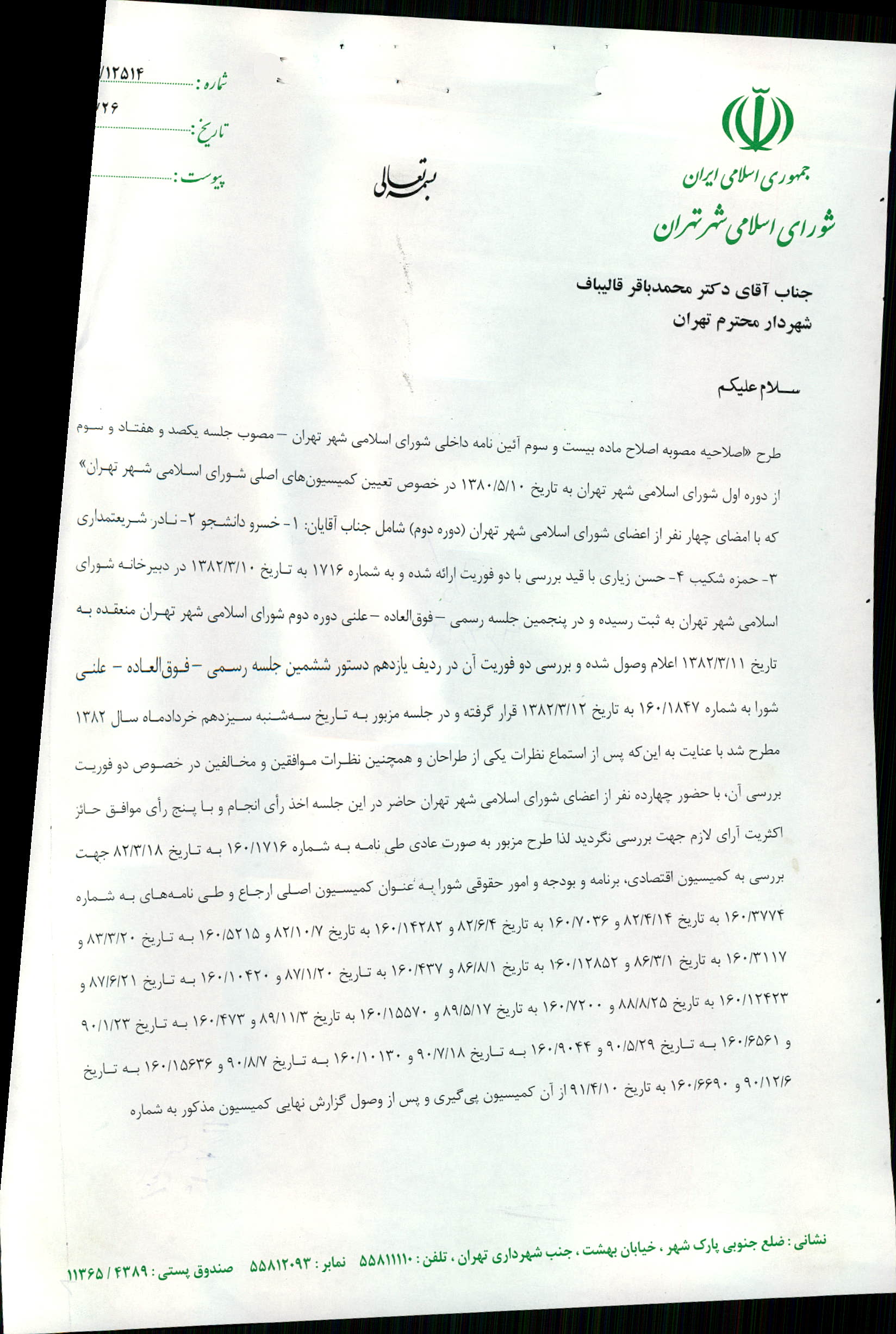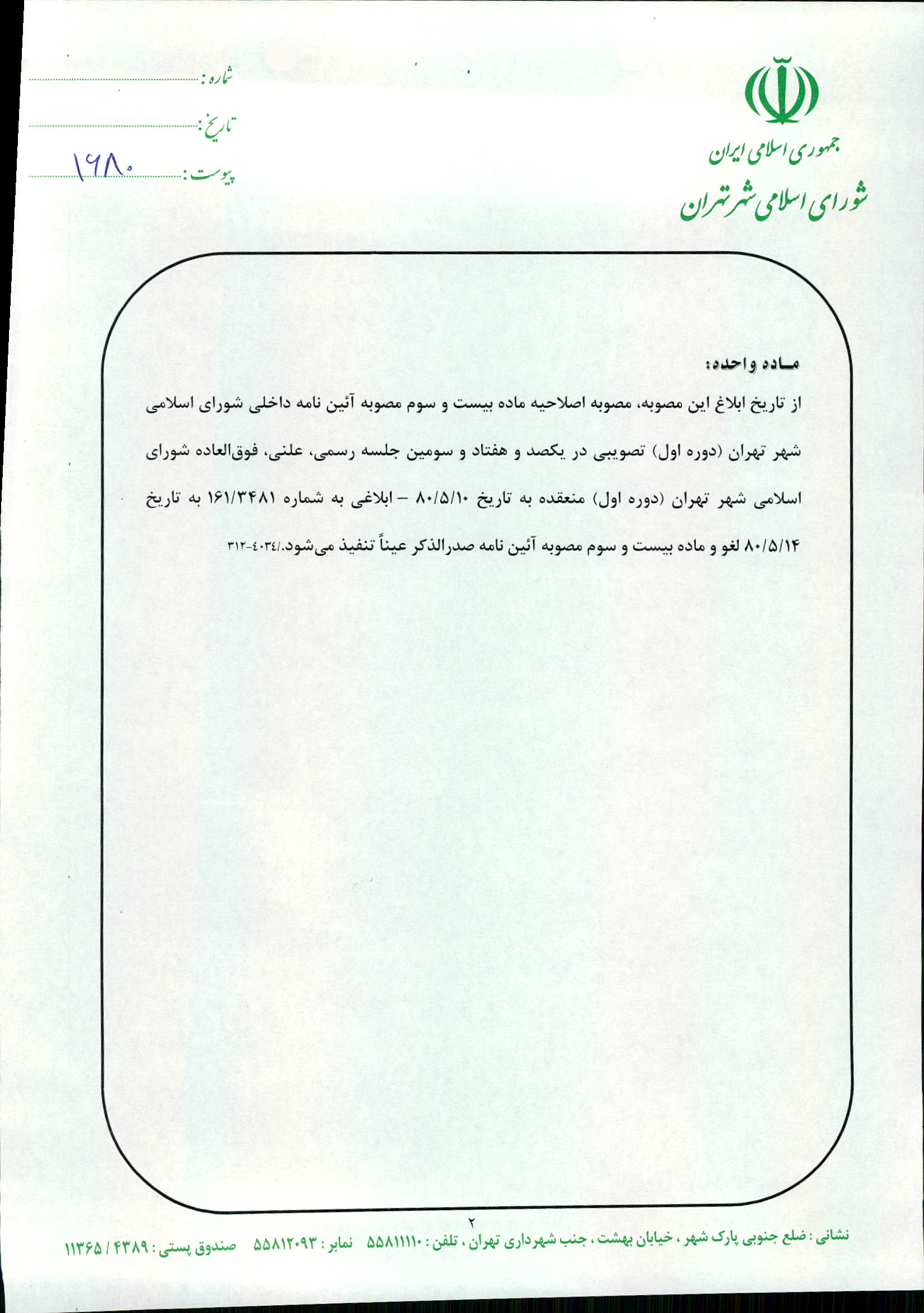 تنفيذ و تأييد متن ماده بيست و سوم مصوبه آييننامه داخلي شوراي اسلامي شهر تهران مصوب اولين جلسه شوراي اسلامي شهر تهران (دوره اول) منعقده به تاريخ 78/2/9 و لغو مصوبه اصلاحيه ماده بيست و سوم آييننامه داخلي شوراي اسلامي شهر تهران تصويبي در يكصد و هفتاد و سومين جلسه رسمي، علني، فوقالعاده شوراي اسلامي شهر تهران (دوره اول) منعقده به تاريخ 80/5/10 ابلاغي به شماره 161/3481 به تاريخ 80/5/14