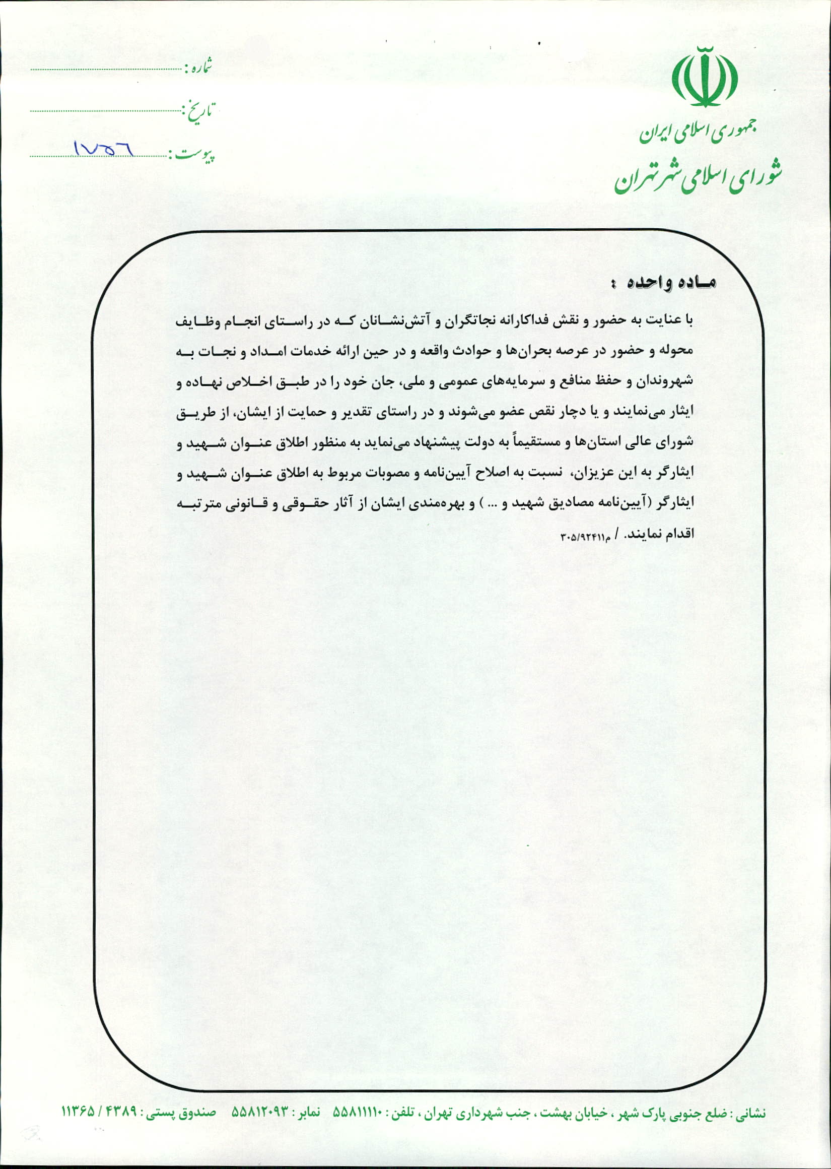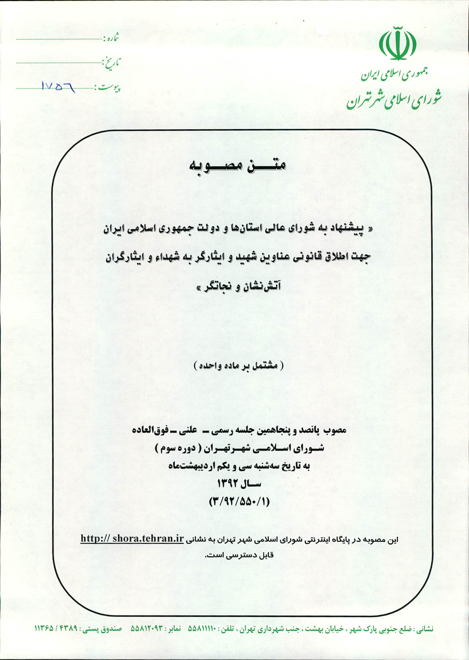پیشنهاد به شورای عالی استانها و دولت جمهوری اسلامی ایران جهت اطلاق قانونی عناوین شهید و ایثارگر به شهدا و ایثارگران آتشنشانی و نجاتگر