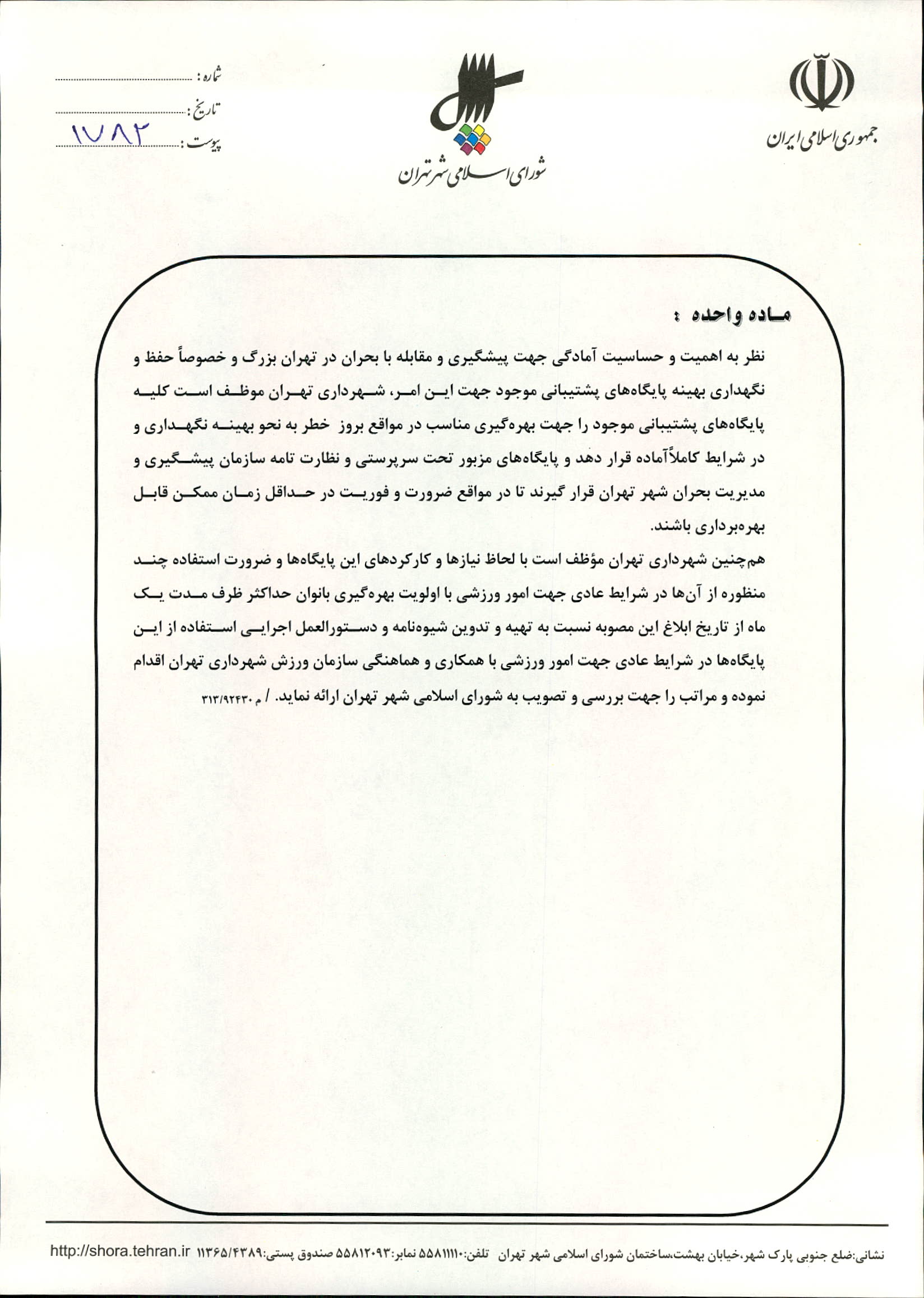 الزام شهرداری تهران به در اختیار قرار دادن کلیه پایگاههای پشتیبانی مدیریت بحران مناطق بیست و دوگانه شهر تهران به سازمان پیشگیری و مدیریت بحران شهر تهران