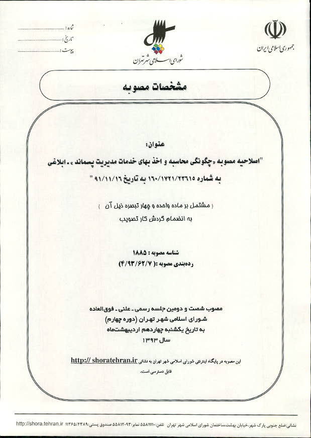 اصلاحيه مصوبه «چگونگي محاسبه و اخذ بهاي خدمات مديريت پسماند» ابلاغي به شماره 160/1721/23615 به تاريخ 91/11/16