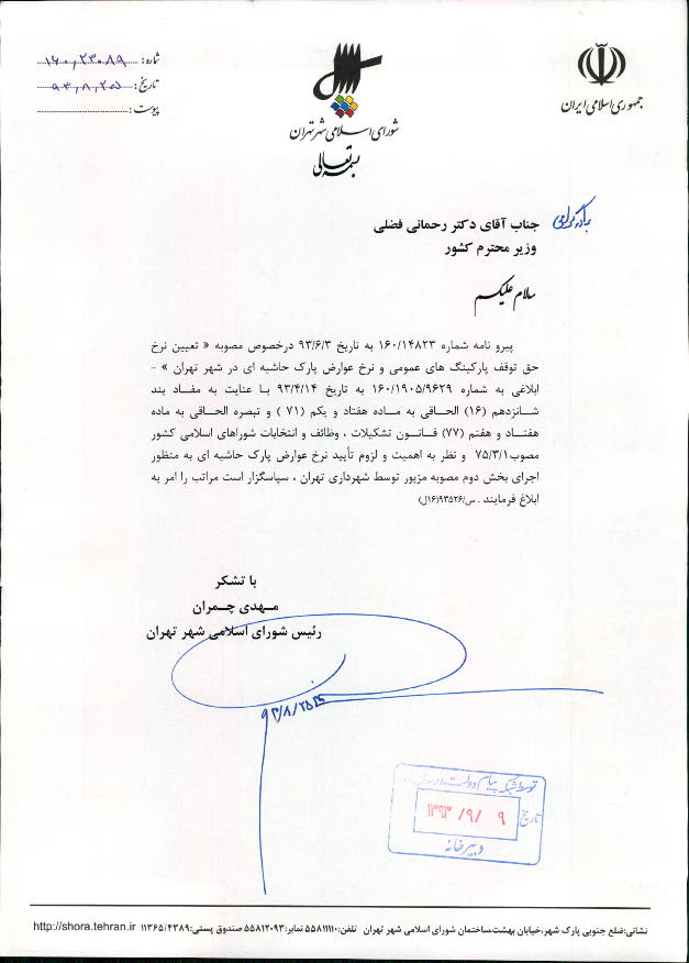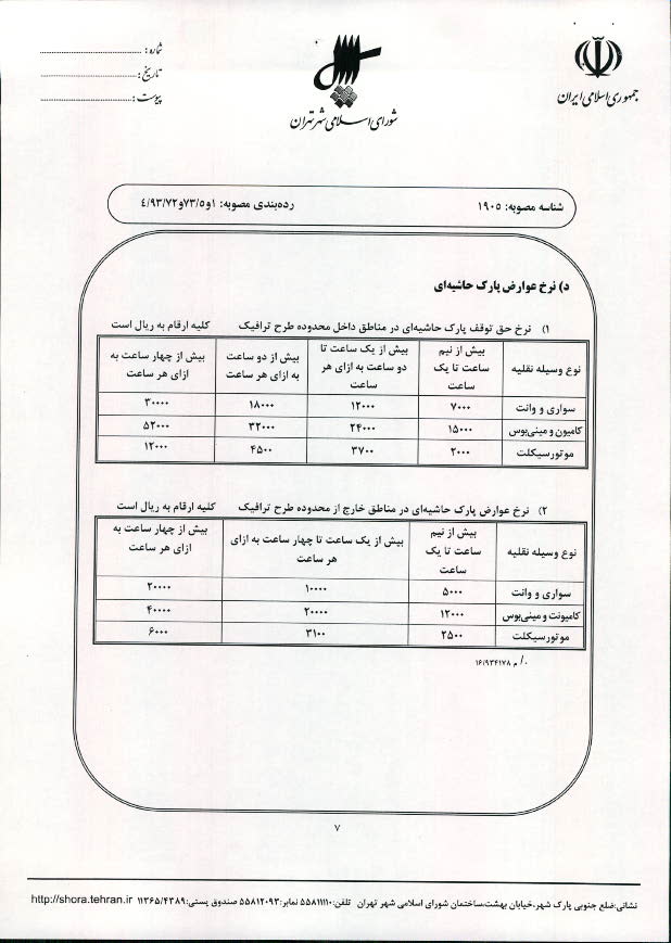 تعيين نرخ حق توقف پاركينگهاي عمومي و نرخ عوارض پارك حاشيهاي در شهر تهران