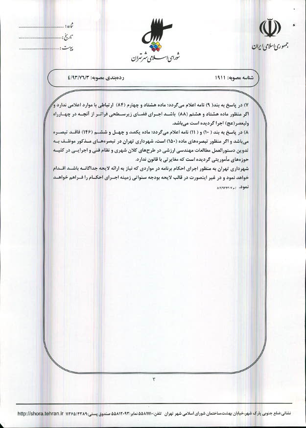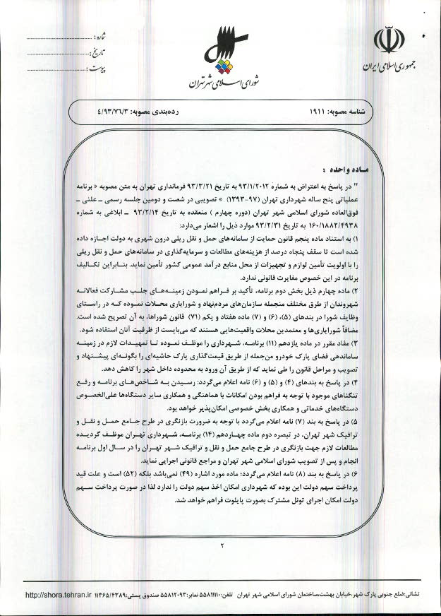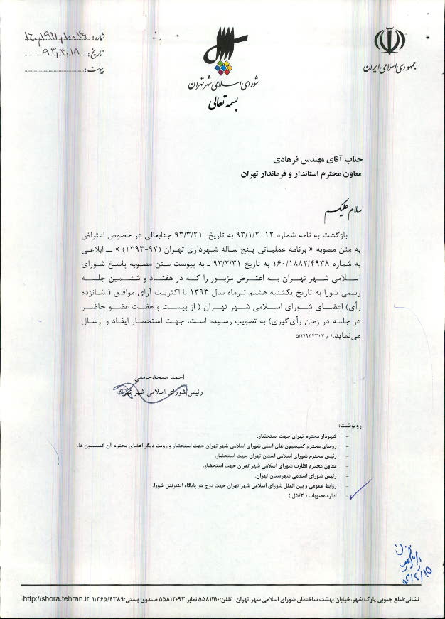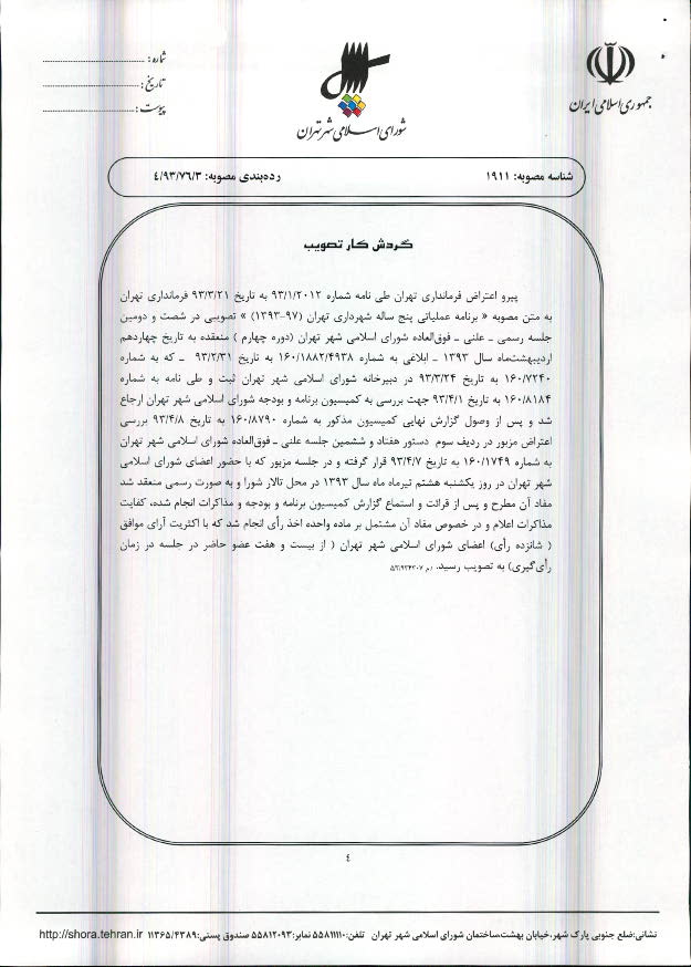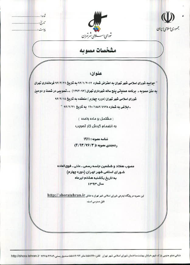 جوابيه شوراي اسلامي شهر تهران به اعتراض شماره 93/1/2012 به تاريخ 93/3/21 فرمانداري تهران به متن مصوبه «برنامه عملياتي پنج ساله شهرداري تهران (97-1393)» تصويبي در شصت و دومين جلسه شوراي اسلامي شهر تهران (دوره چهارم) منعقده به تاريخ 93/2/14 - ابلاغي به شماره 160/1882/4938 به تاريخ 93/2/31