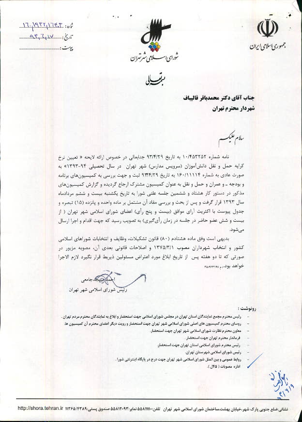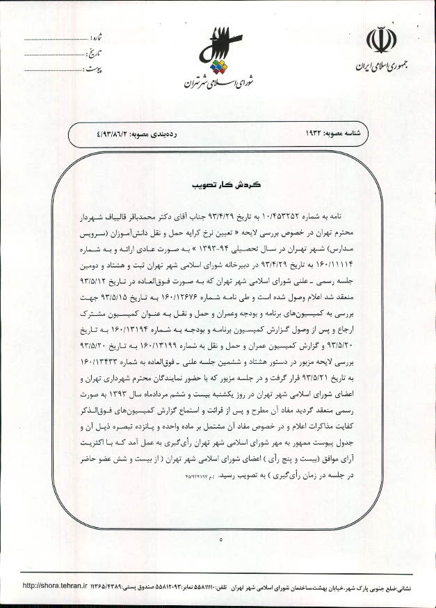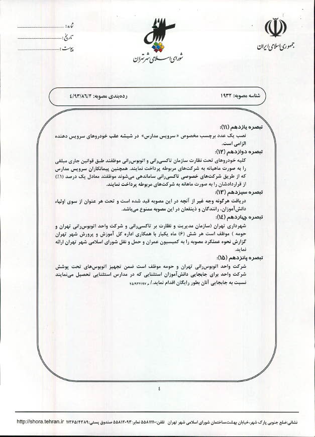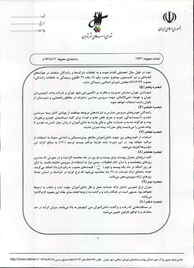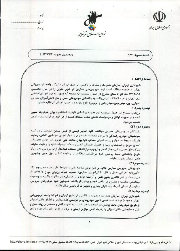 تعيين نرخ كرايه حمل و نقل دانشآموزان (سرويسهاي مدارس) شهر تهران در سال تحصيلي 94-1393