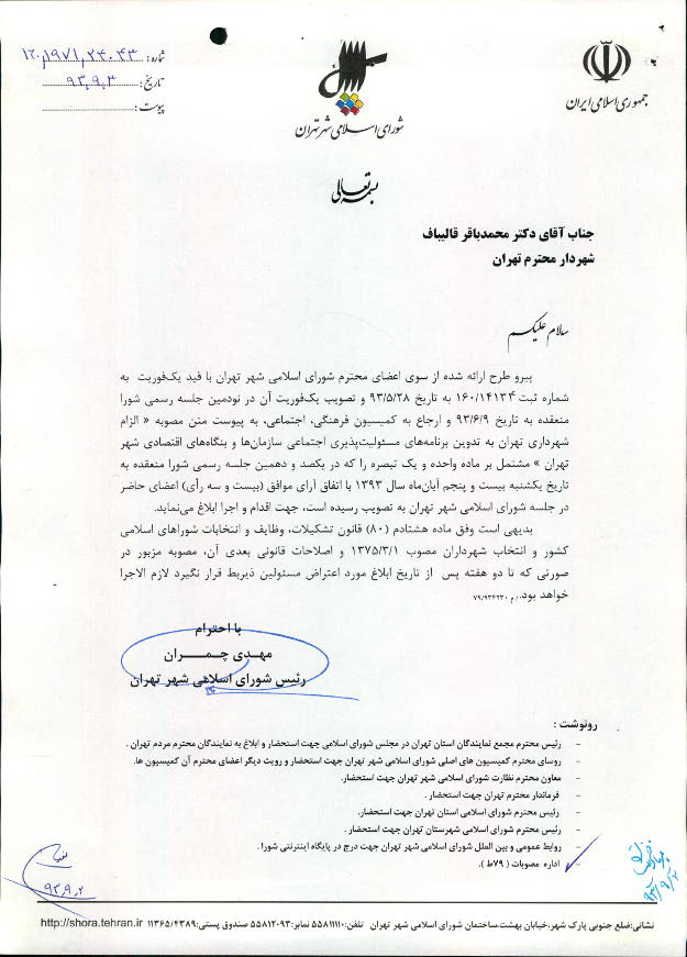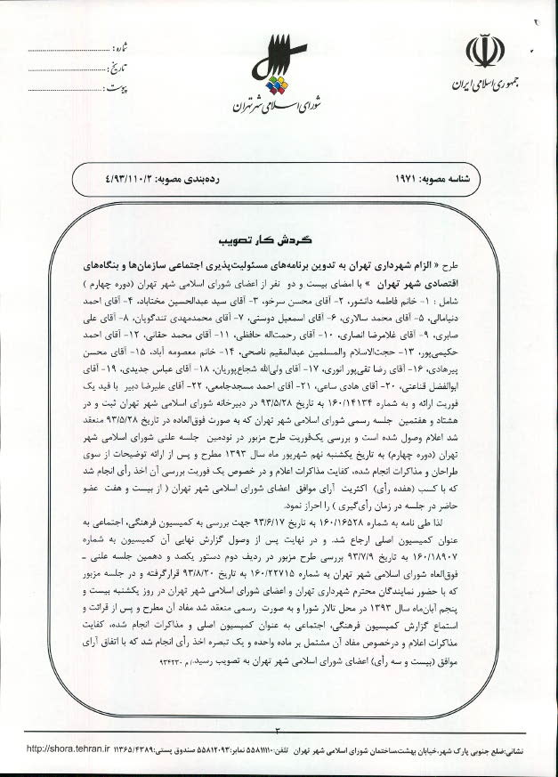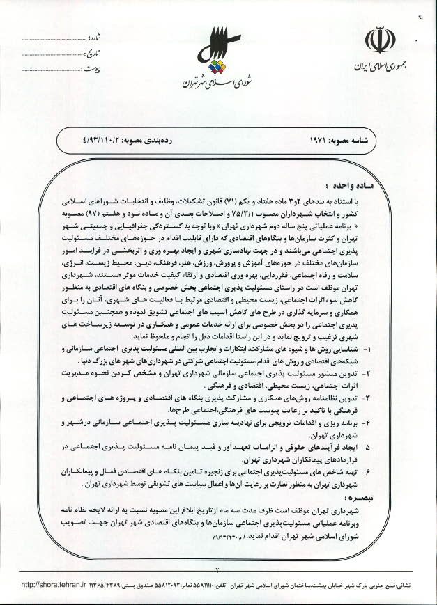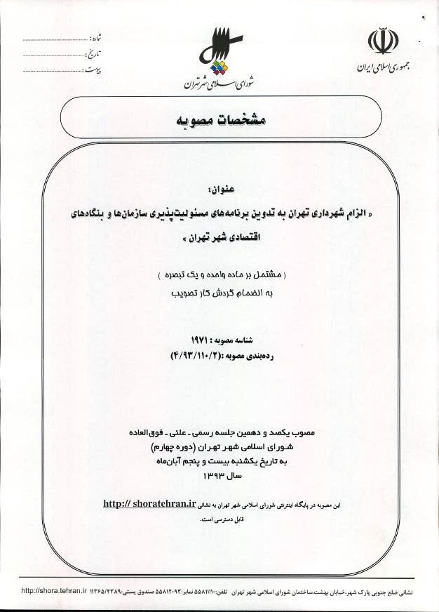 الزام شهرداري تهران به تدوين برنامههاي مسئوليتپذيري سازمانها و بنگاههاي اقتصادي شهر تهران