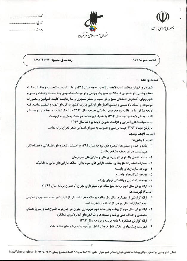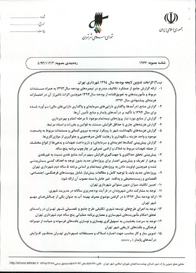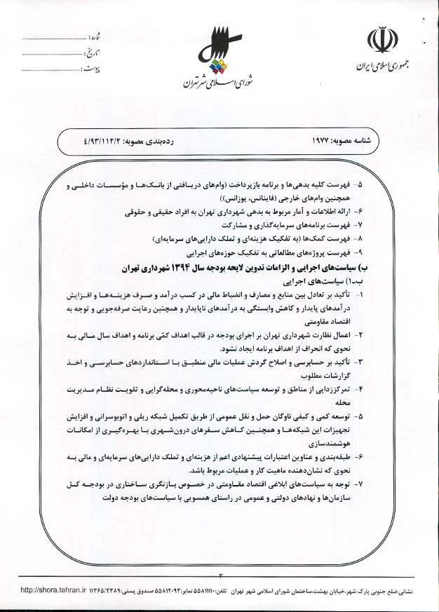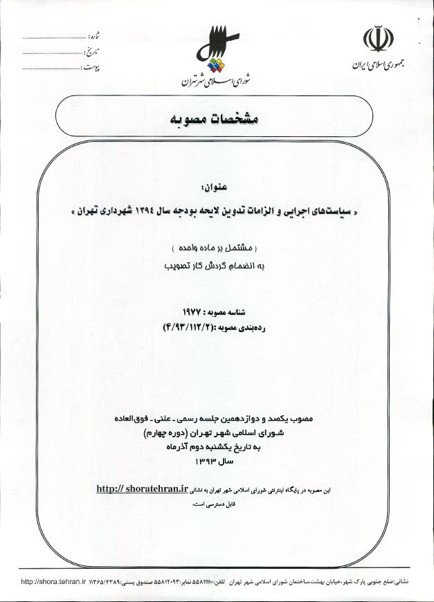 سياستهاي اجرايي و الزامات تدوين لايحه بودجه سال 1394 شهرداري تهران
