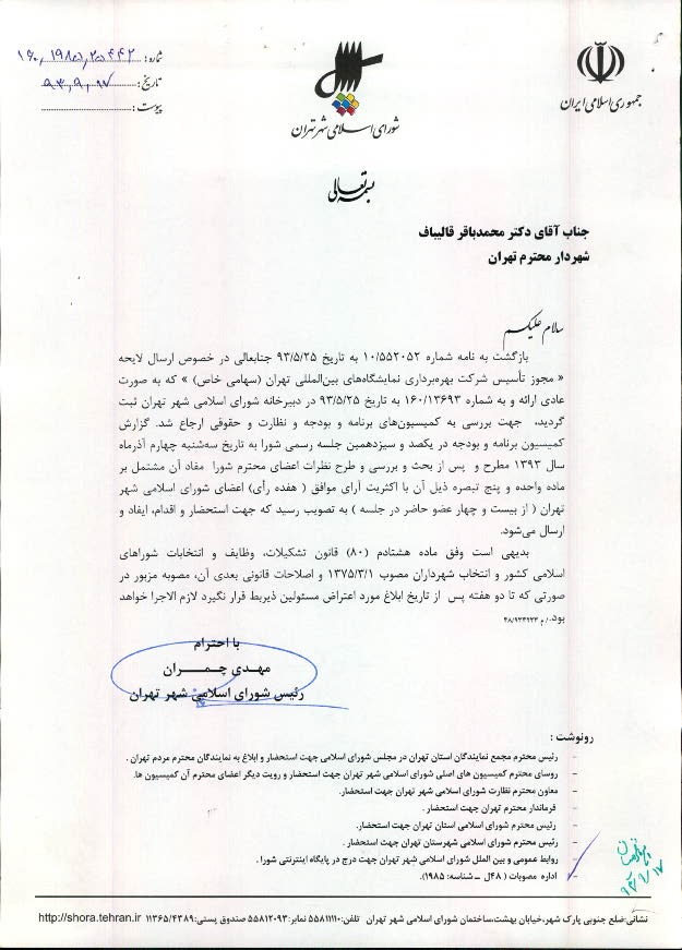 مجوز تأسيس شركت بهرهبرداري نمايشگاههاي بينالمللي شهر آفتاب تهران (سهامي خاص)