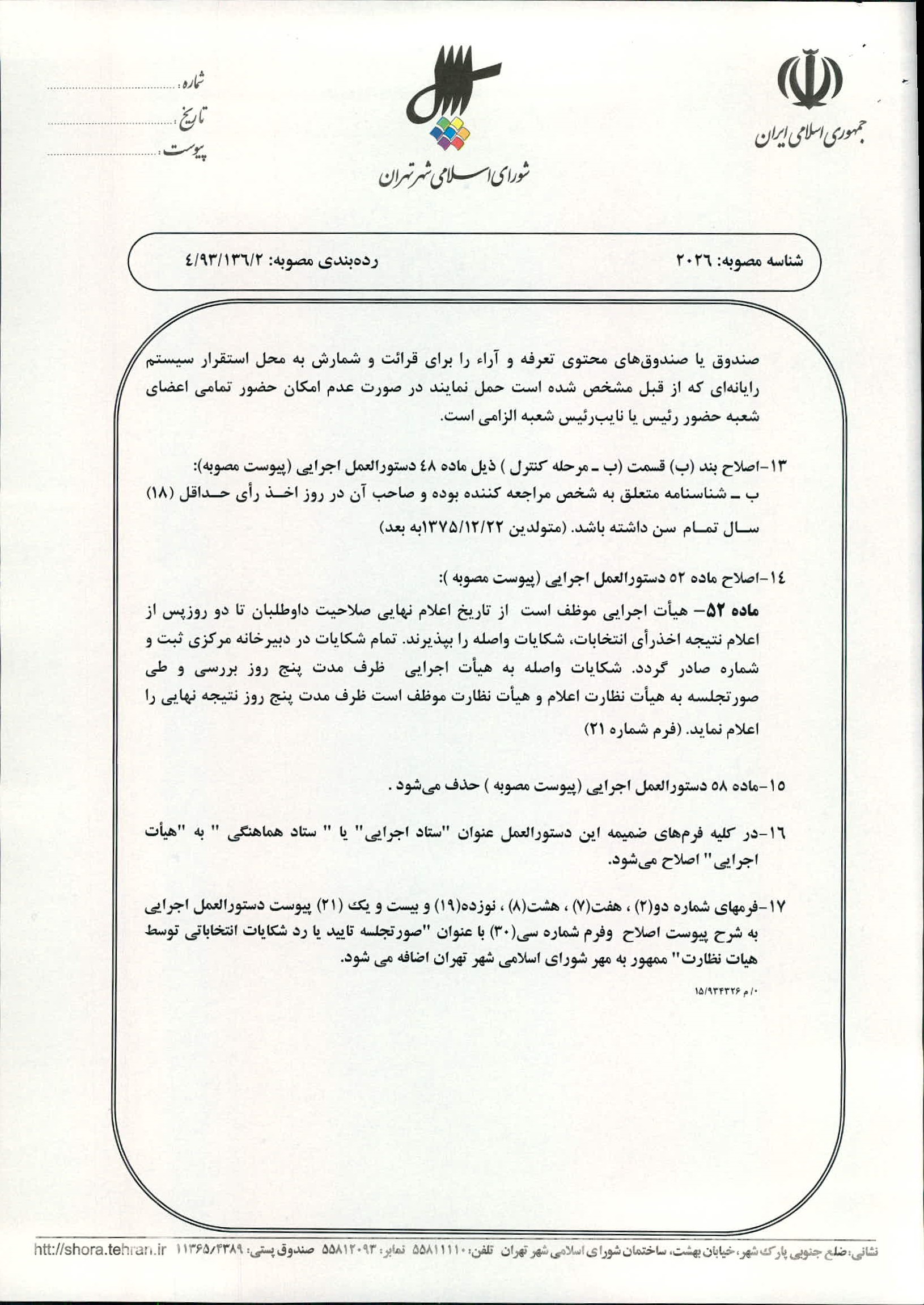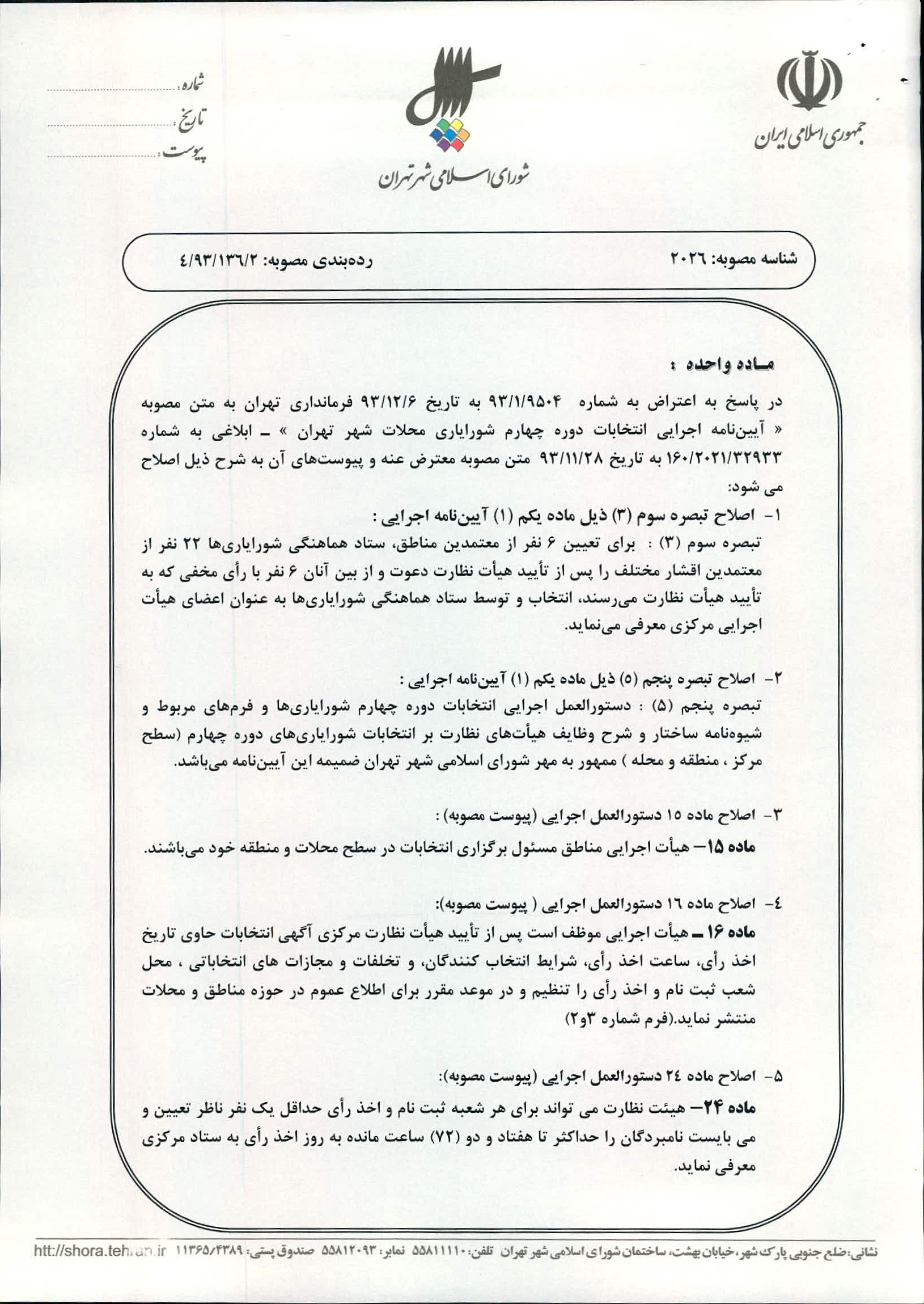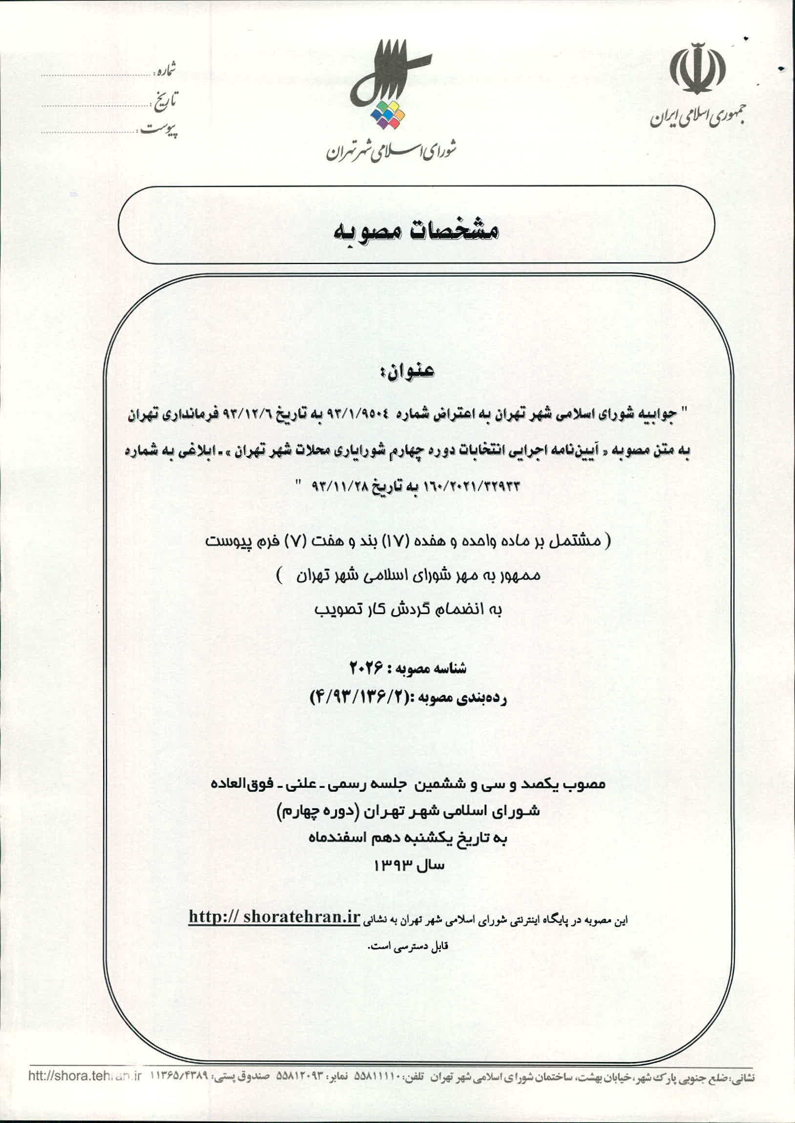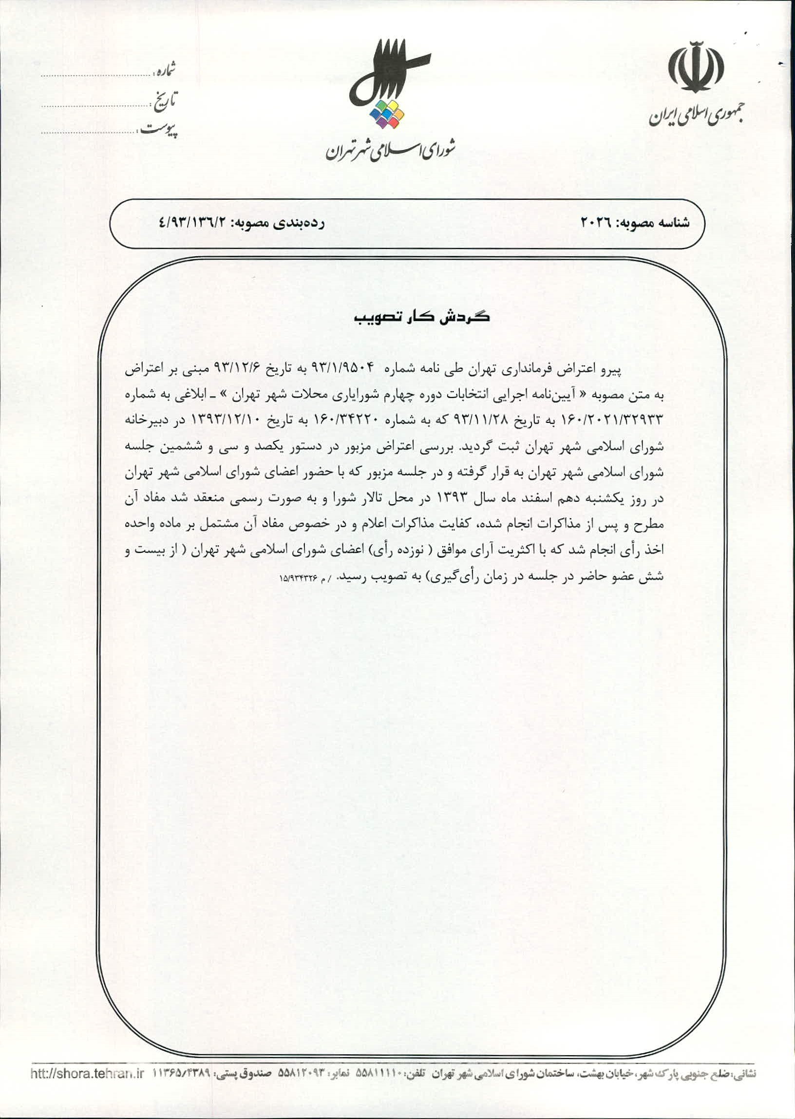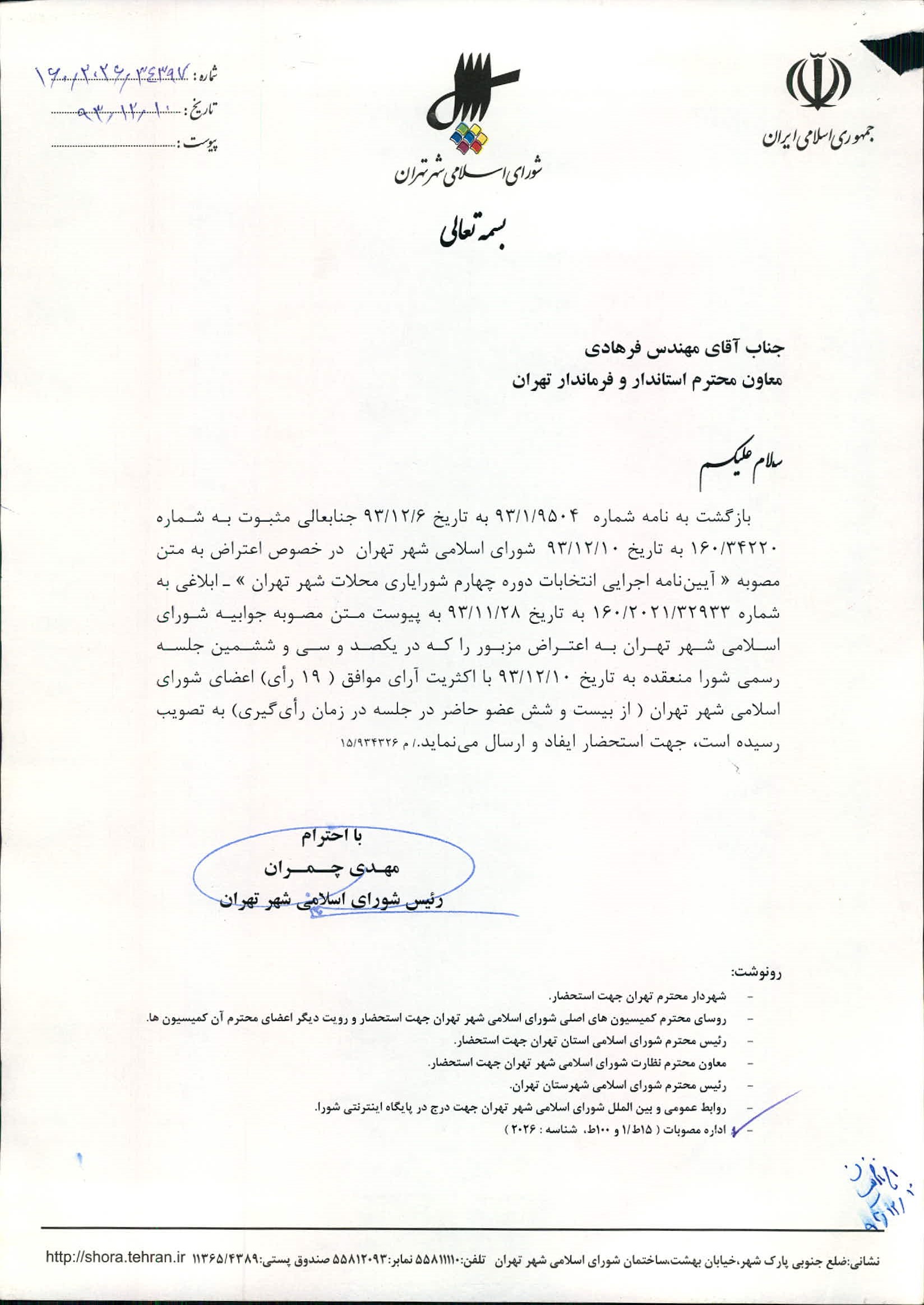 جوابيه شوراي اسلامي شهر تهران به اعتراض شماره شماره 93/1/9504 به تاريخ 93/12/6 فرمانداري تهران به متن مصوبه «آييننامه اجرايي انتخابات دوره چهارم شوراياري محلات شهر تهران»-ابلاغي به شماره 160/2021/32933 به تاريخ 93/11/28