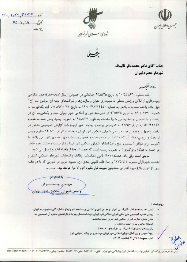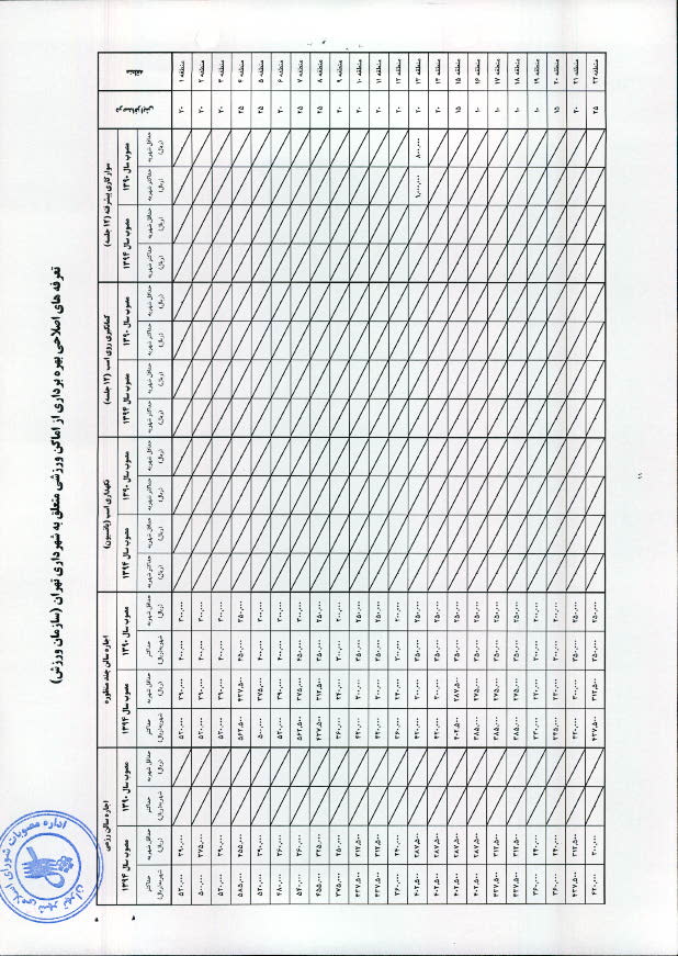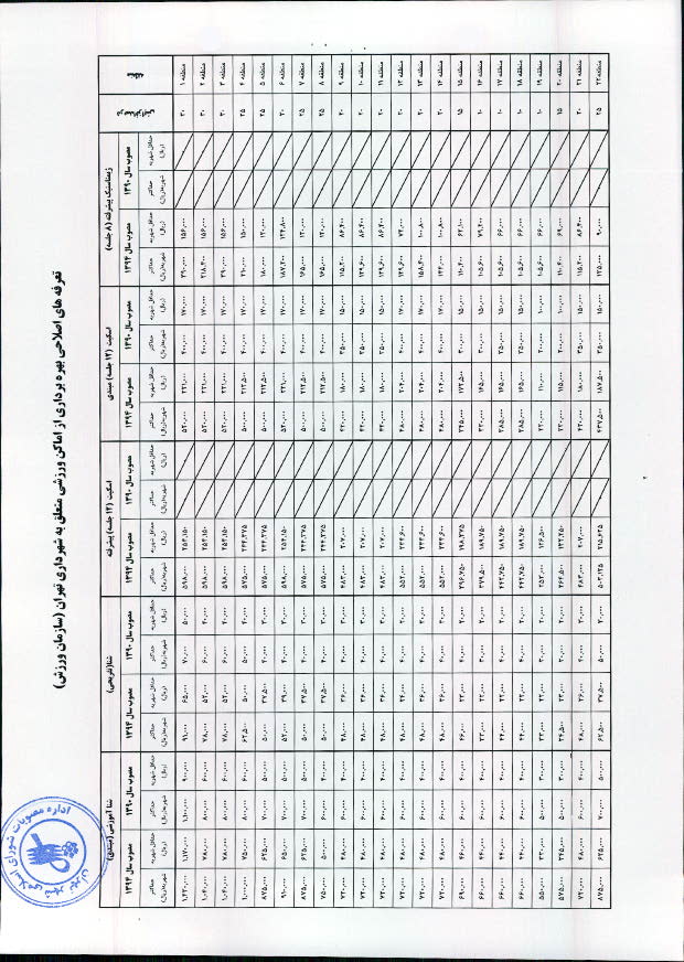 تعرفههاي اصلاحي بهرهبرداري از اماكن ورزشي متعلق به شهرداري تهران و سازمانها و شركتهاي تابعه آن موضوع بند "ح" ذيل مادهواحده مصوبه - ابلاغي به شماره 160/1497/14450 به تاريخ 89/10/12