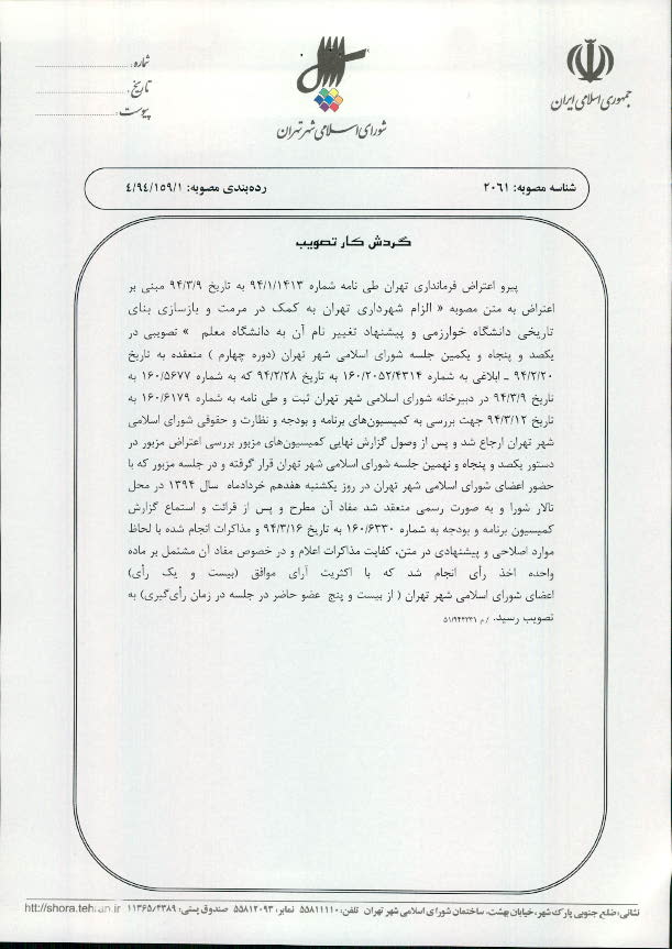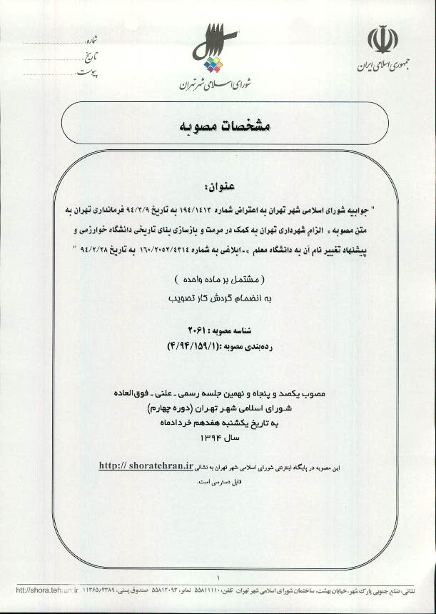 جوابيه شوراي اسلامي شهر تهران به اعتراض شماره 94/1/1413 به تاریخ 94/3/9 فرمانداري تهران به متن مصوبه «الزام شهرداری تهران به کمک در مرمت و بازسازی بنای تاریخی دانشگاه خوارزمی و پیشنهاد تغییر نام آن به دانشگاه معلم» ابلاغي به شماره 160/2052/4314 به تاريخ 94/2/28