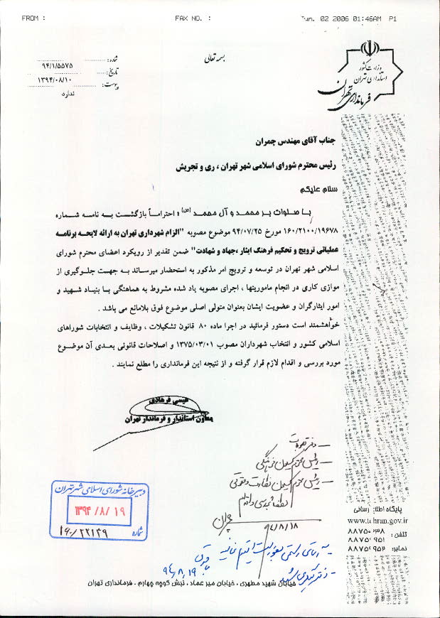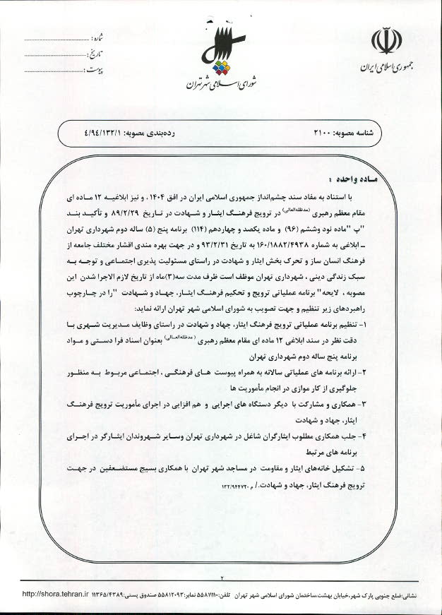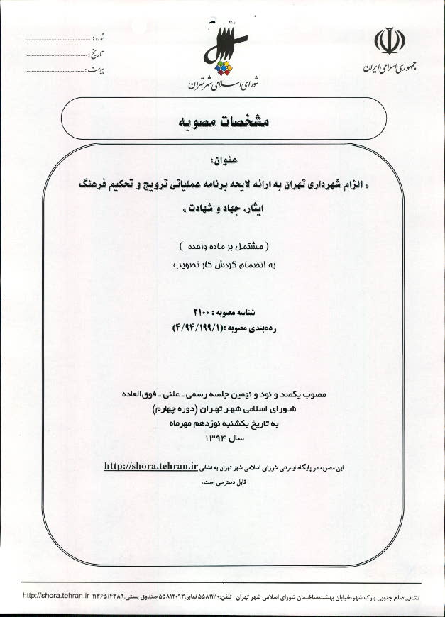 الزام شهرداری تهران به ارائه لایحه برنامه عملیاتی ترویج و تحکیم فرهنگ ایثار، جهاد و شهادت