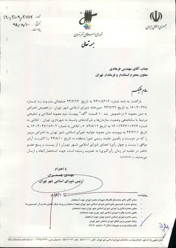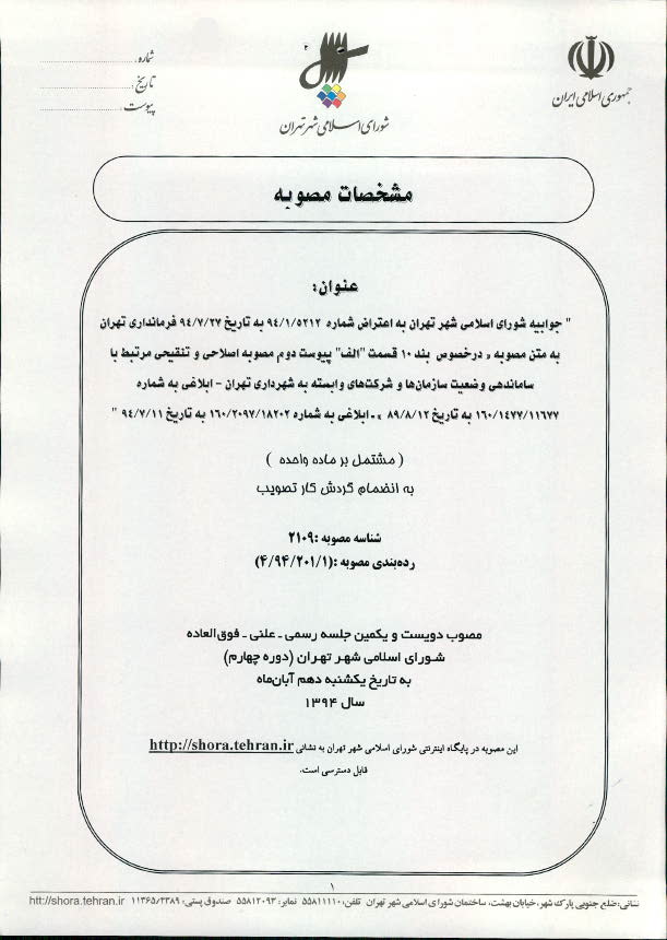 جوابيه شوراي اسلامي شهر تهران به اعتراض شماره 94/1/5212 به تاريخ 94/7/27 فرمانداري تهران به متن مصوبه «در خصوص بند 10 قسمت "الف" پيوست دوم مصوبه اصلاحي و تنقيحي مرتبط با ساماندهي وضعيت سازمانها و شركتهاي وابسته به شهرداري تهران - ابلاغي به شماره 160/1477/11677 به تاريخ 89/8/12»- ابلاغي به شماره 160/2097/18202 به تاريخ 94/7/11