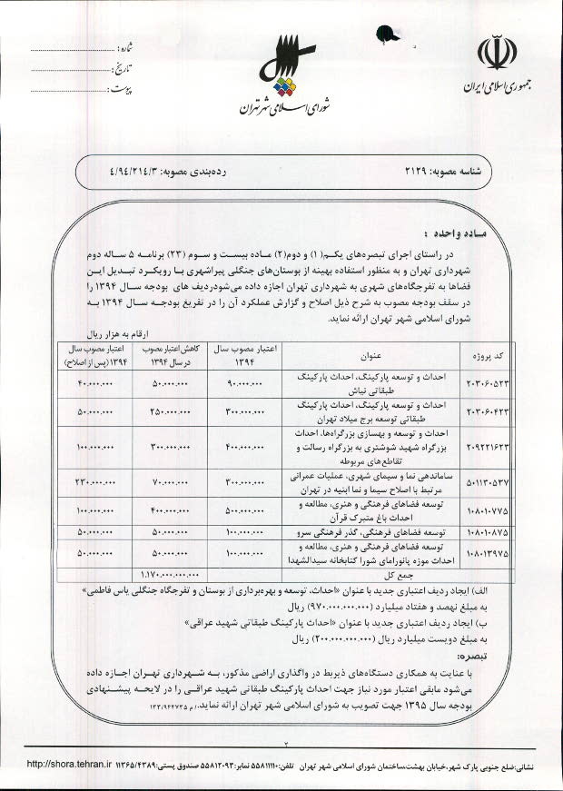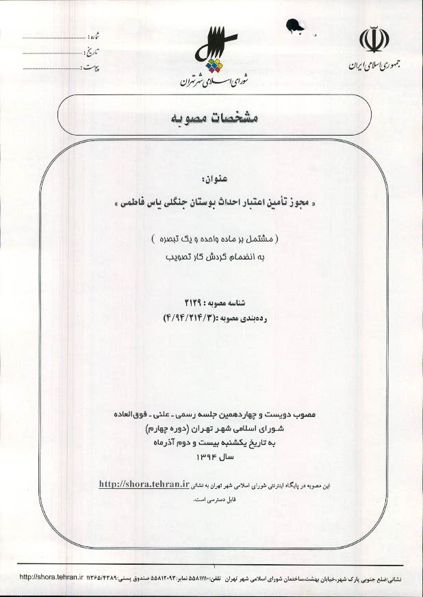مجوز تأمین اعتبار احداث بوستان جنگلی یاس فاطمی