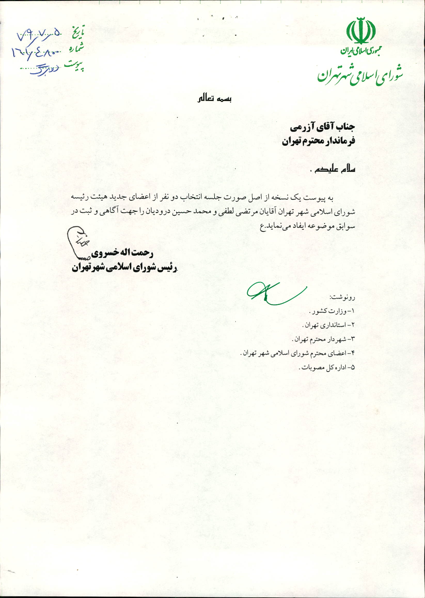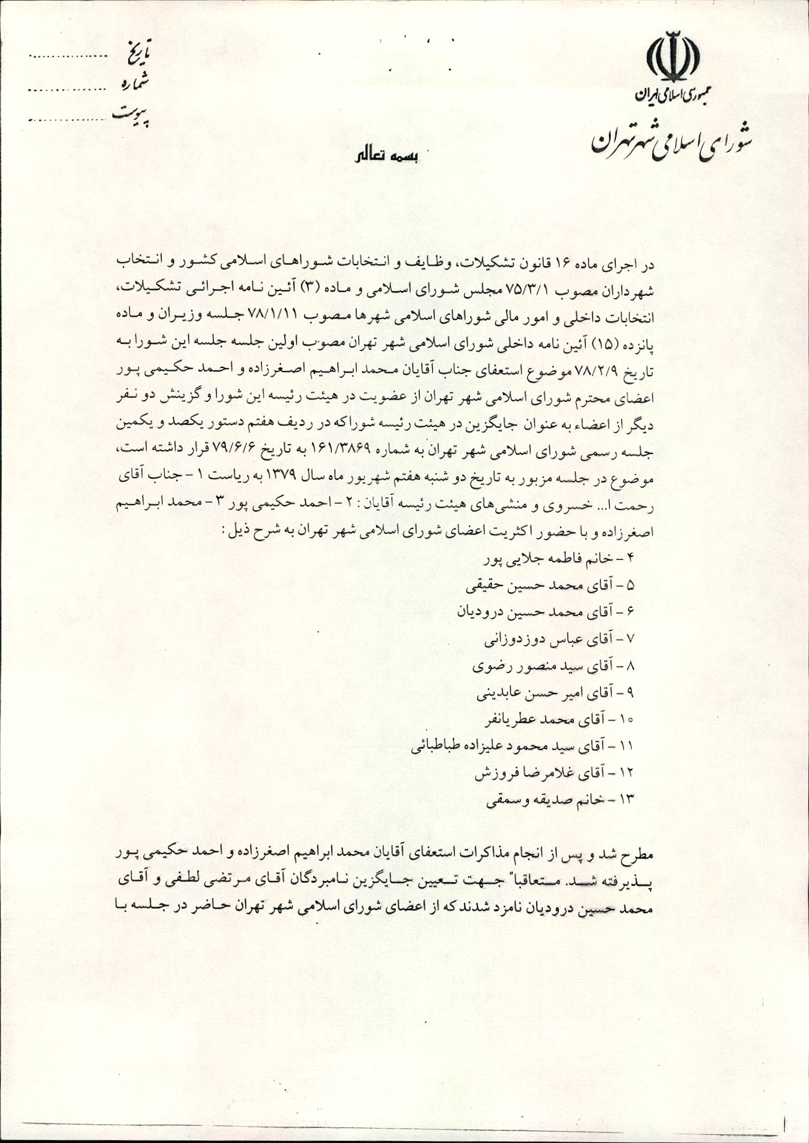 پذيرش استعفاي دو نفر از اعضای هیئترئیسه و انتخاب آقايان مرتضی لطفي و محمدحسین دروديان بهعنوان اعضای هیئترئیسه