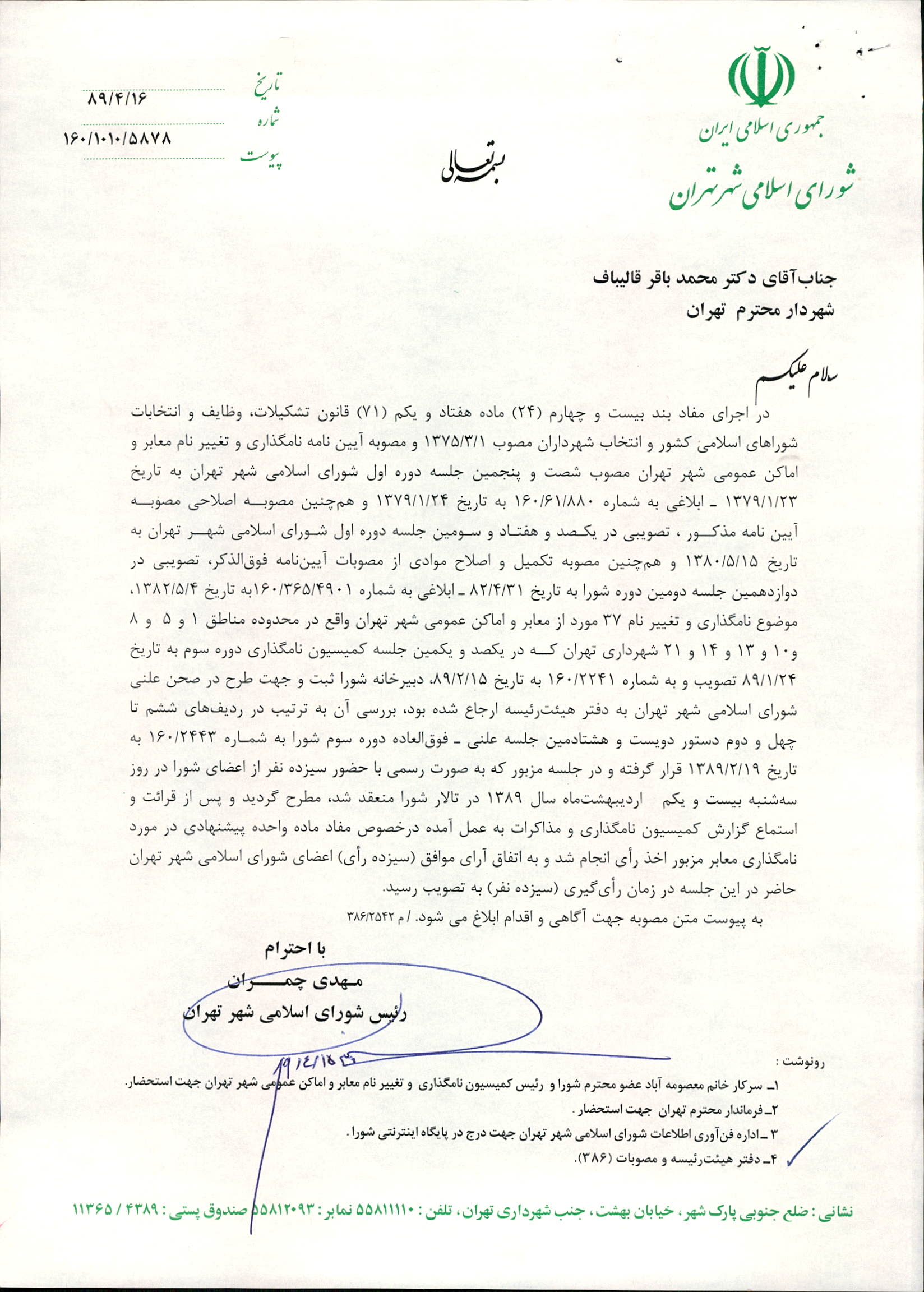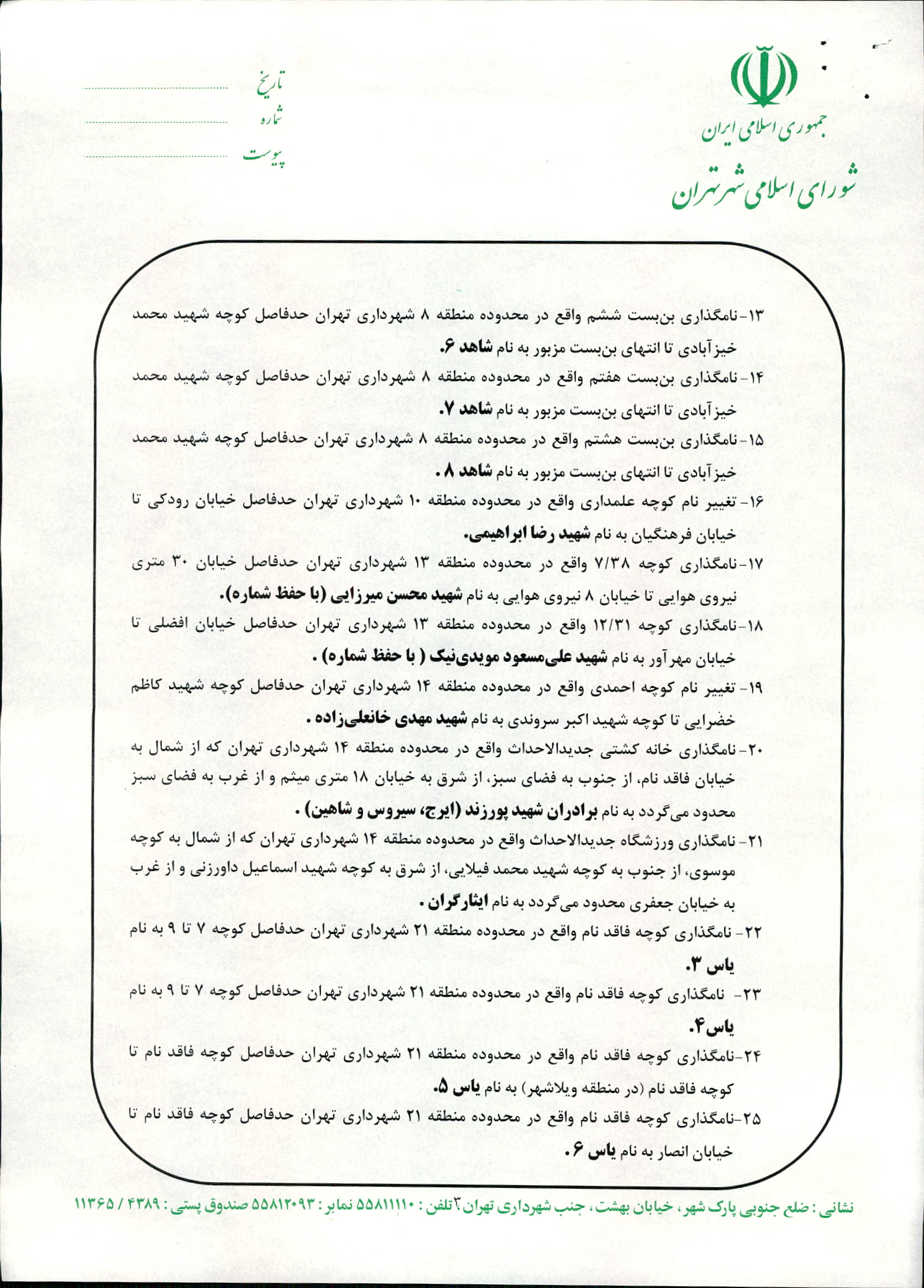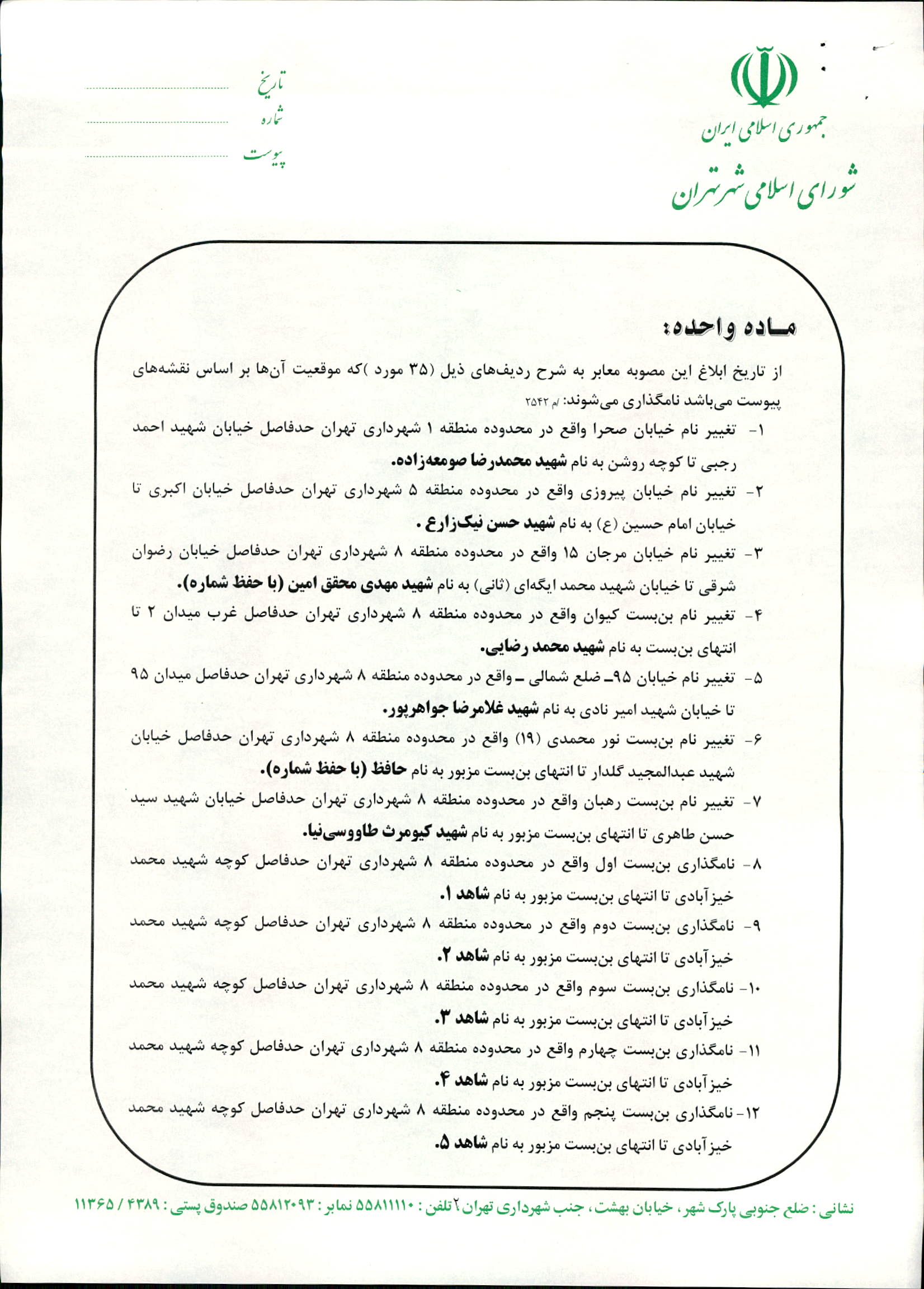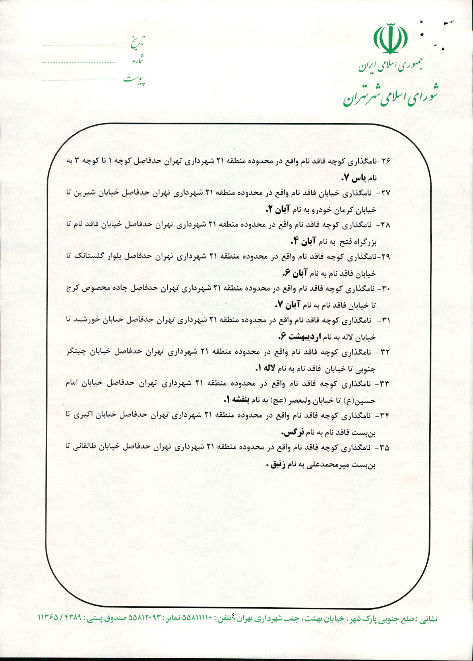 نامگذاري و تغيير نام 35 مورد از معابر شهر تهران