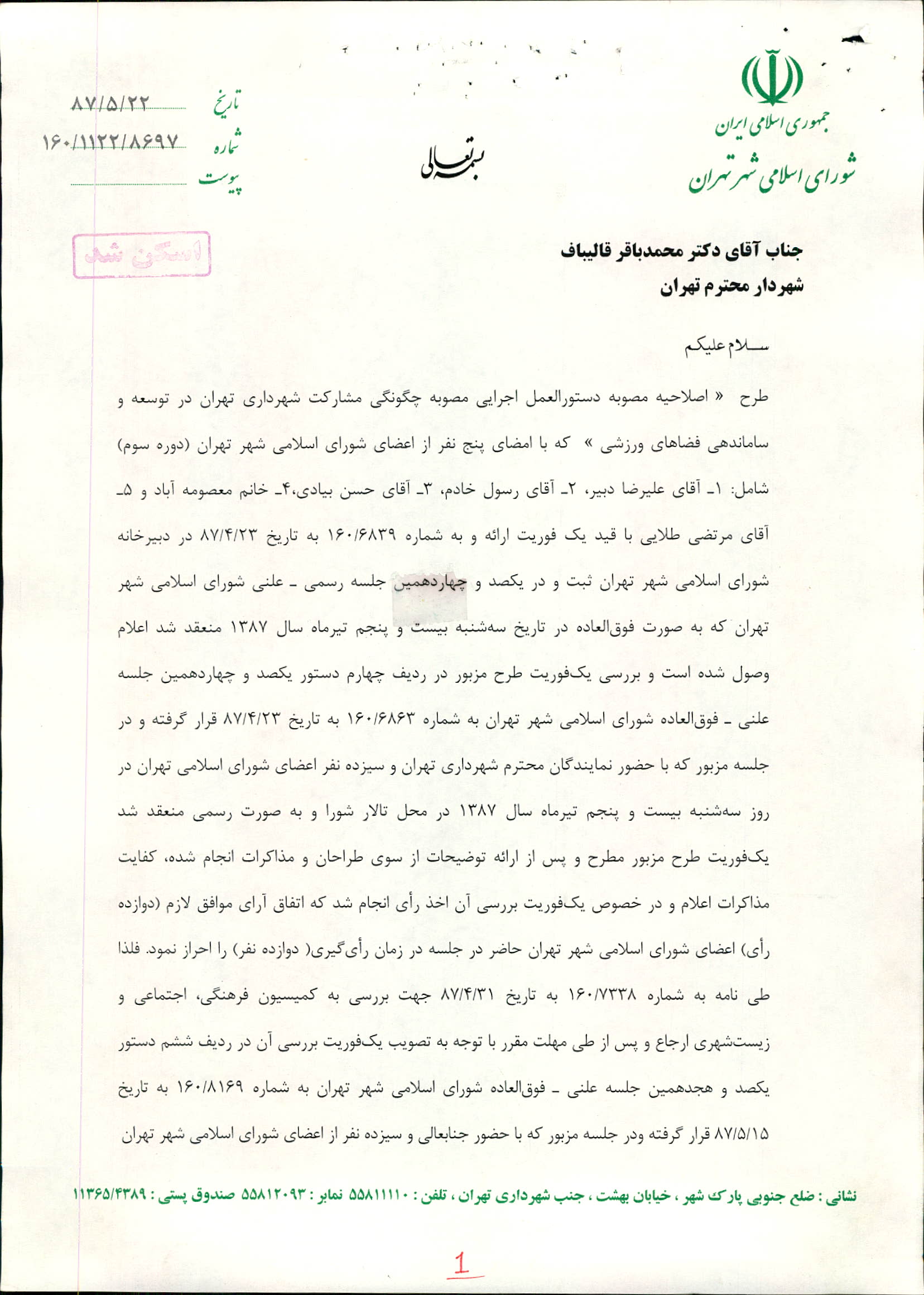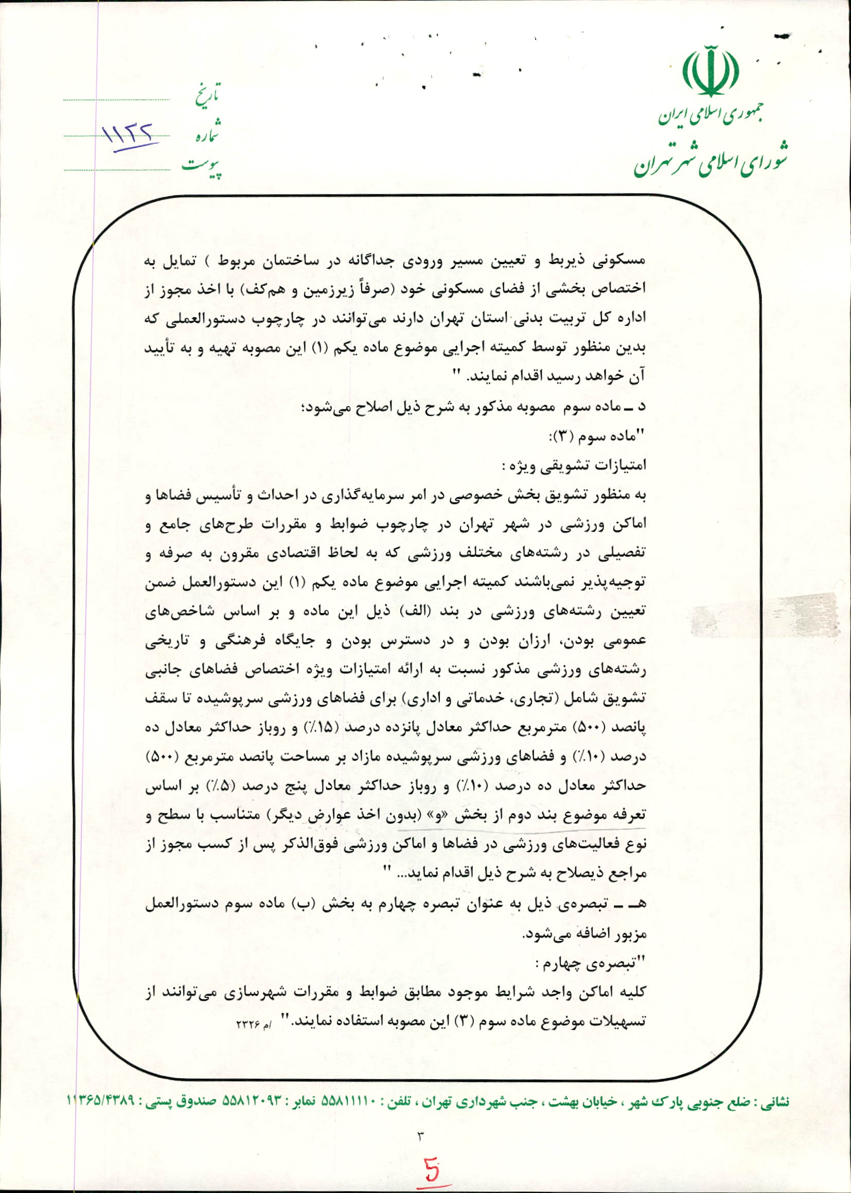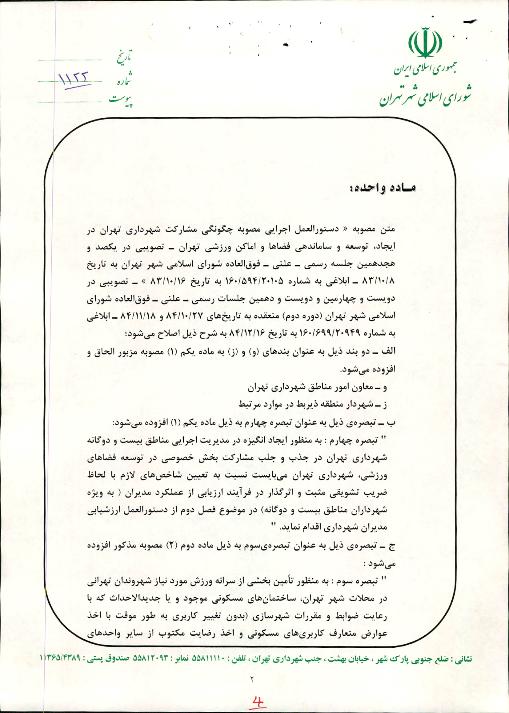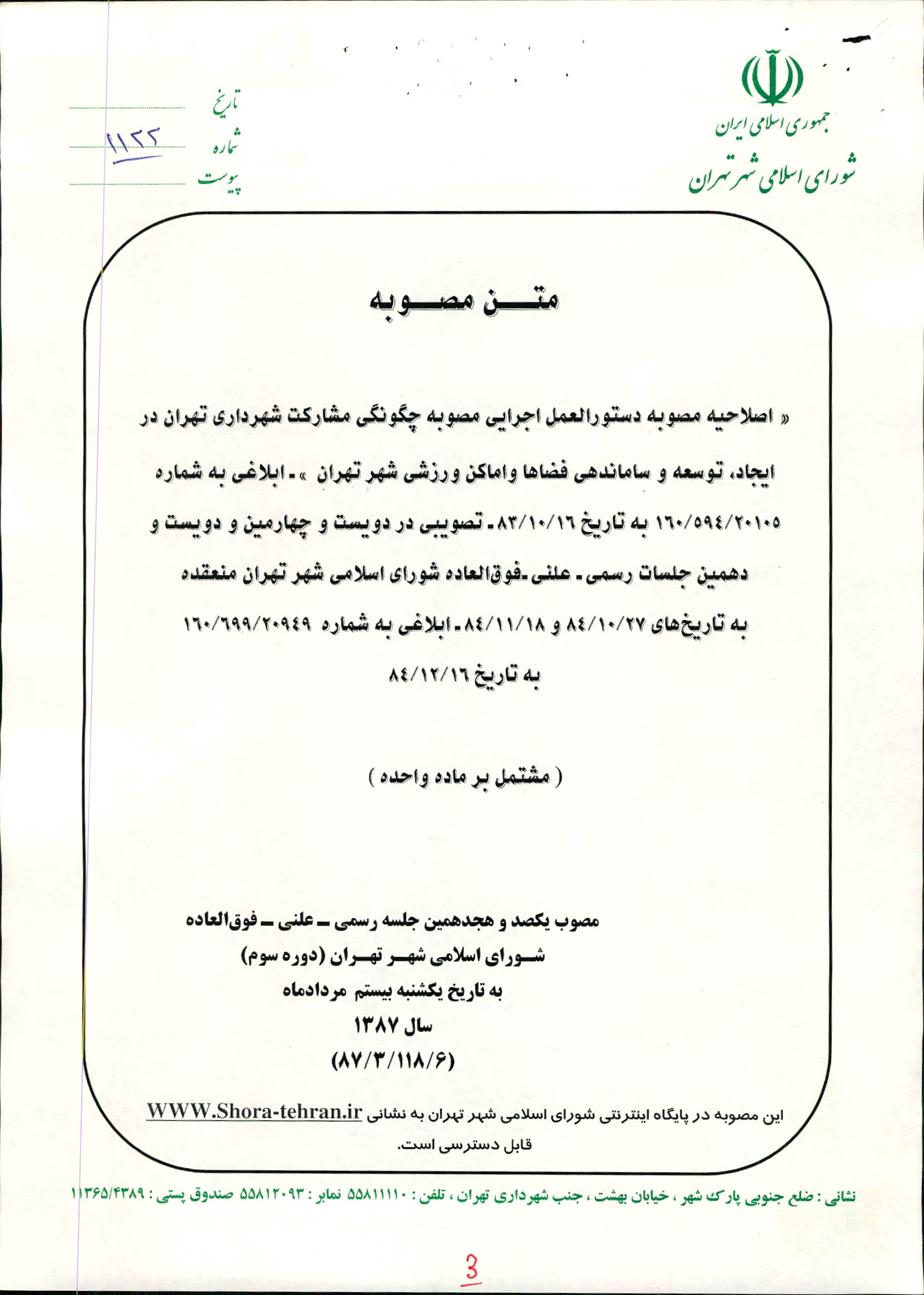 اصلاحیه مصوبه «دستورالعمل اجرایی مصوبه چگونگی مشارکت شهرداری تهران در ایجاد، توسعه و ساماندهی فضاها و اماکن ورزشی شهر تهران» ابلاغی به شماره 160/699/20949 به تاریخ 84/12/16