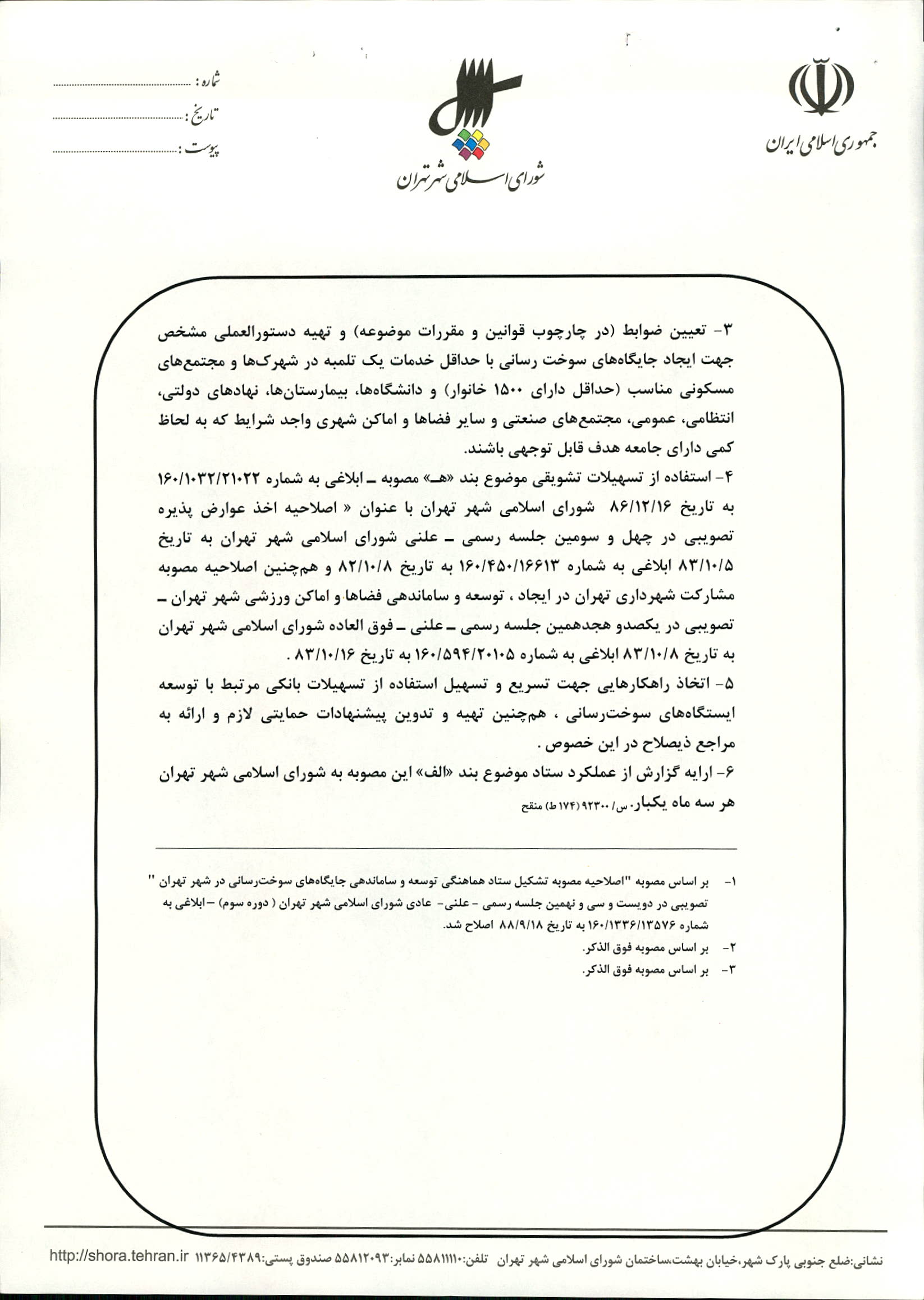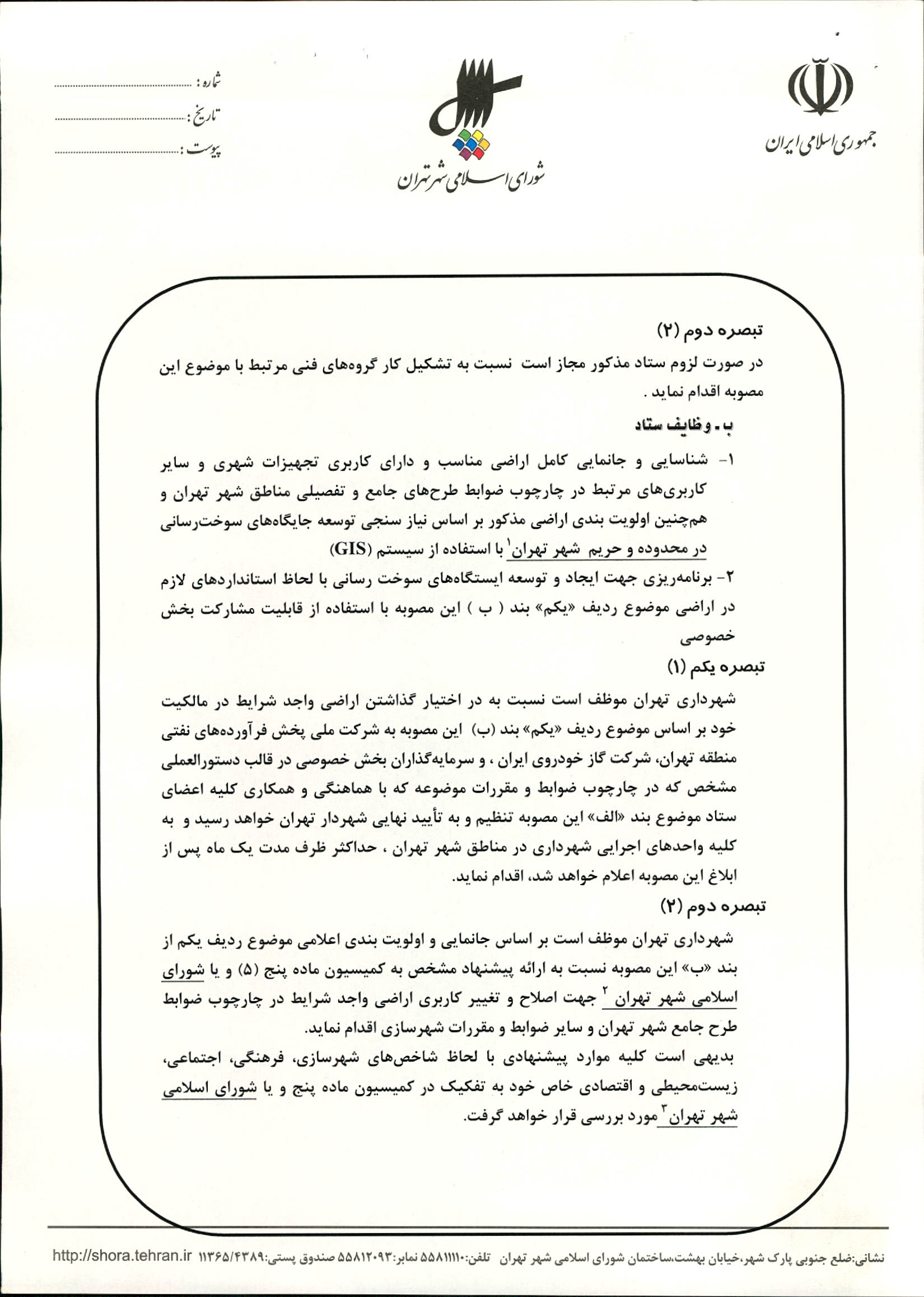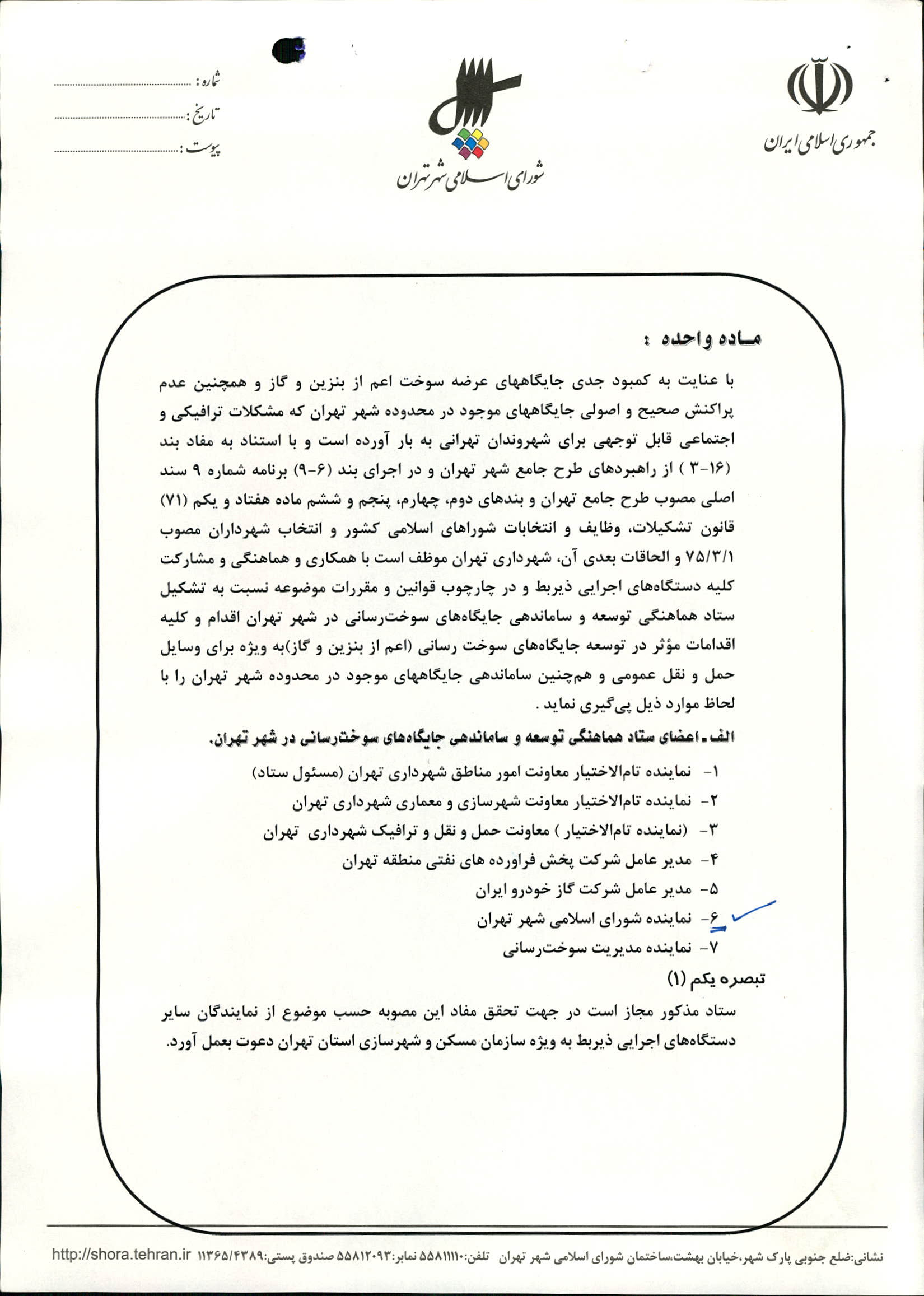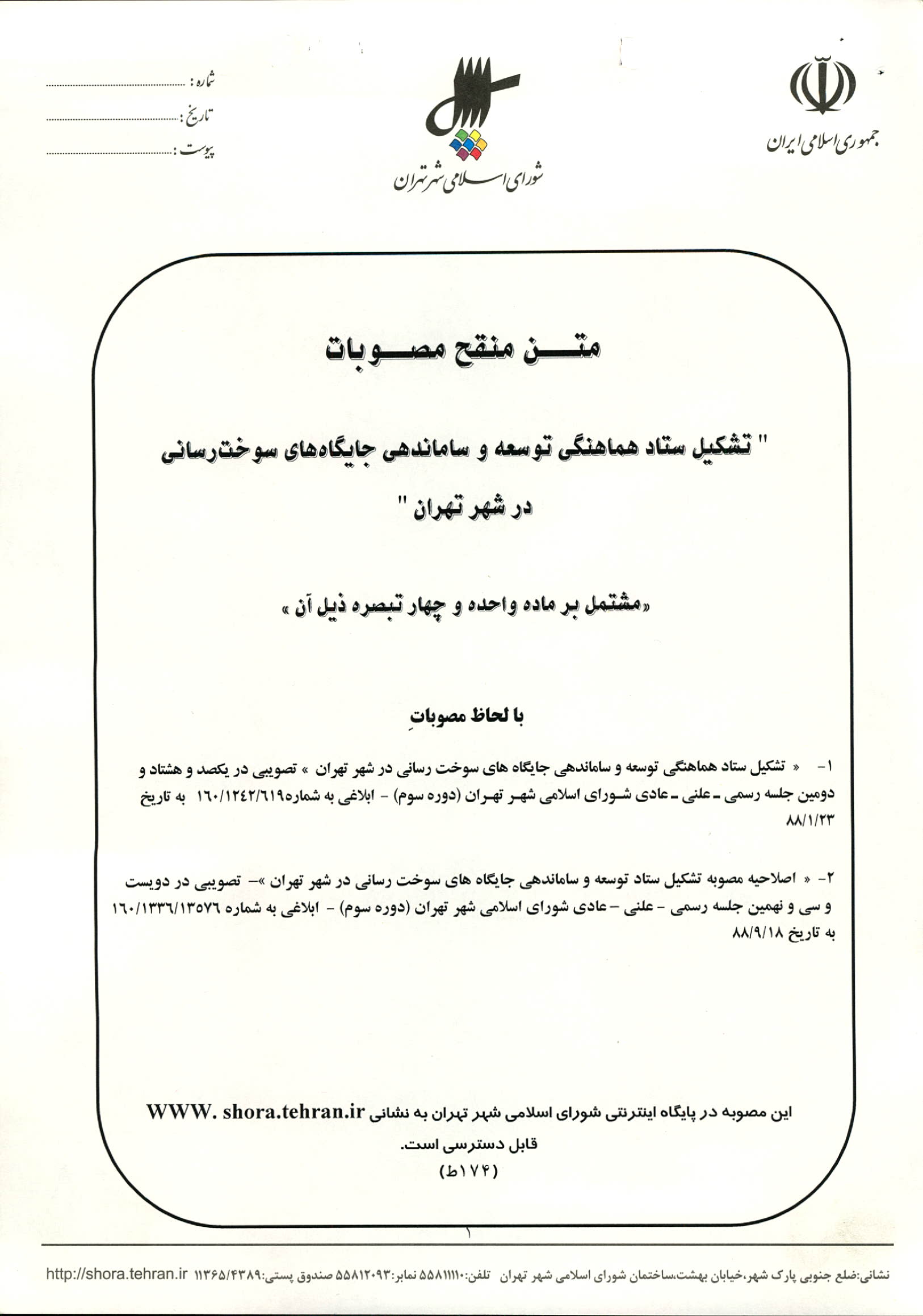 متن منقح مصوبات "تشکیل ستاد هماهنگی توسعه و ساماندهی جایگاههای سوخترسانی در شهر تهران"