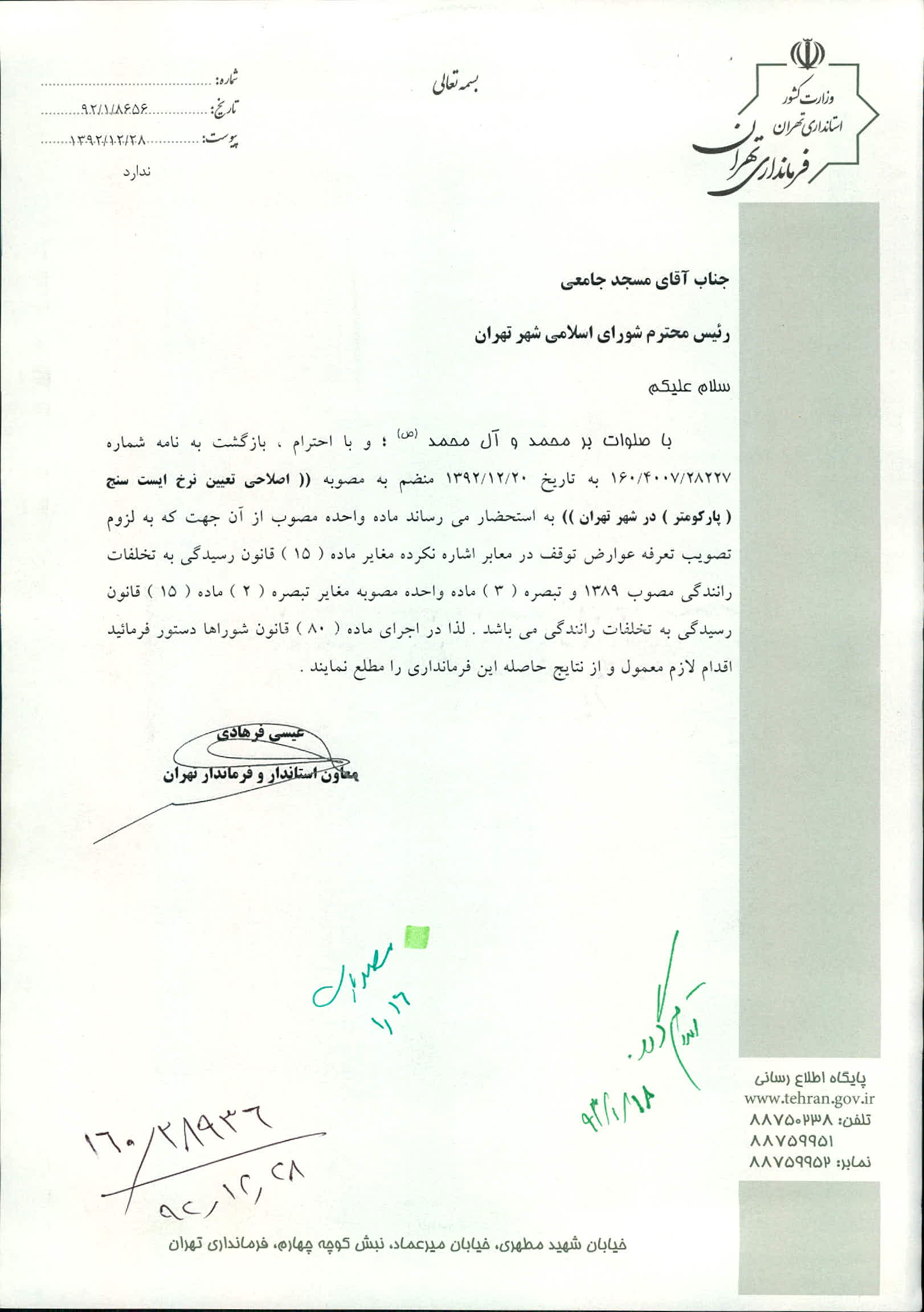 متن منقح مصوبه تعیین میزان حق توقف وسایط نقلیه شهروندان در معابر دارای ایستسنج (پارکومتر) تهران