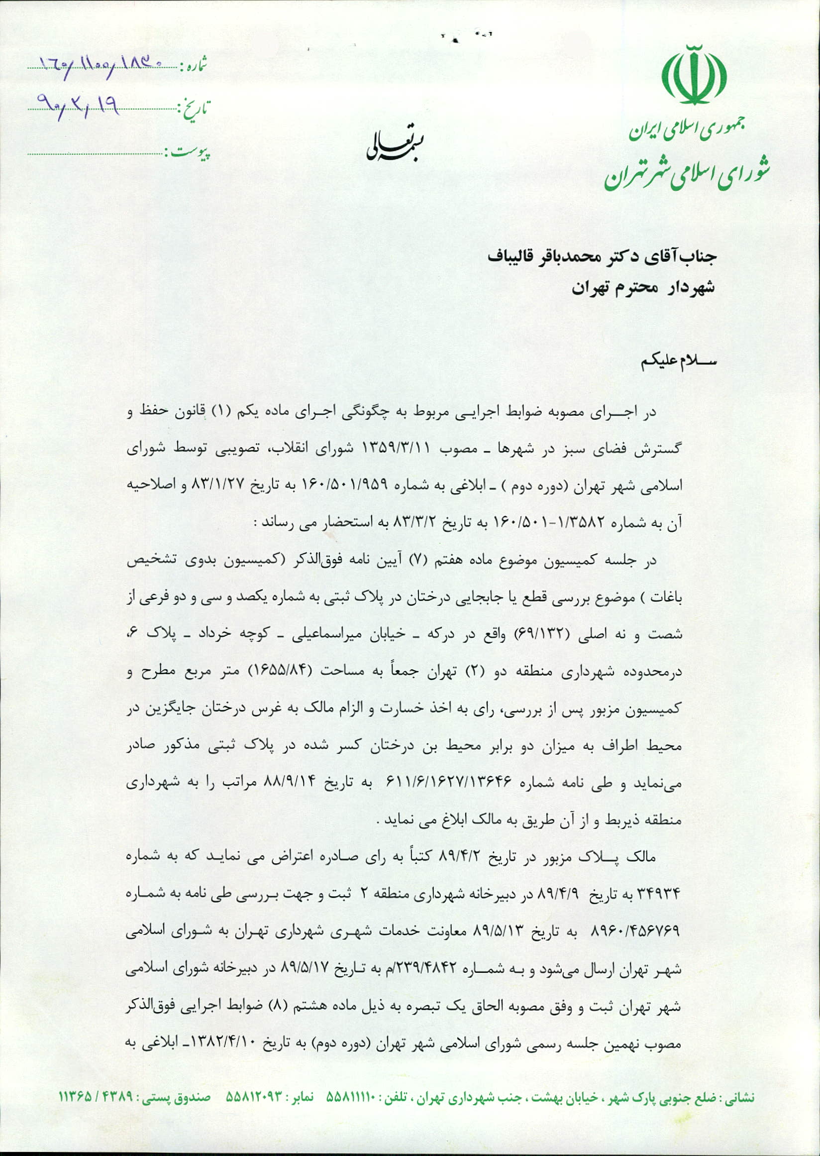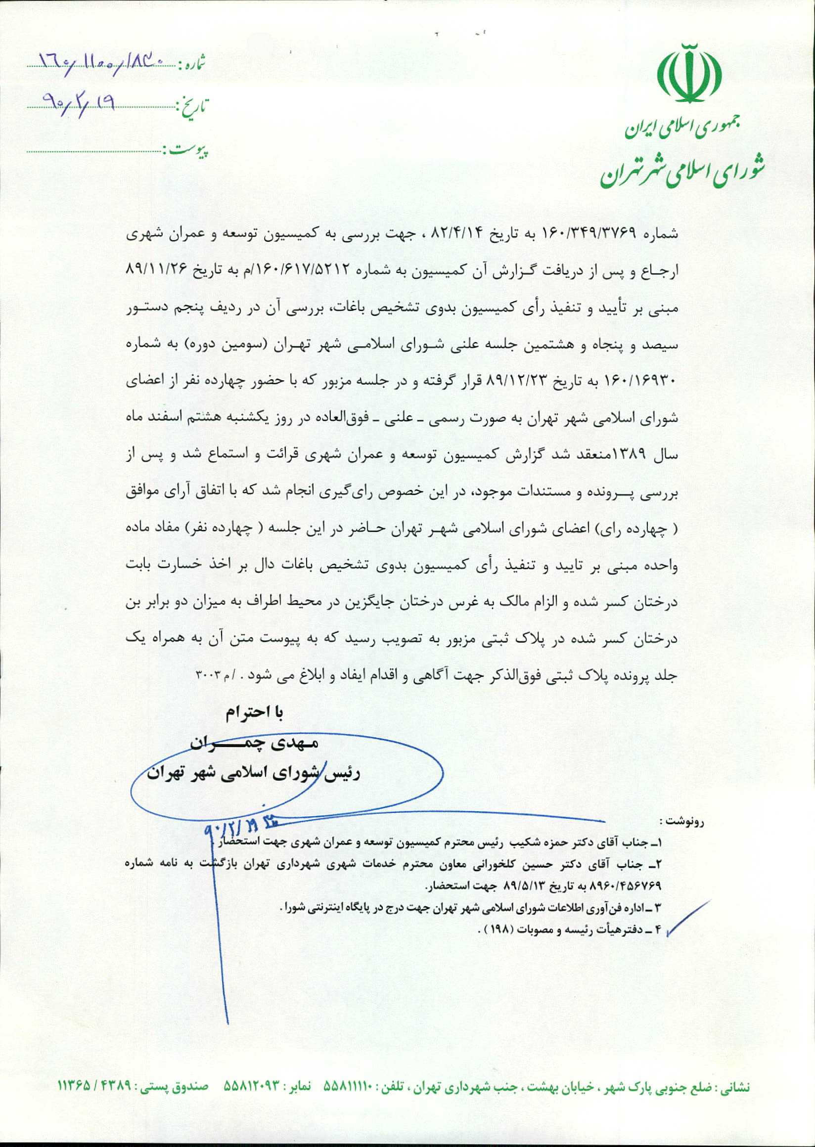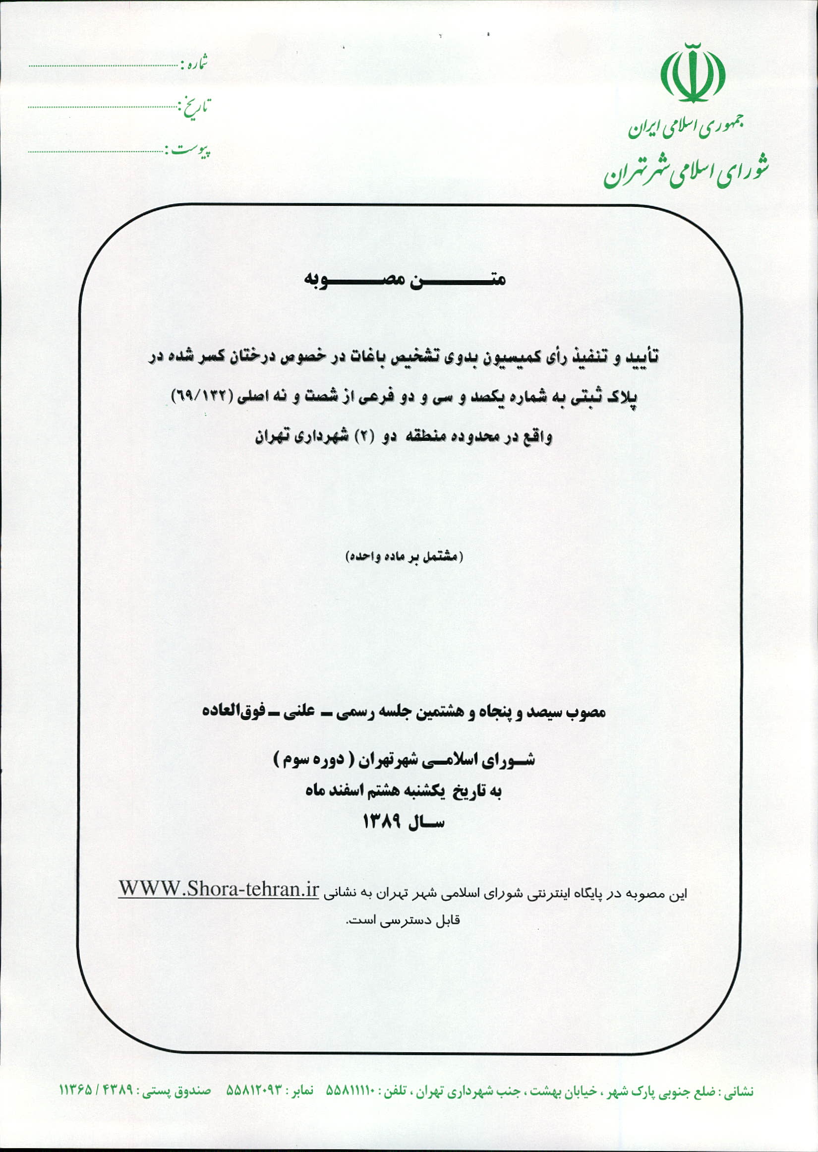 تأييد و تنفيذ رأي كميسيون بدوي تشخيص باغات در خصوص درختان كسر شده در پلاك ثبتي به شماره يكصد و سي و دو فرعي از شصت و نه اصلي (69/132) واقع در محدوده منطقه دو (2) شهرداري تهران