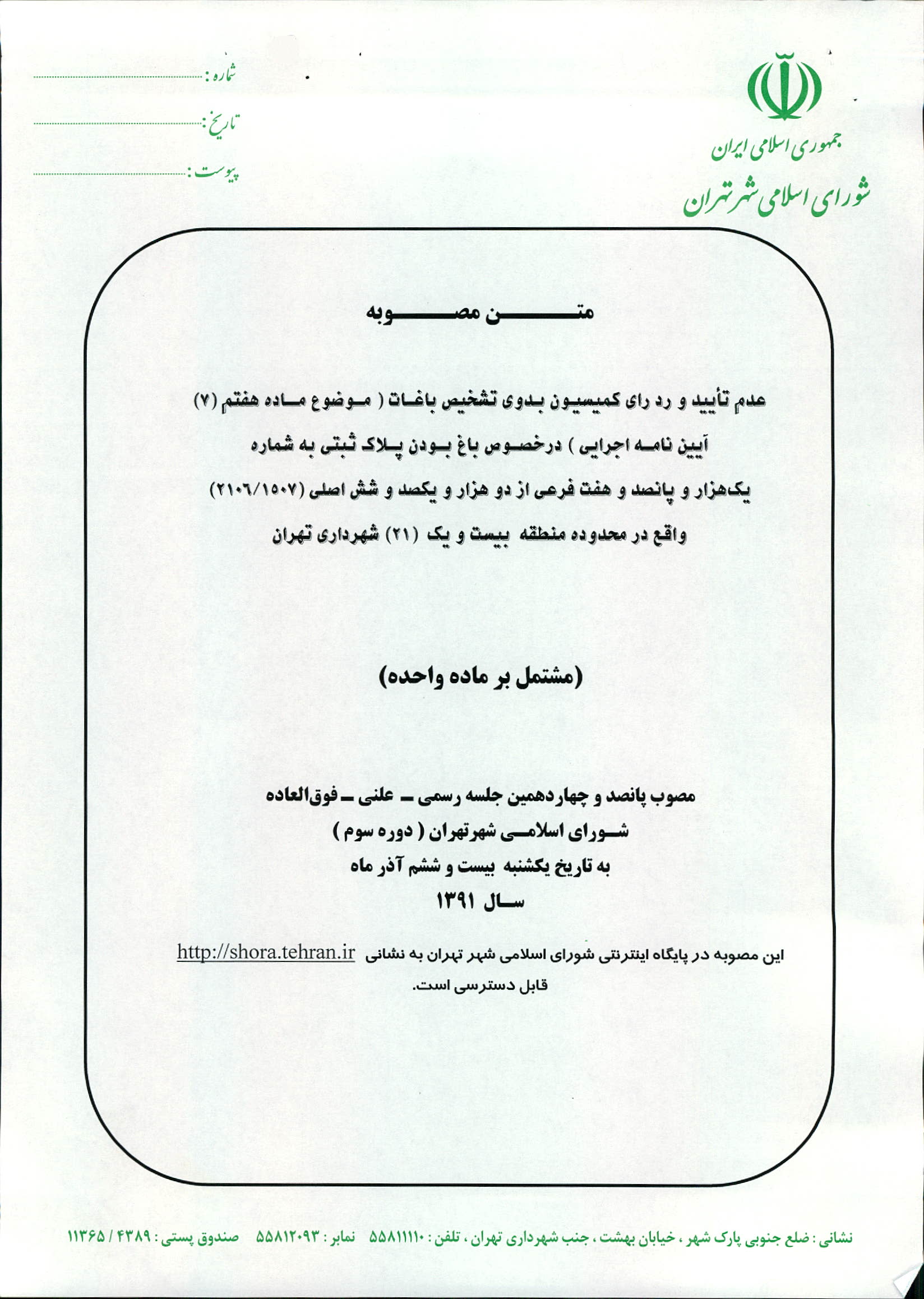 عدم تأیید و رد رأی کمیسیون بدوی تشخیص باغات (موضوع ماده هفتم (7) آییننامه اجرایی) در خصوص باغ بودن پلاک ثبتی به شماره یک هزار و پانصد و هفت فرعی از دو هزار و یکصد و شش اصلی (2106/1507) واقع در محدوده منطقه بیست و یک (21) شهرداری تهران