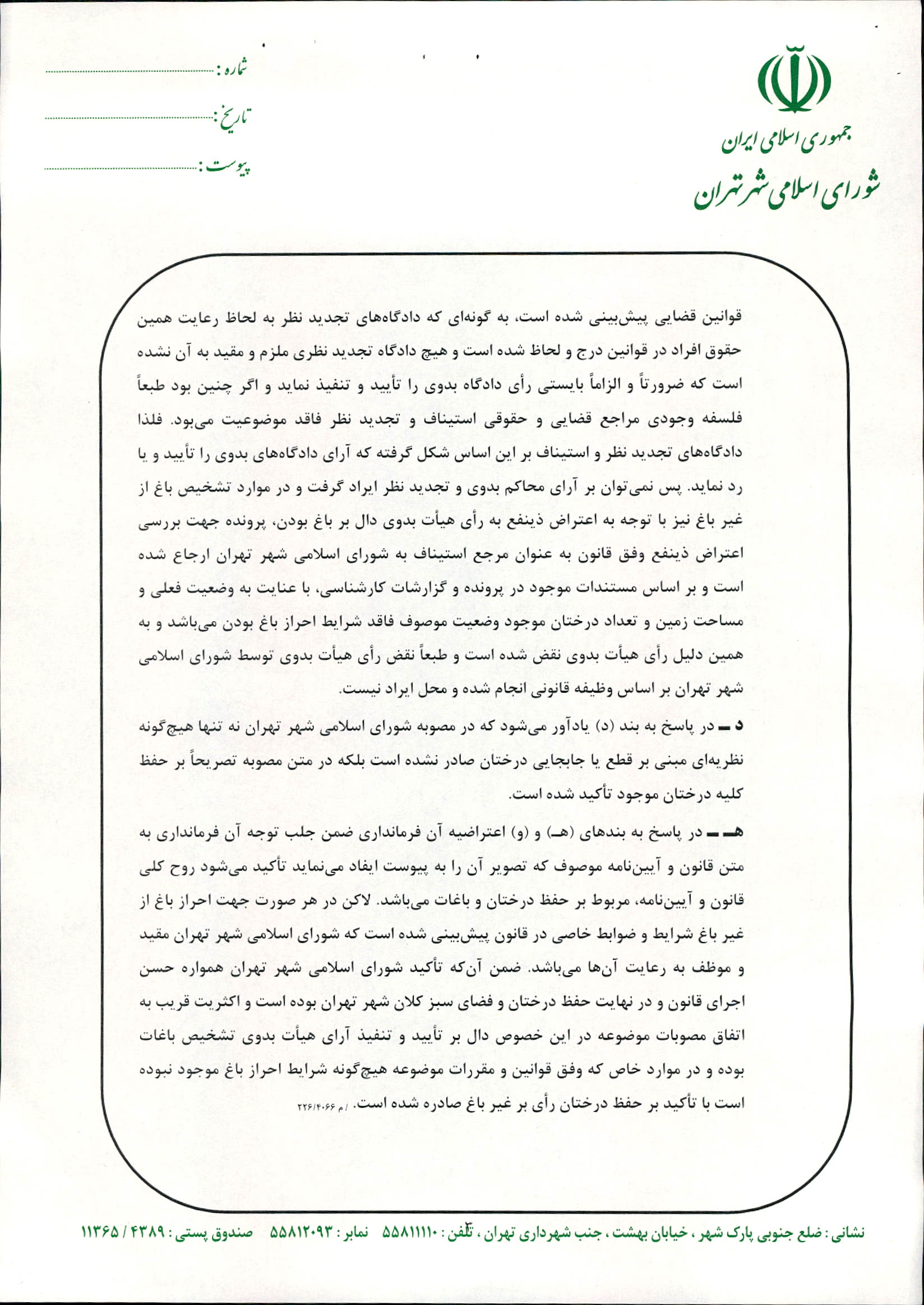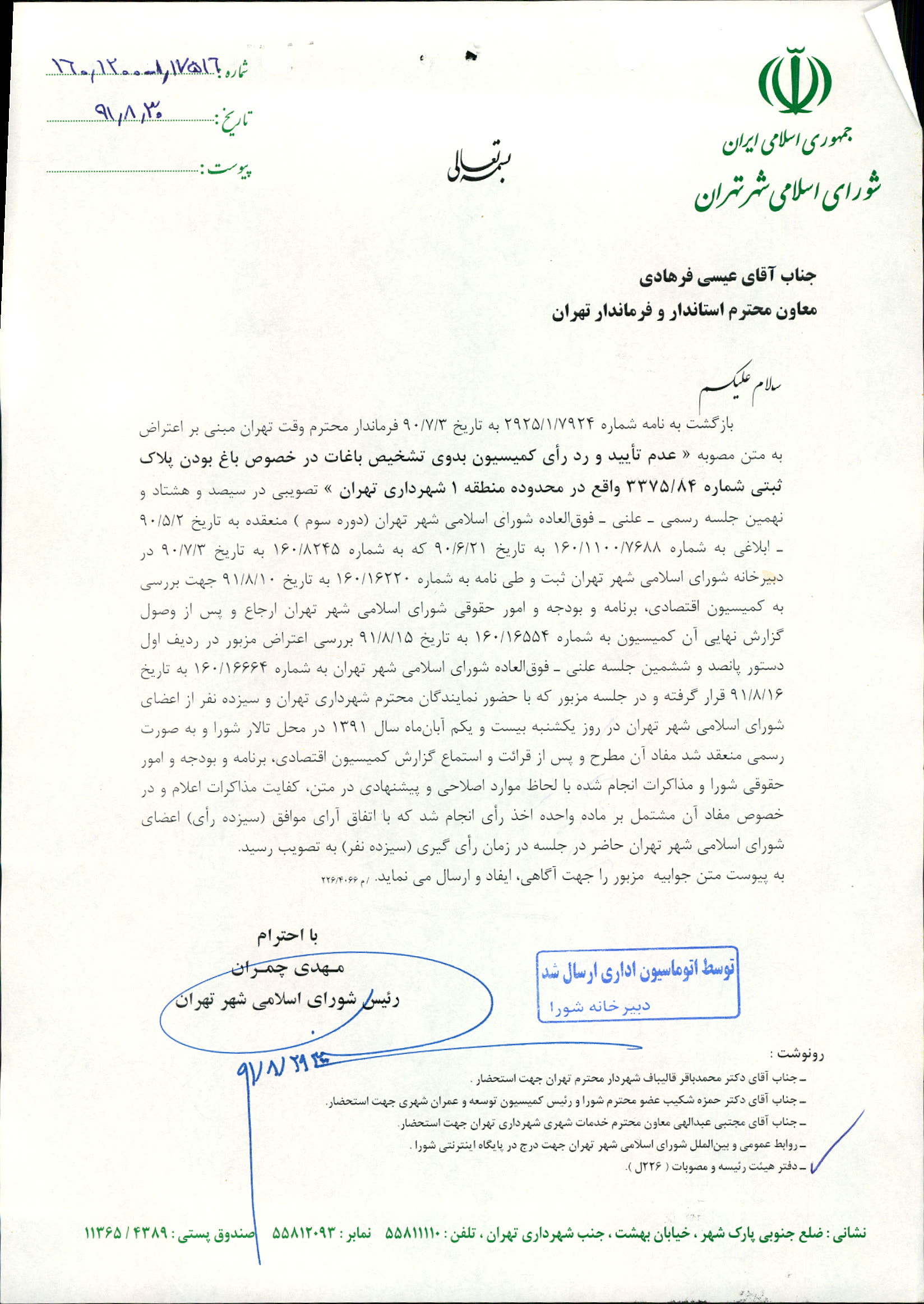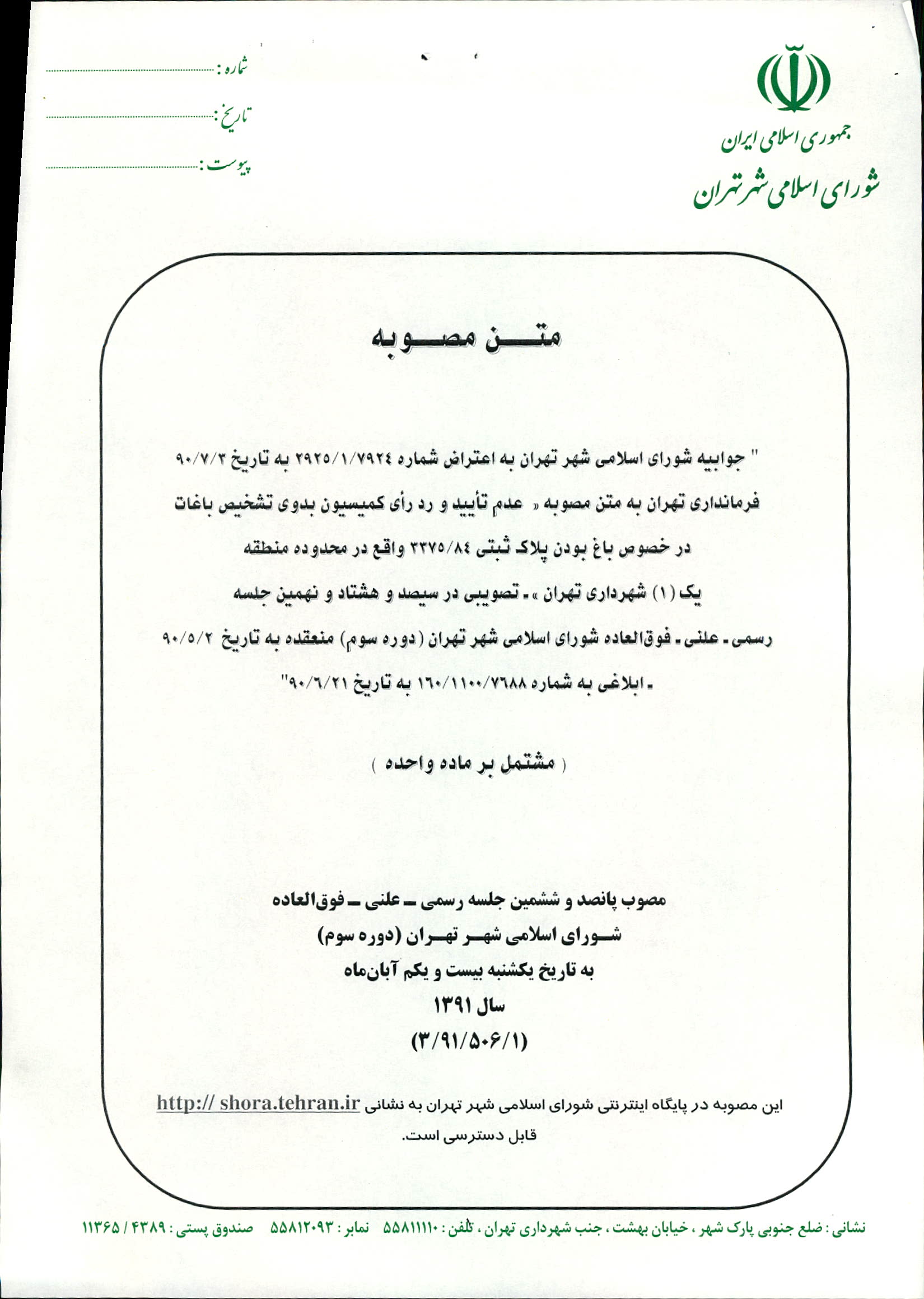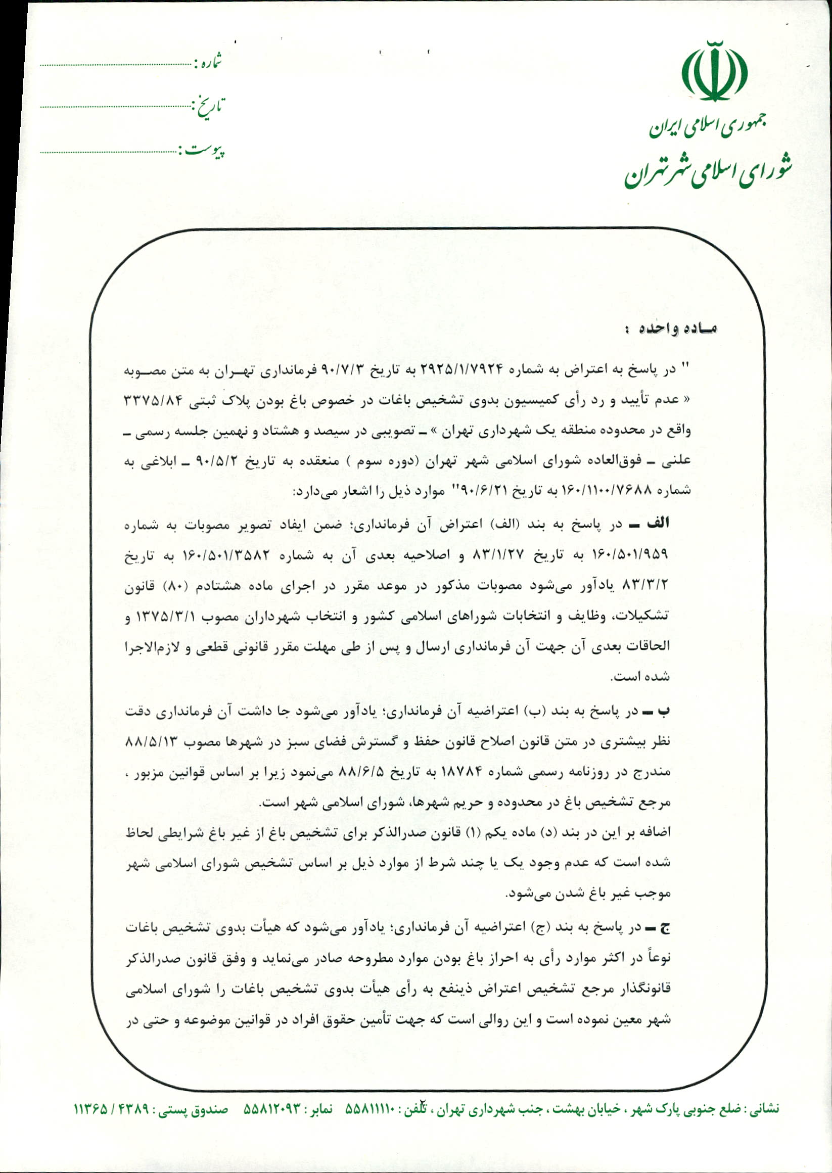 جوابيه شوراي اسلامي شهر تهران به اعتراض شماره 2925/1/7924 به تاريخ 90/7/3 فرمانداري تهران به متن مصوبه «عدم تأييد و رد رأي كميسيون بدوي تشخيص باغات در خصوص باغ بودن پلاك‌ ثبتي 3375/84 واقع در محدوده منطقه يك (1) شهرداري تهران»ـ تصويبي در سيصد و هشتاد و نهمين جلسه رسمي ـ علني ـ فوق‌العاده شوراي اسلامي شهر تهران (دوره سوم) منعقده به تاريخ 90/5/2 ـ ابلاغي به شماره 160/1100/7688 به تاريخ 90/6/21